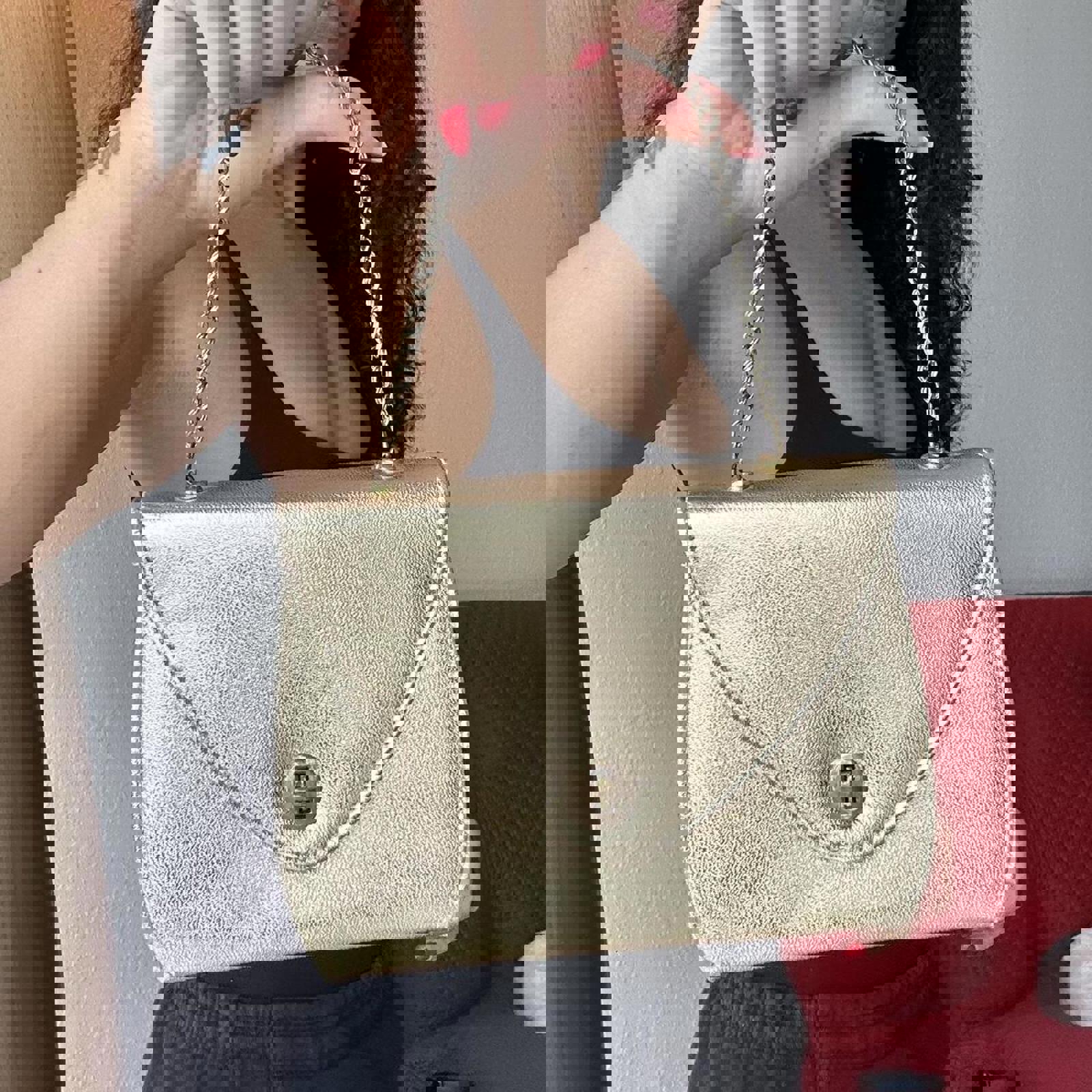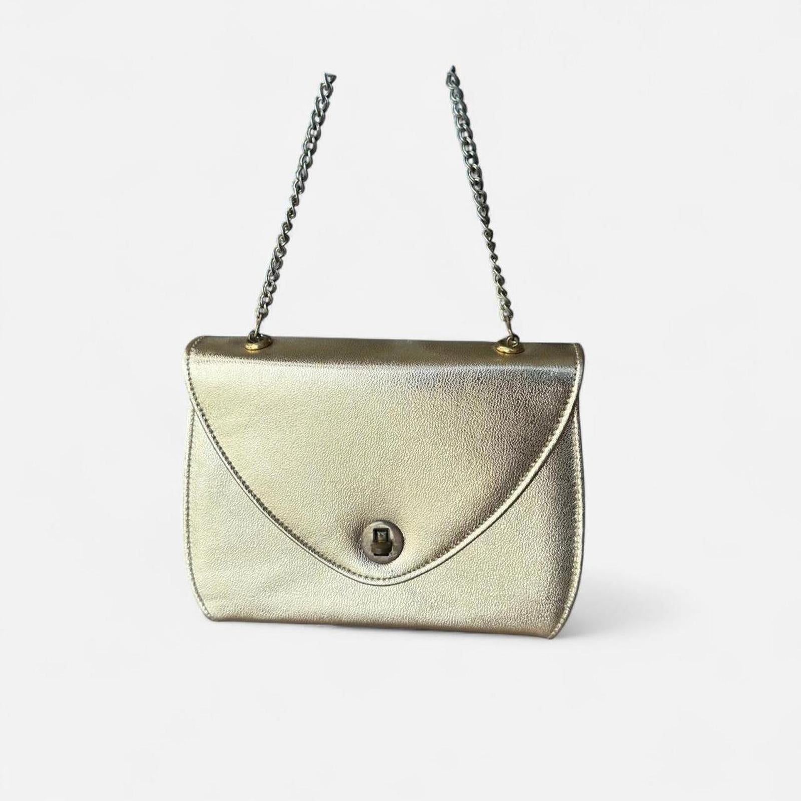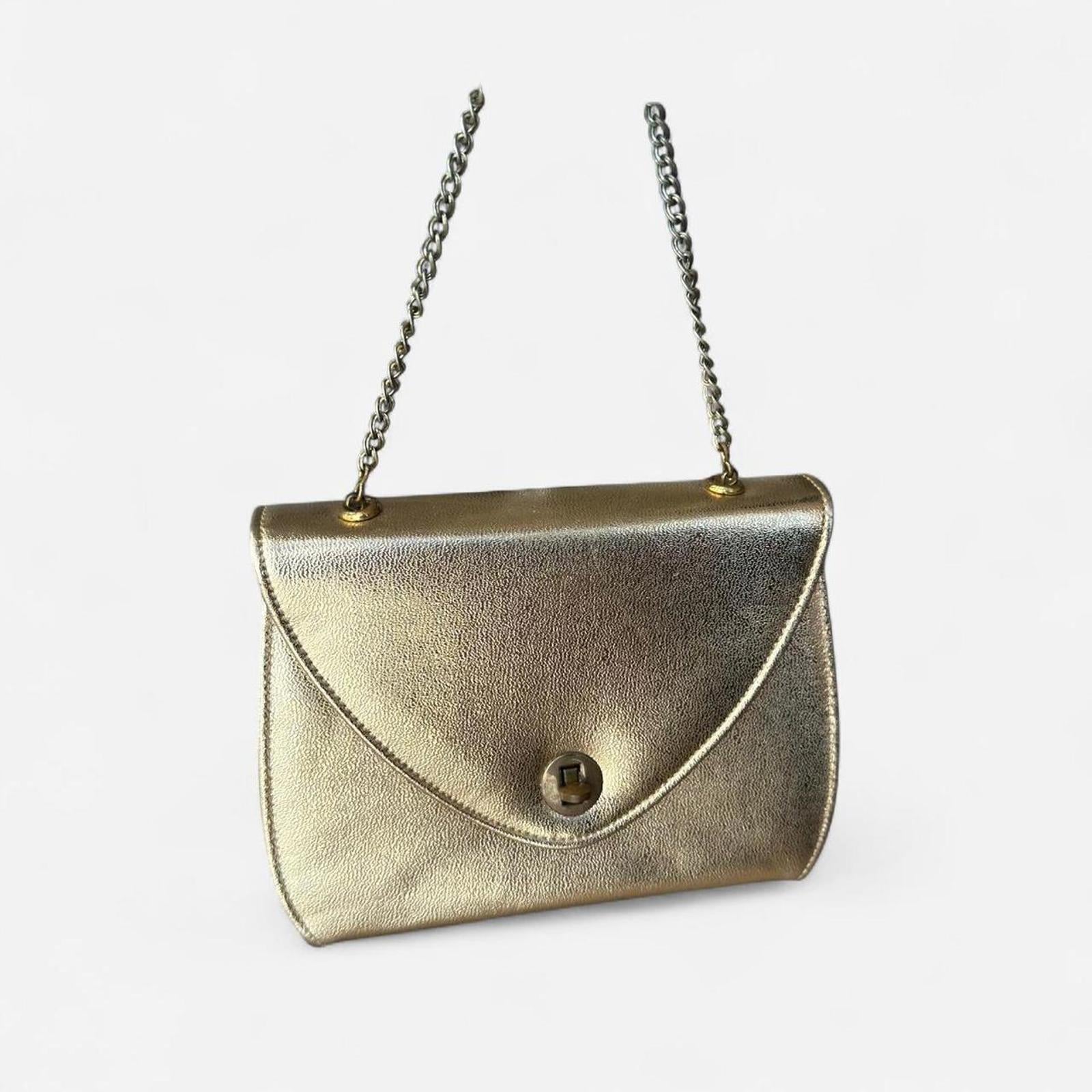Gold evening bag. True vintage in perfect condition. Hardware is a little tarnished. Measurements listed below. With 6 inches length, 4.5 inches width, and 2.5 inches depth.