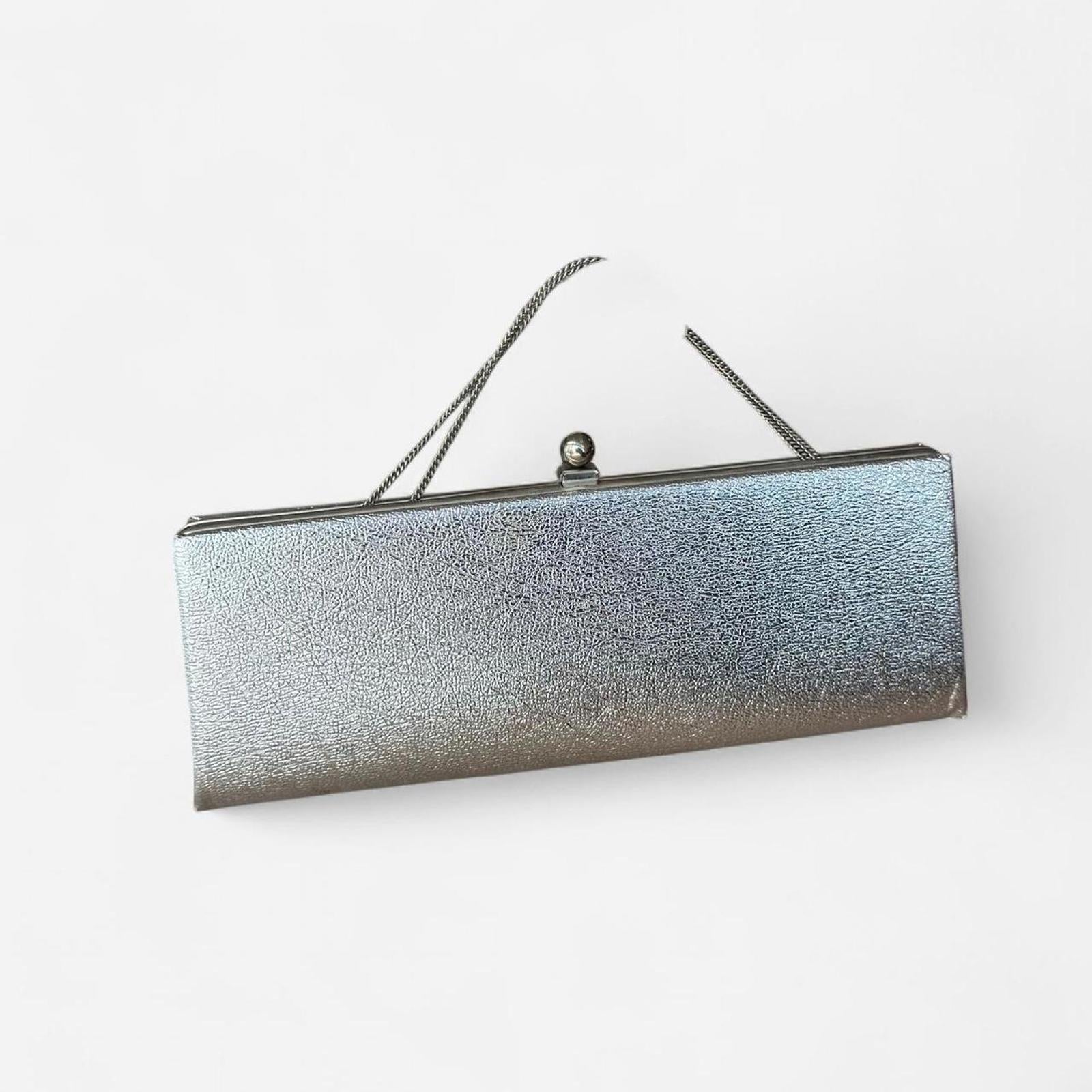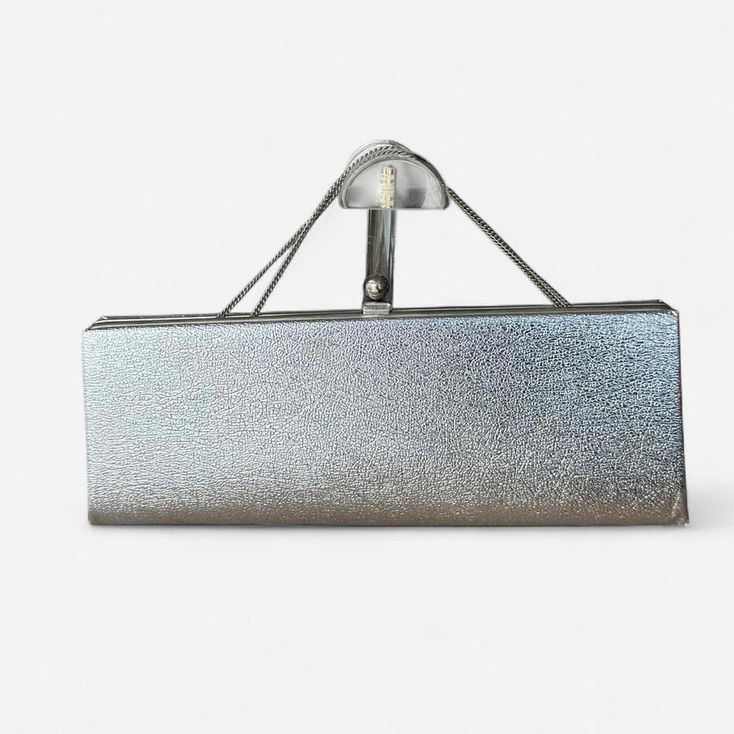 Vintage silver large clutch in amazing condition. Has a tiny strap that you can use to hold it or you can just use it as a clutch. Some staining inside but very minimal. Decent vintage condition. Measurements listed below.