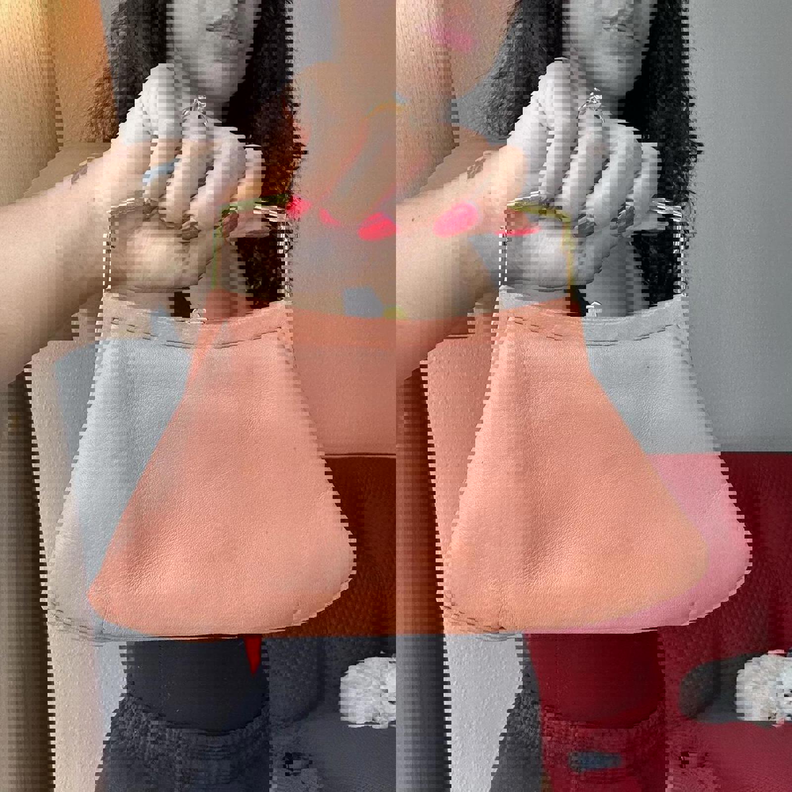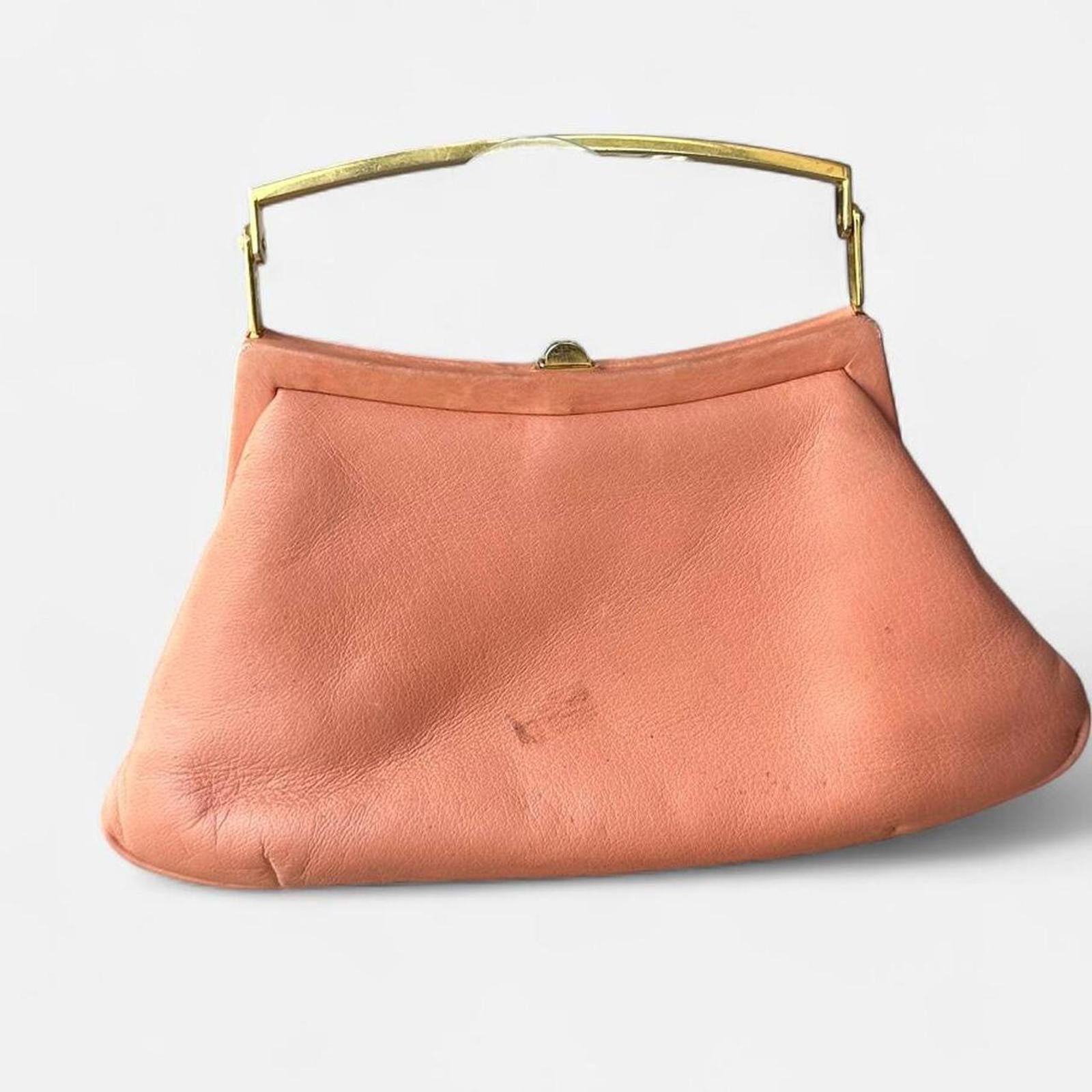 peach handbag, vintage clutch, gold hardware, small stain, compact purse, soft satin, retro style, evening bag, classic accessory, understated elegance