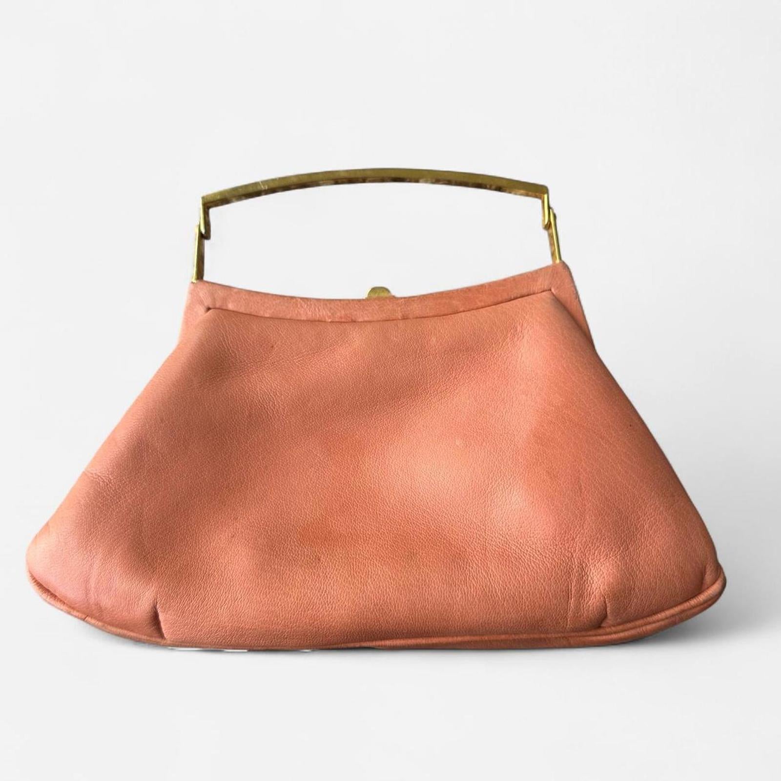 Peach color vintage handbag with gold hardware in good condition. Has one small stain, which is shown. Measurements listed below: