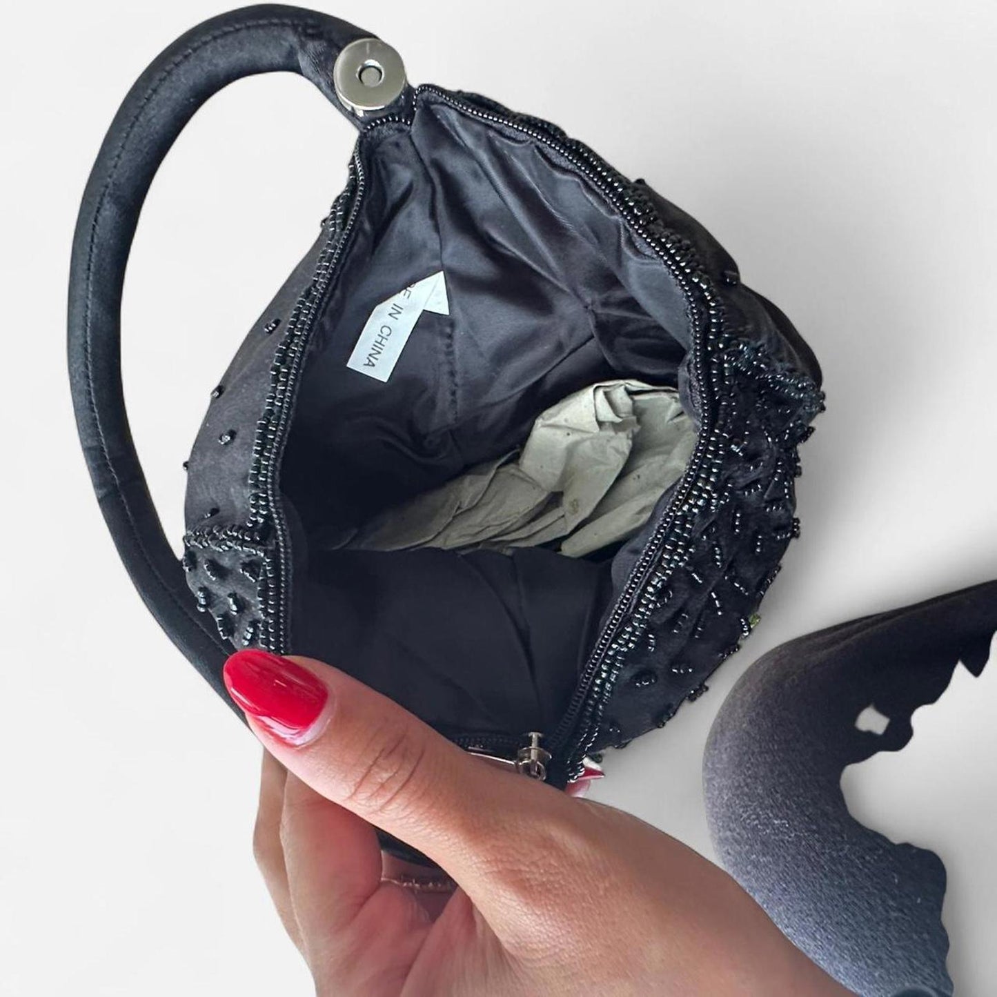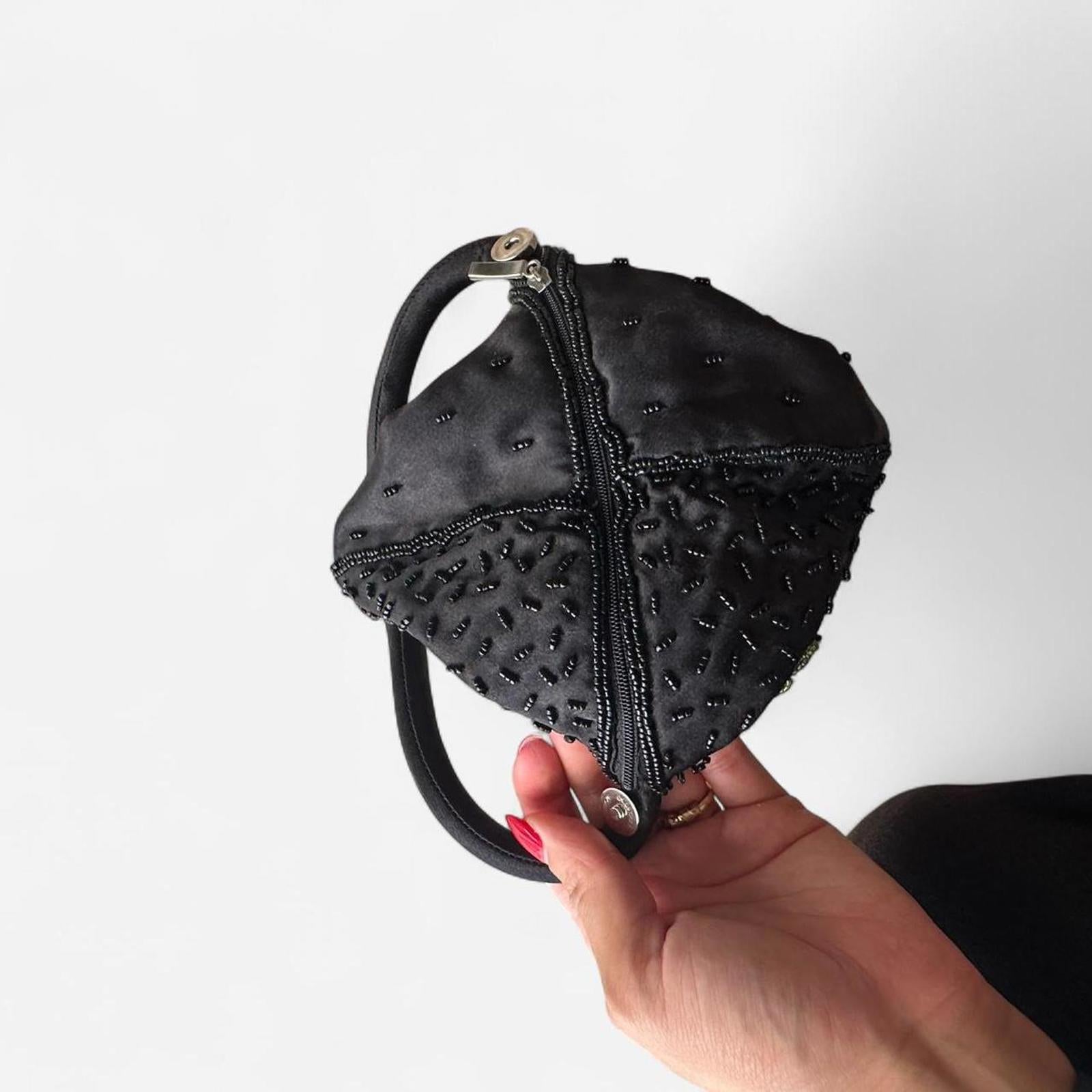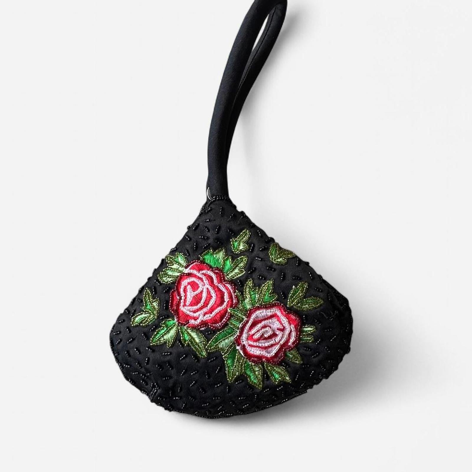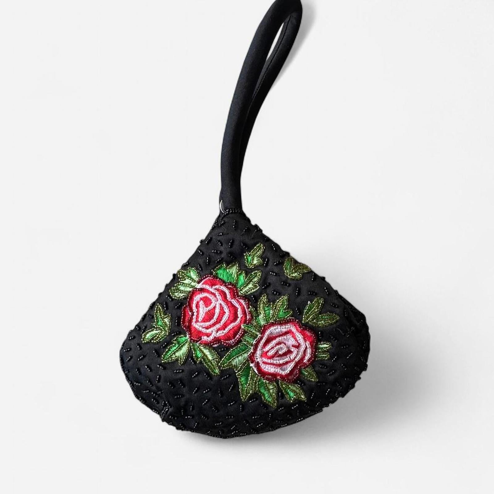embroidery, rose pattern, beaded detailing, vintage bag, bucket bag, floral accessory, convertible, handheld, collectible, perfect condition