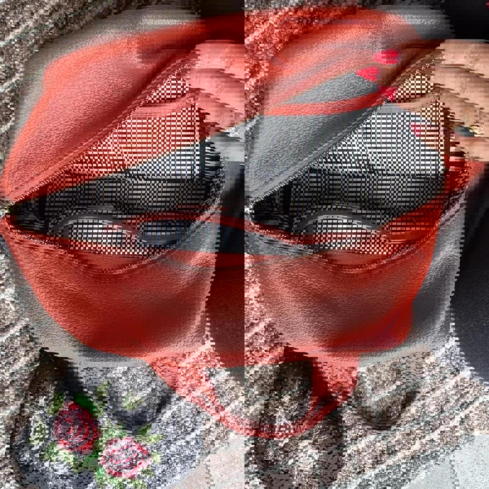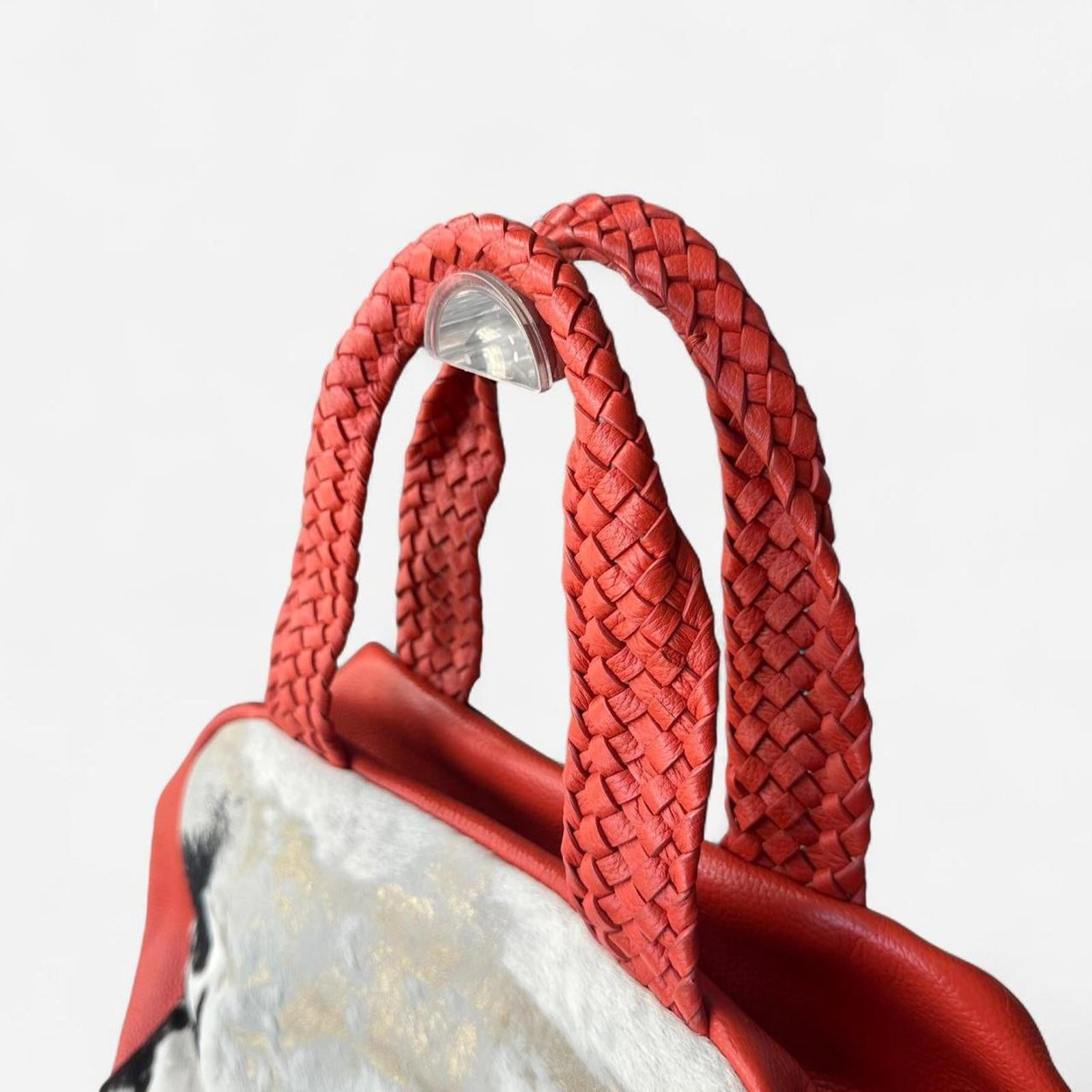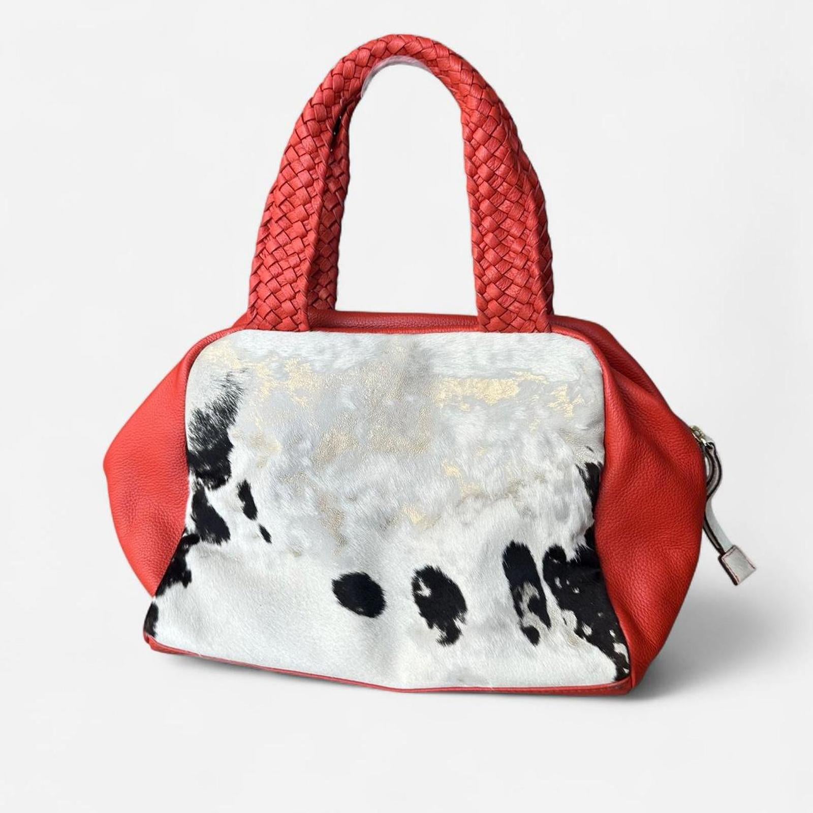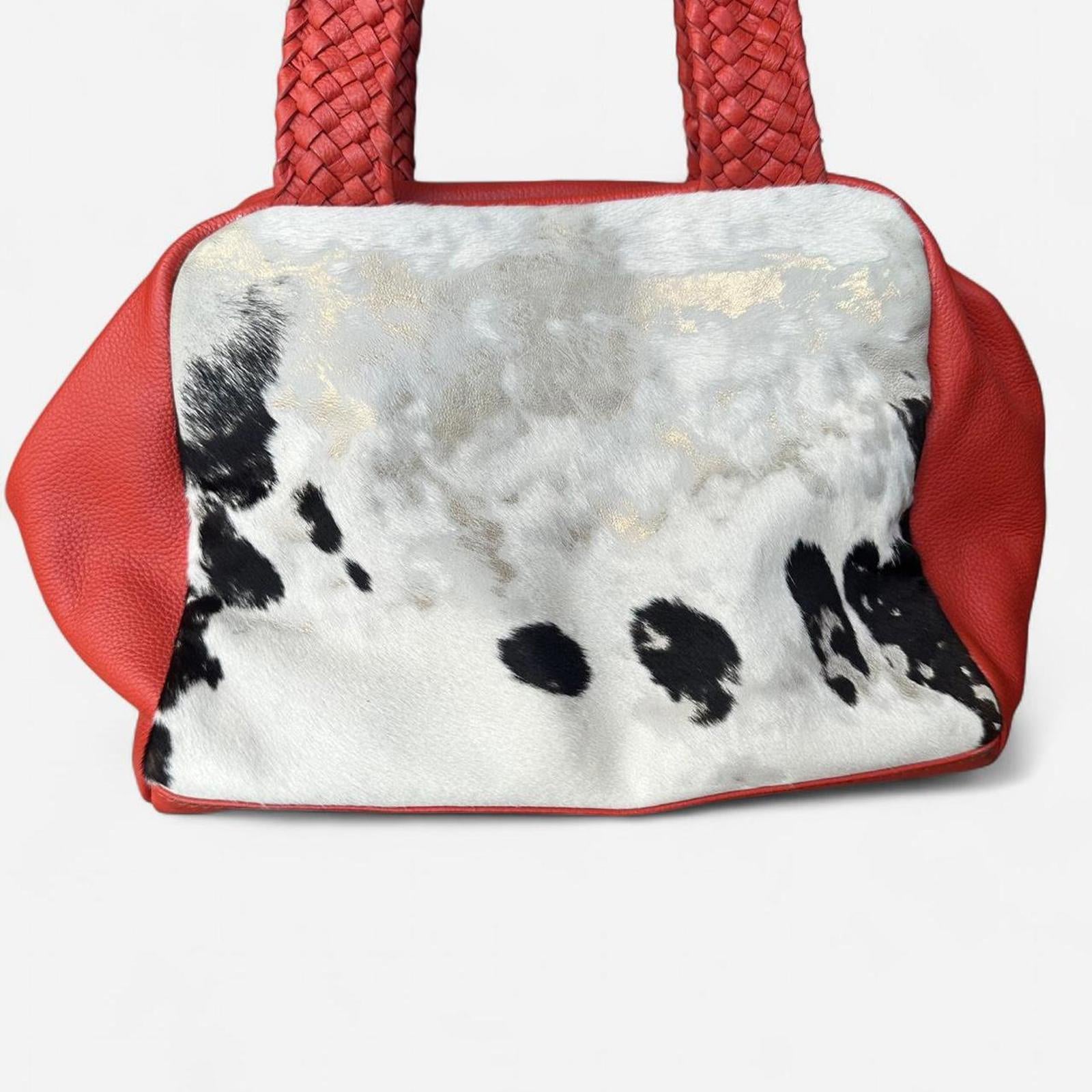 The most gorgeous cowhide bag with rust-colored leather accents and woven handles. In perfect condition, never been used. Measurements are listed below.