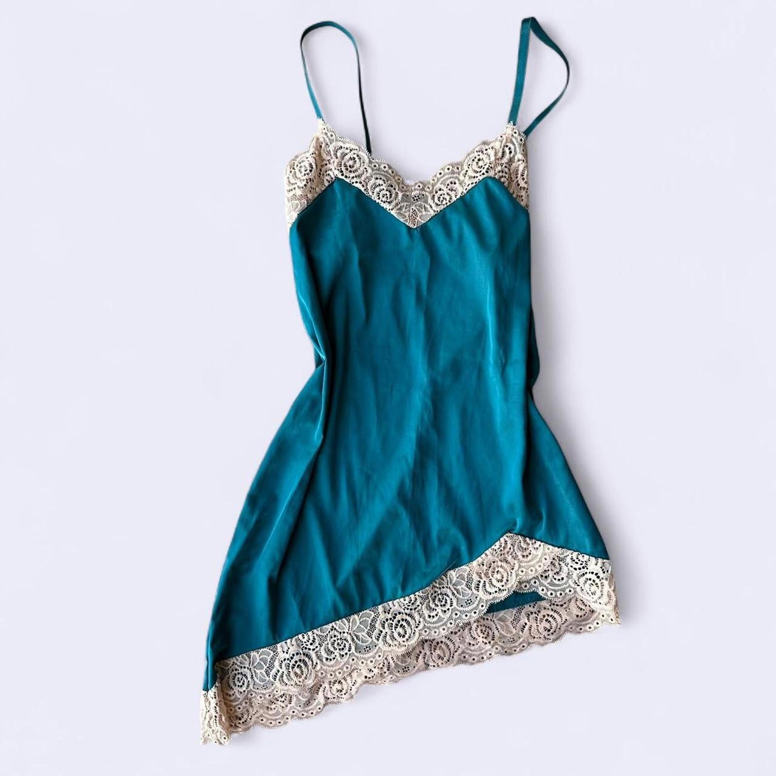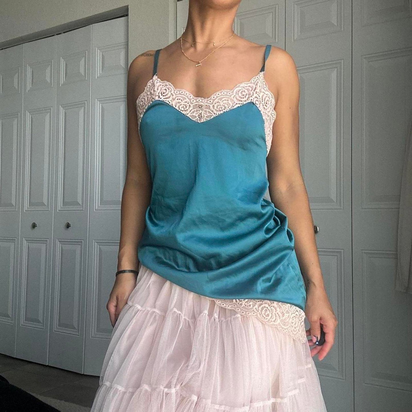 teal silk, pink lace, asymmetrical hem, satin slip, delicate lingerie, soft pastel, lightweight, feminine, elegant, bedroomwear