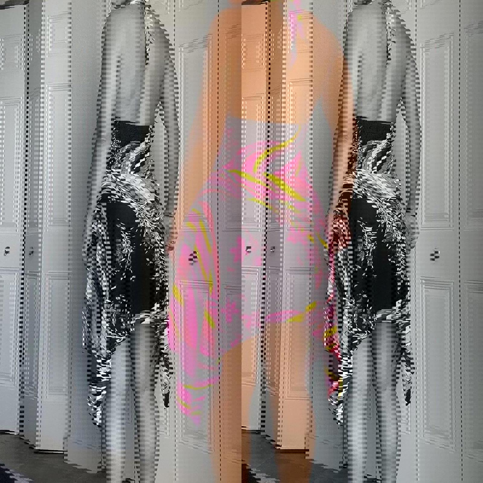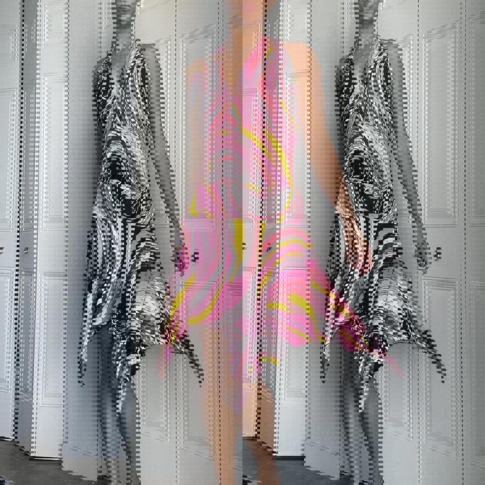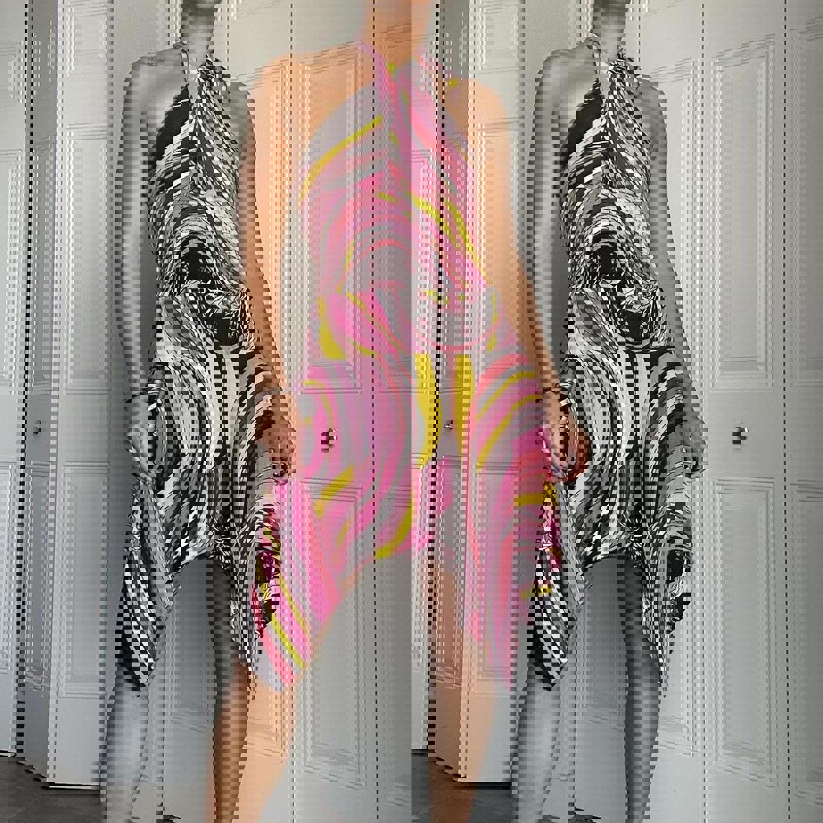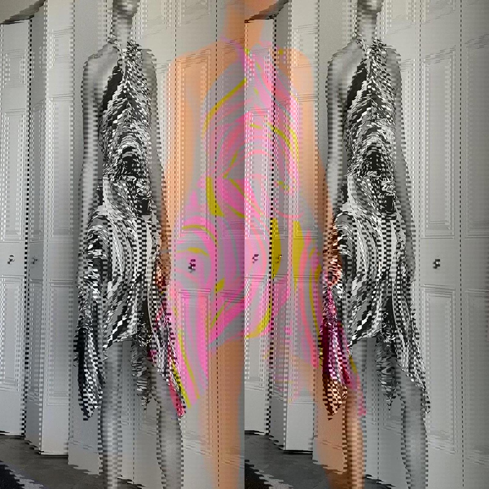 576. Pink and yellow halter dress with a flowy, asymmetrical design #festivalvibes gives pucci vibes