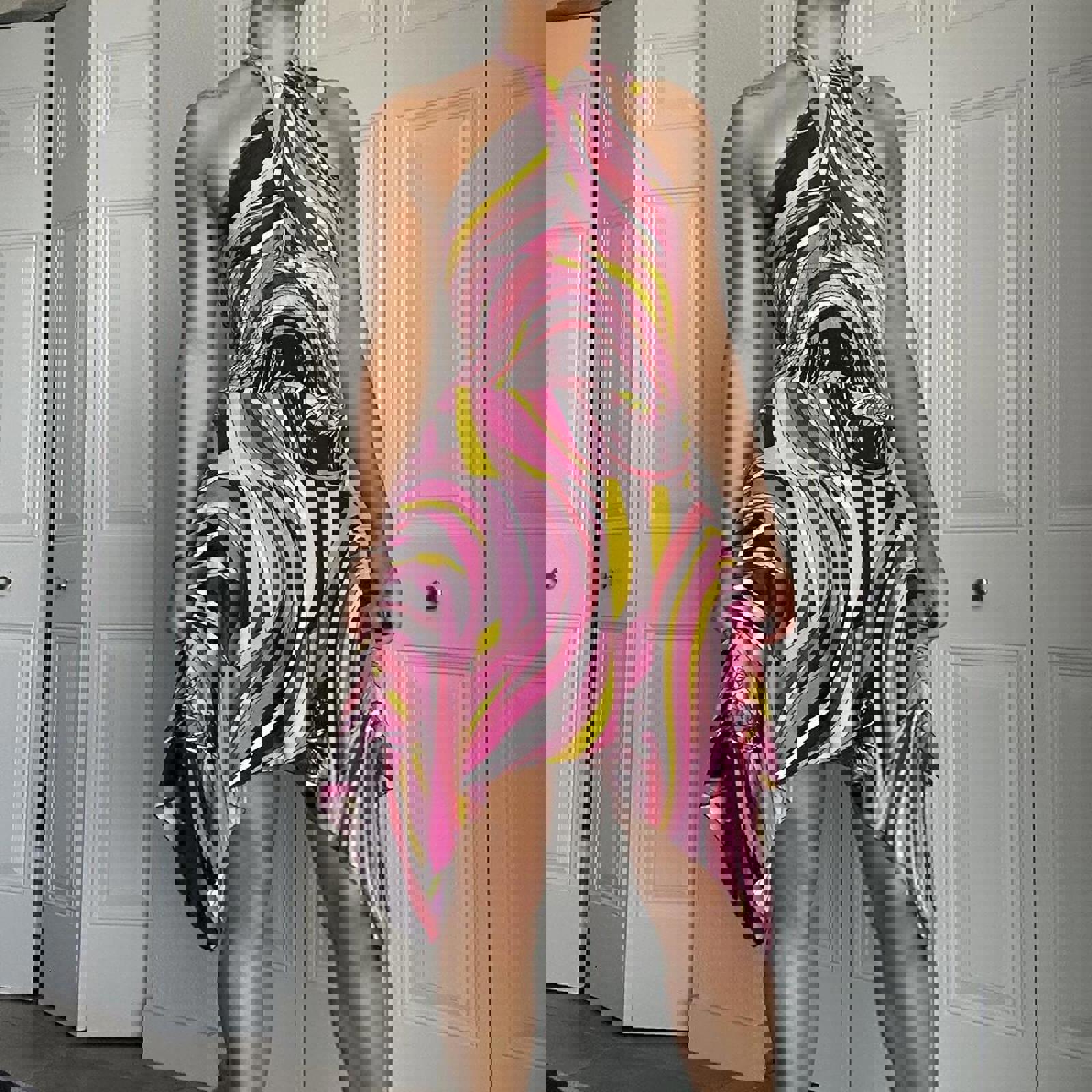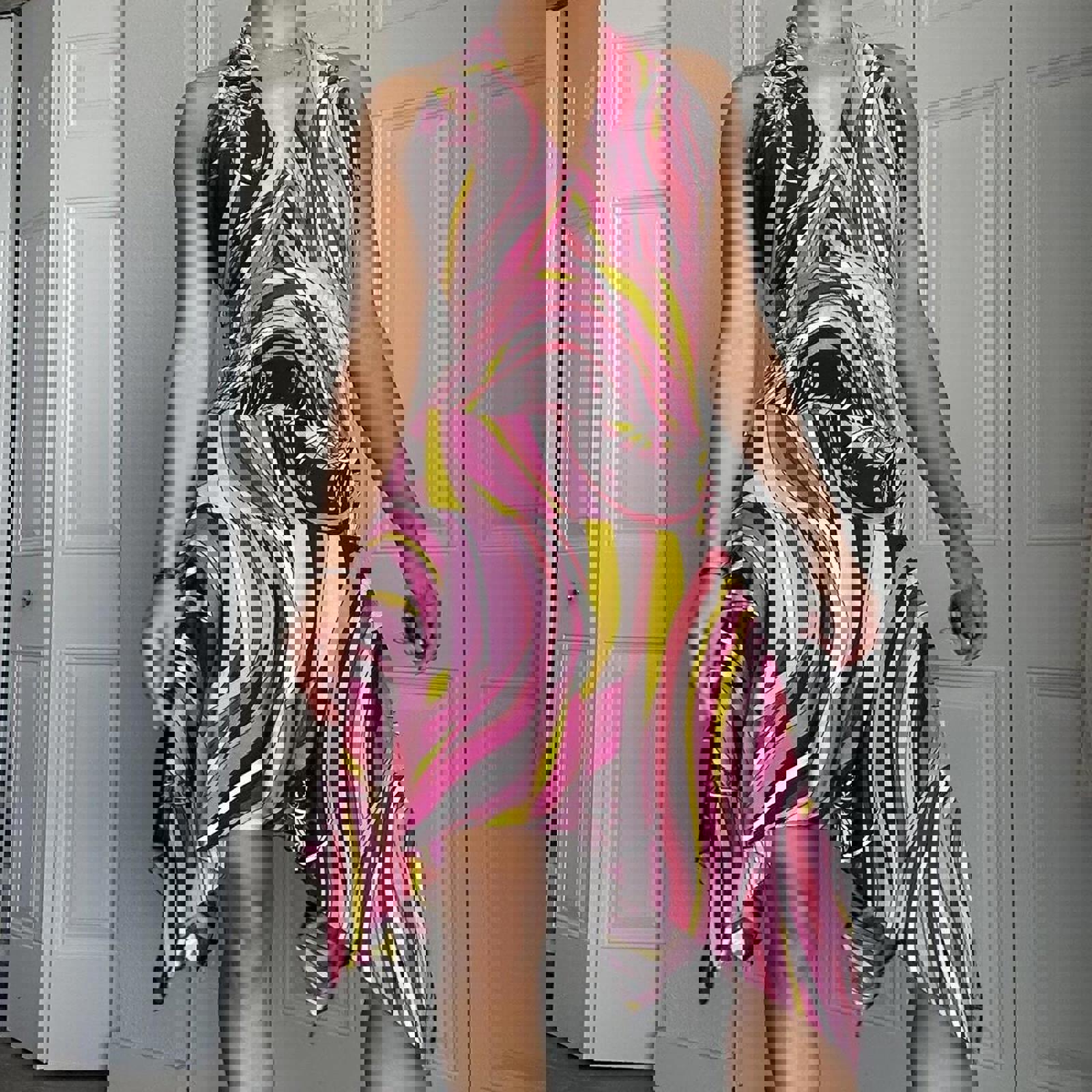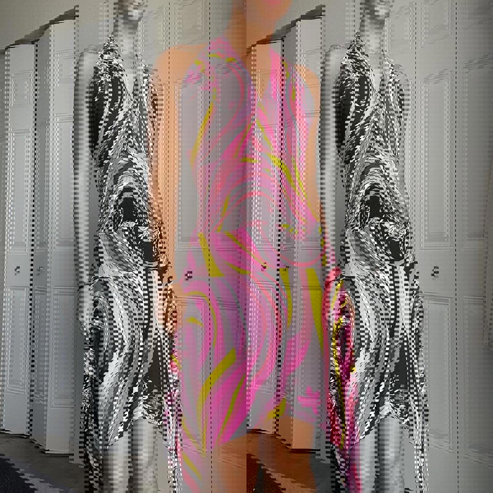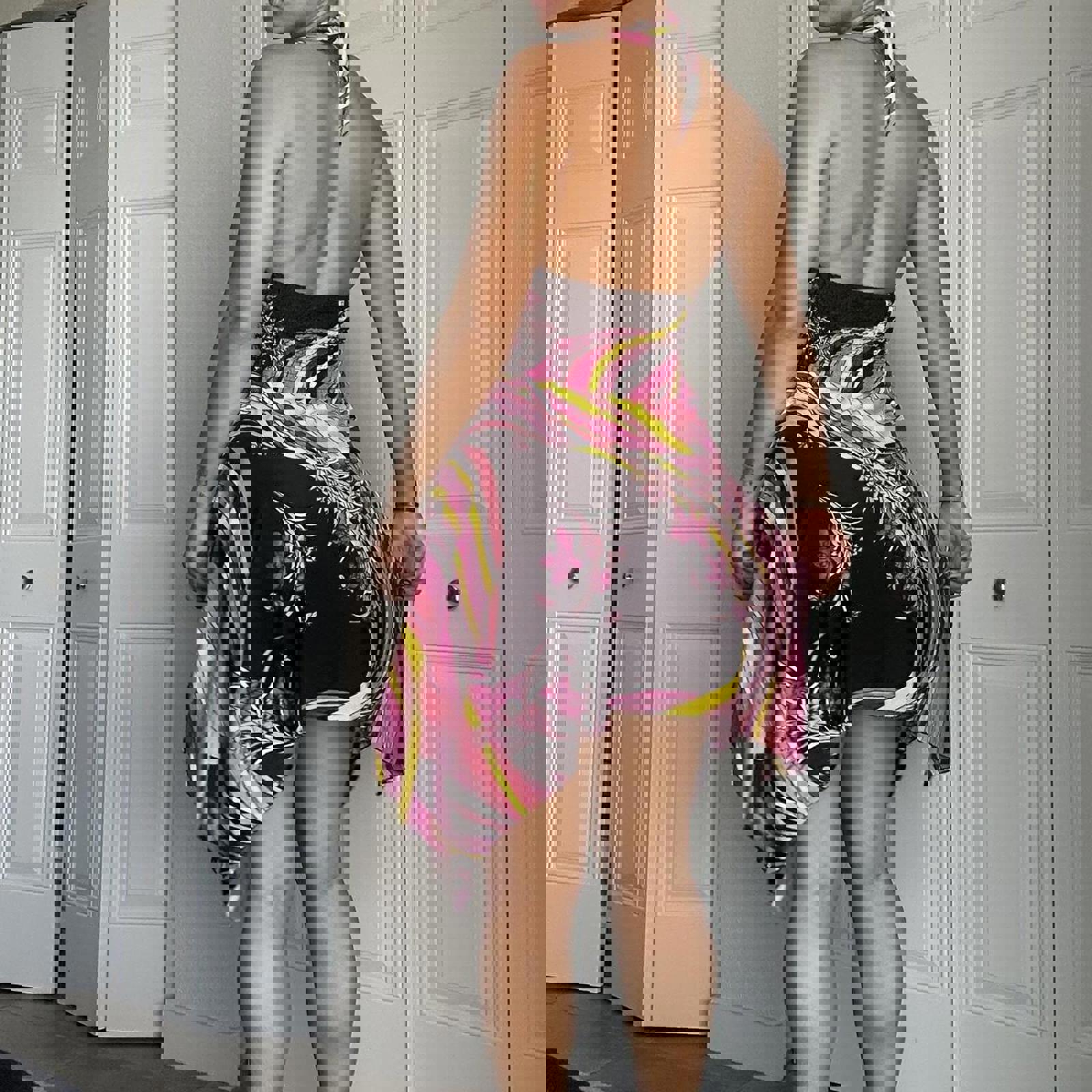576. Pink and yellow halter dress with a flowy, asymmetrical design #festivalvibes gives pucci vibes