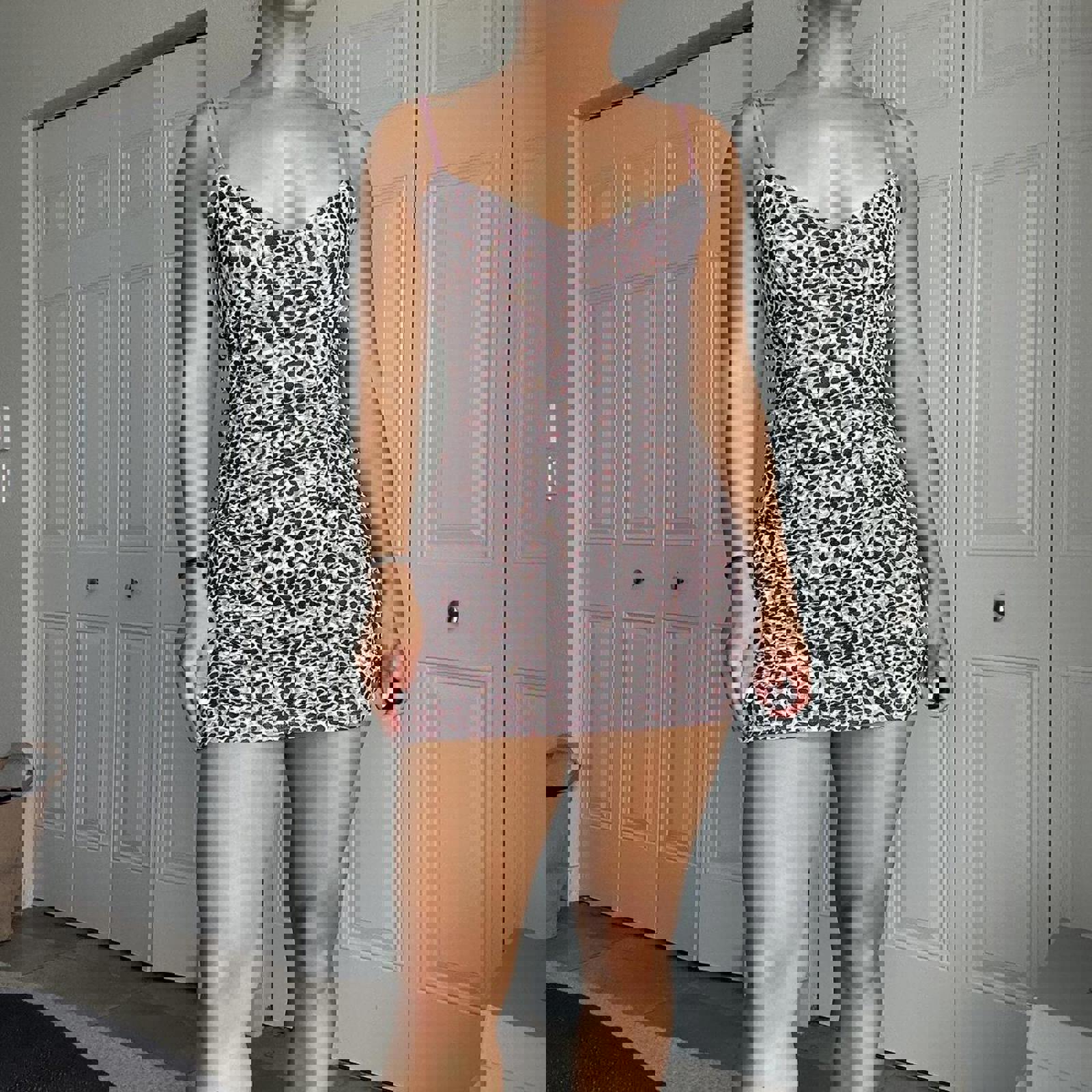 352. Papaya purple #MIN dress with black spots all over, this dress is so incredibly flattering it has ruching down both sides. It is a size small and fits a such has an invisible zipper in the back and adjustable straps