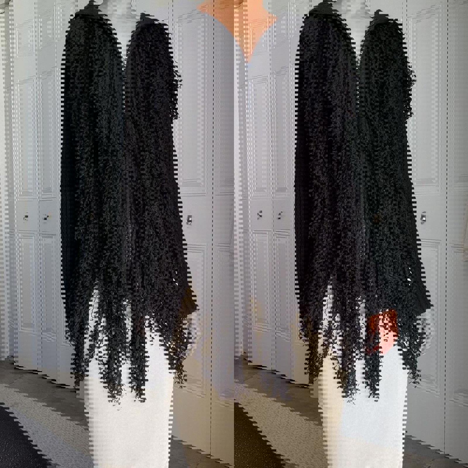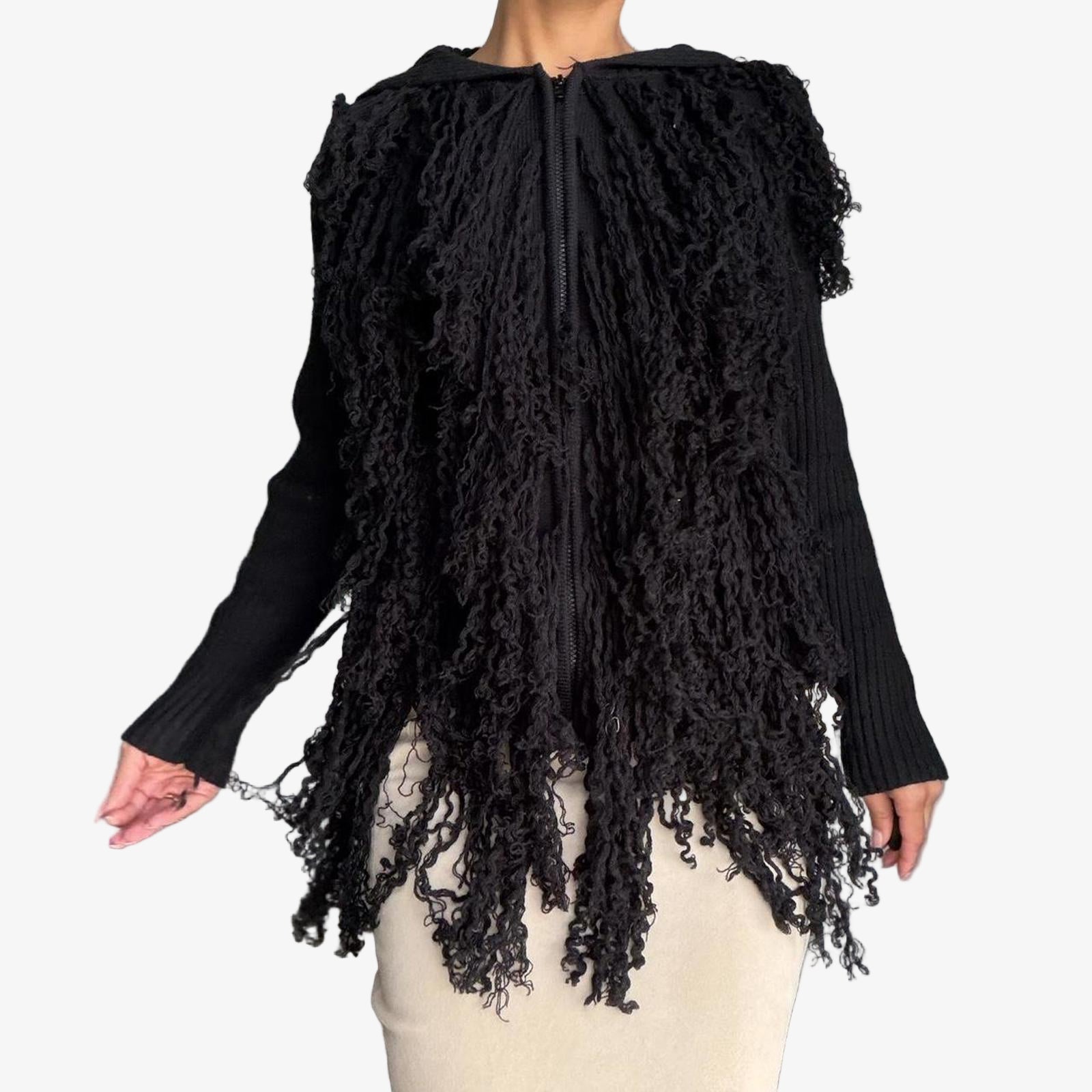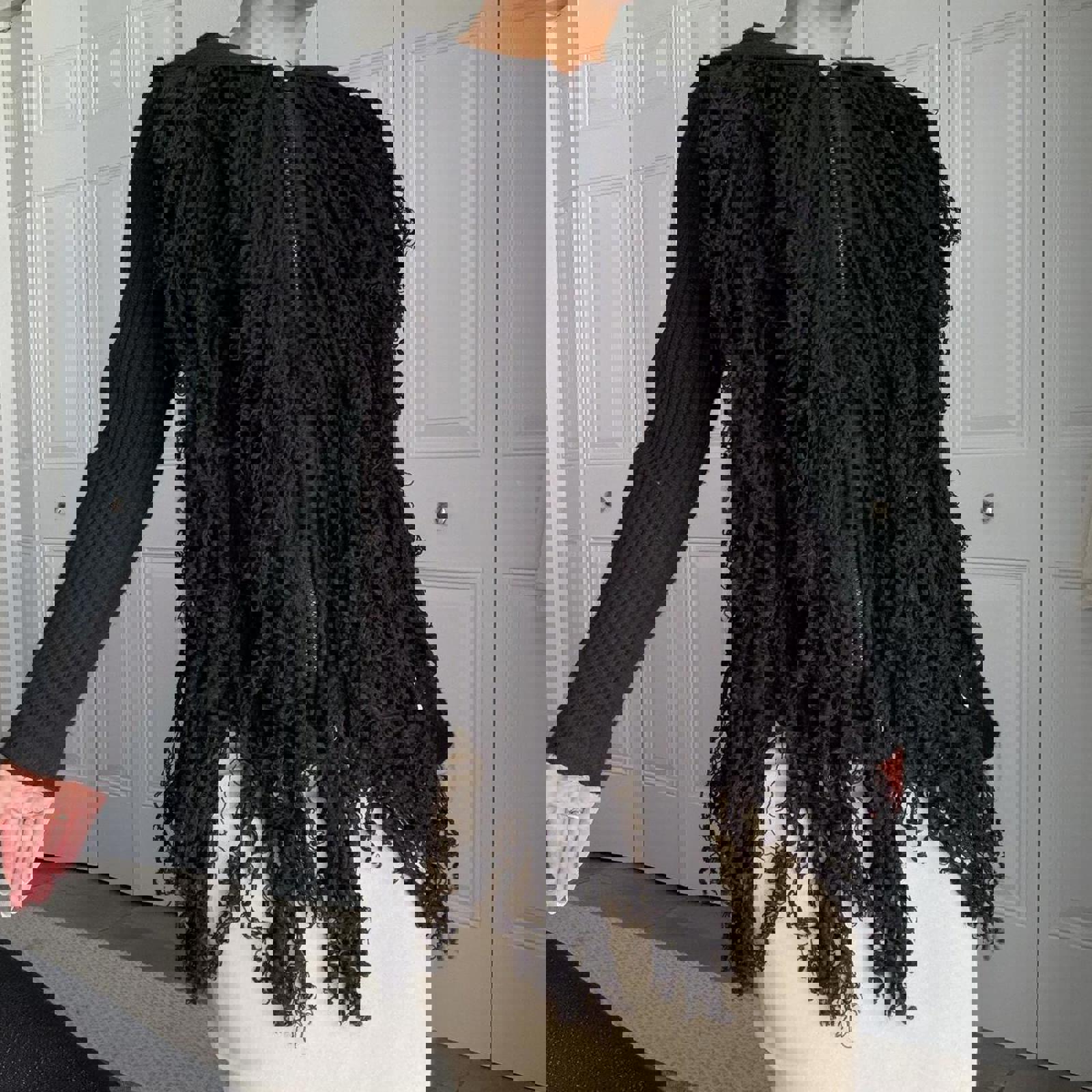 1004. Simon Chang fringe sweater in perfect condition does have a hood on the back as well. The absolute coolest sweater labeled a size small. However, measurements laying flat are listed below.