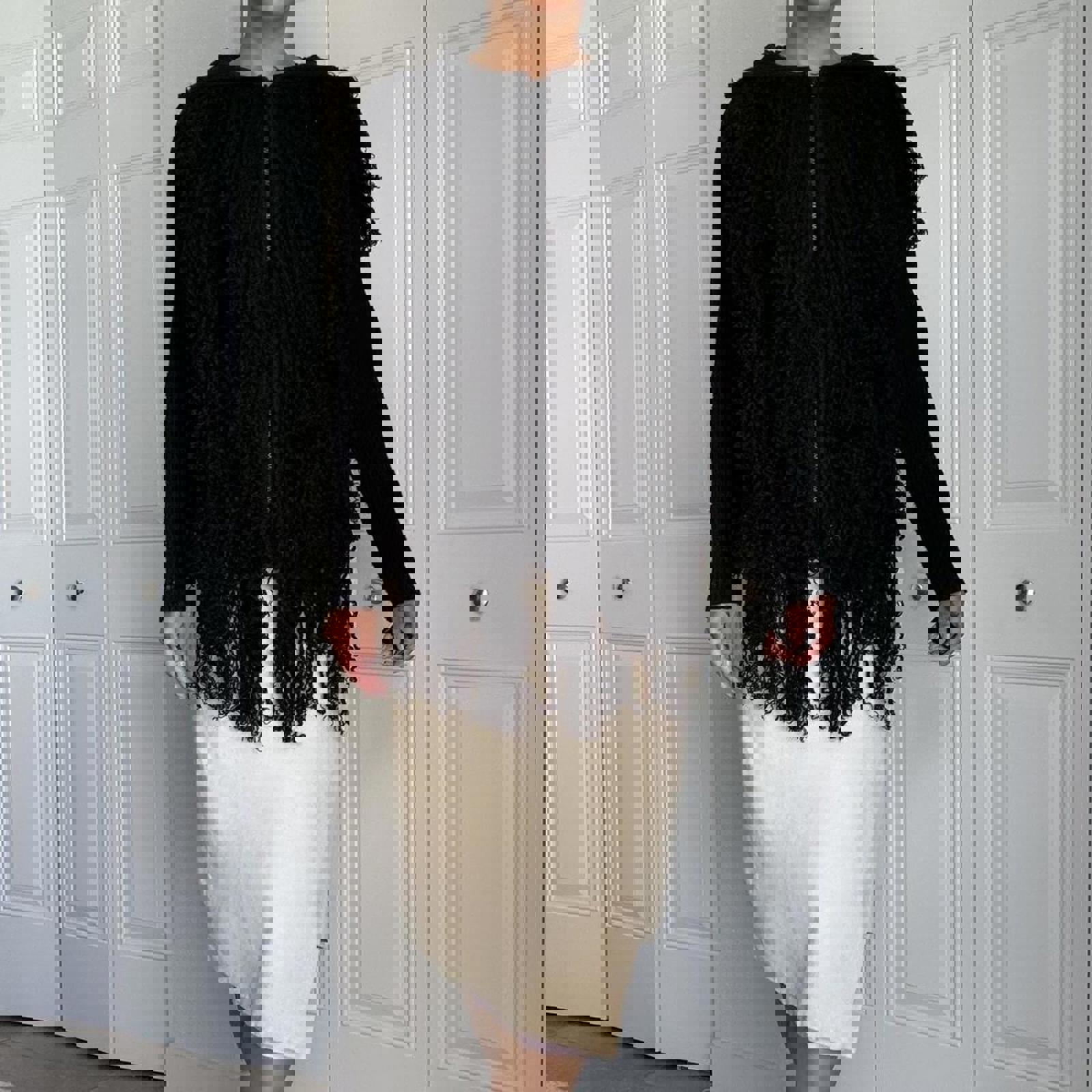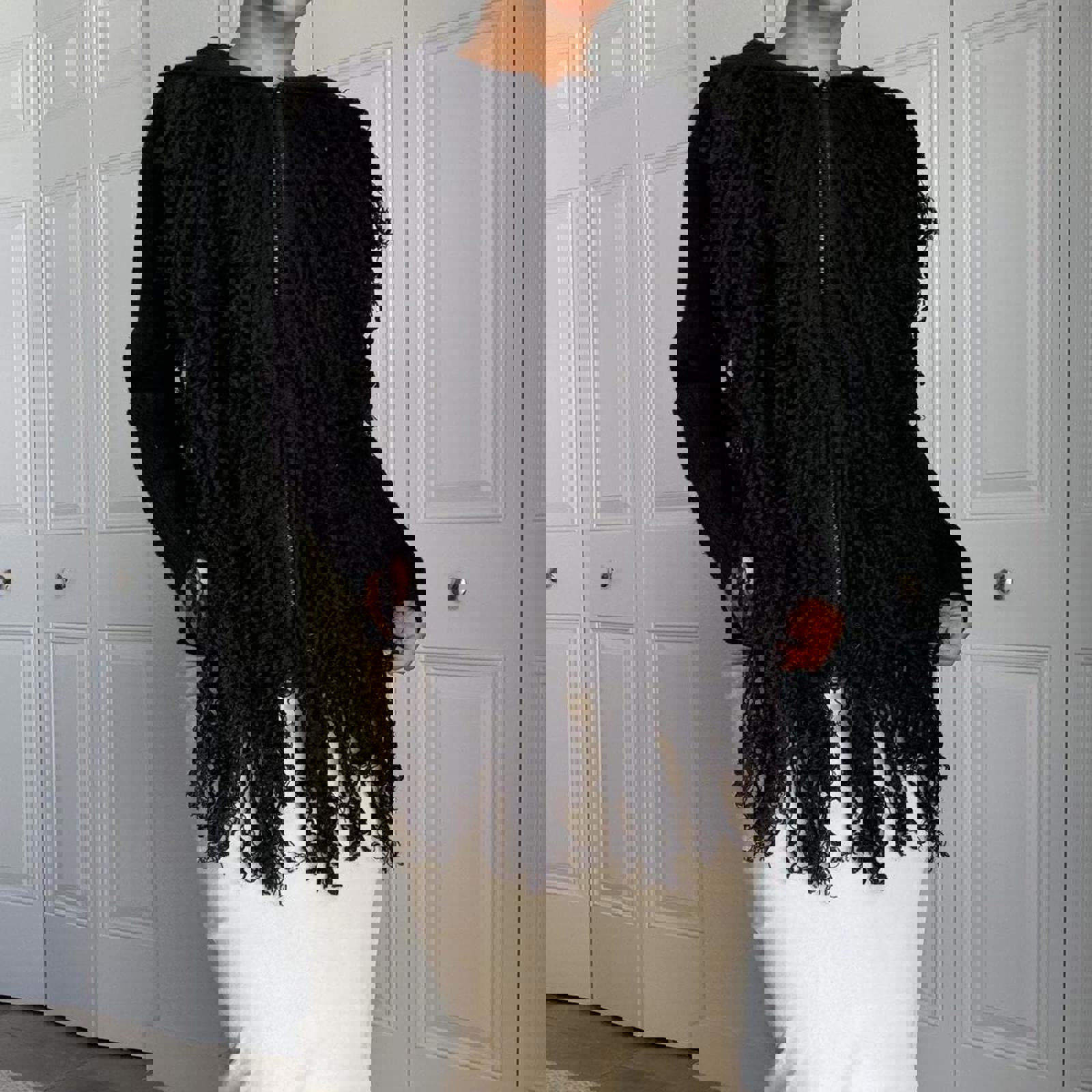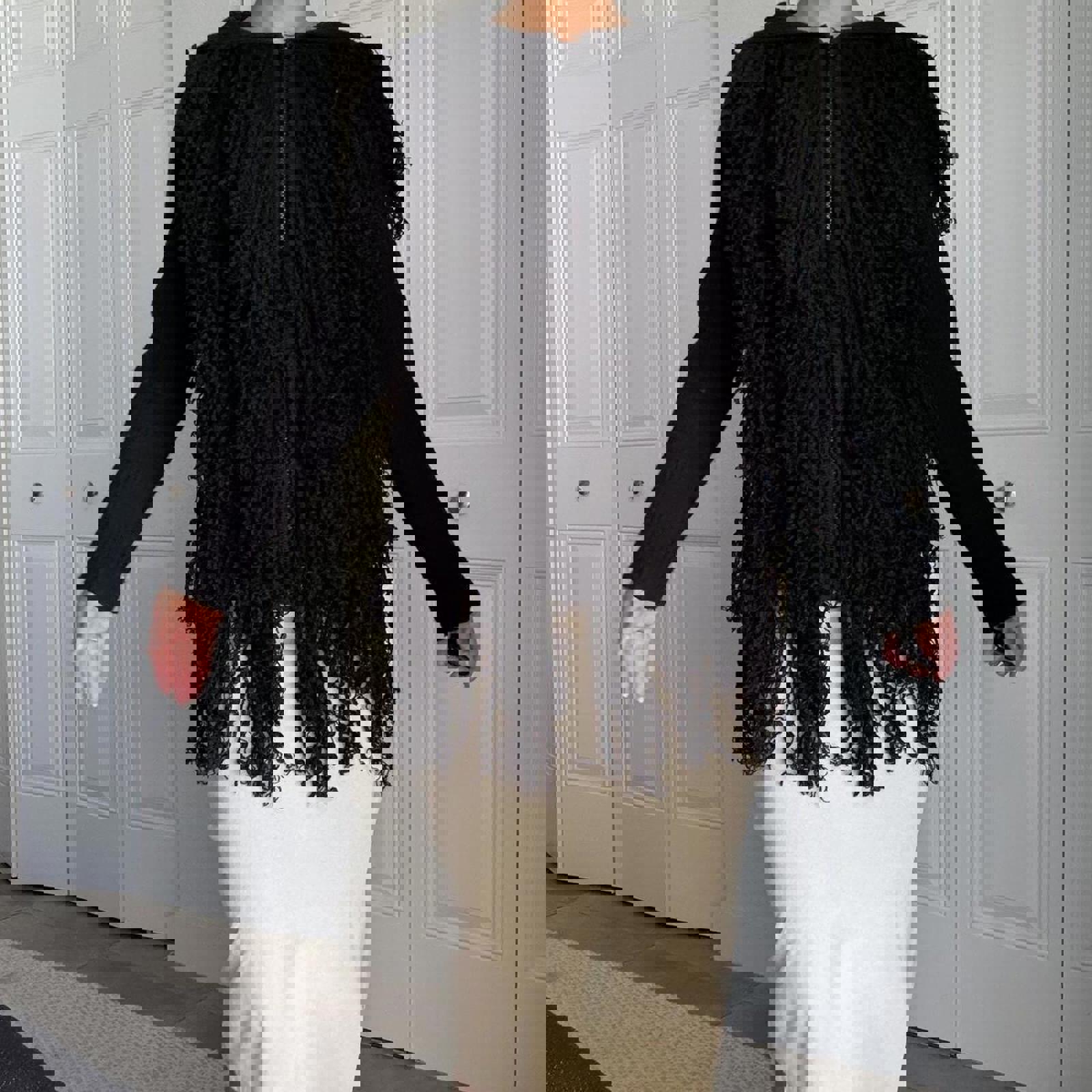 1004. Simon Chang fringe sweater in perfect condition does have a hood on the back as well. The absolute coolest sweater labeled a size small. However, measurements laying flat are listed below.