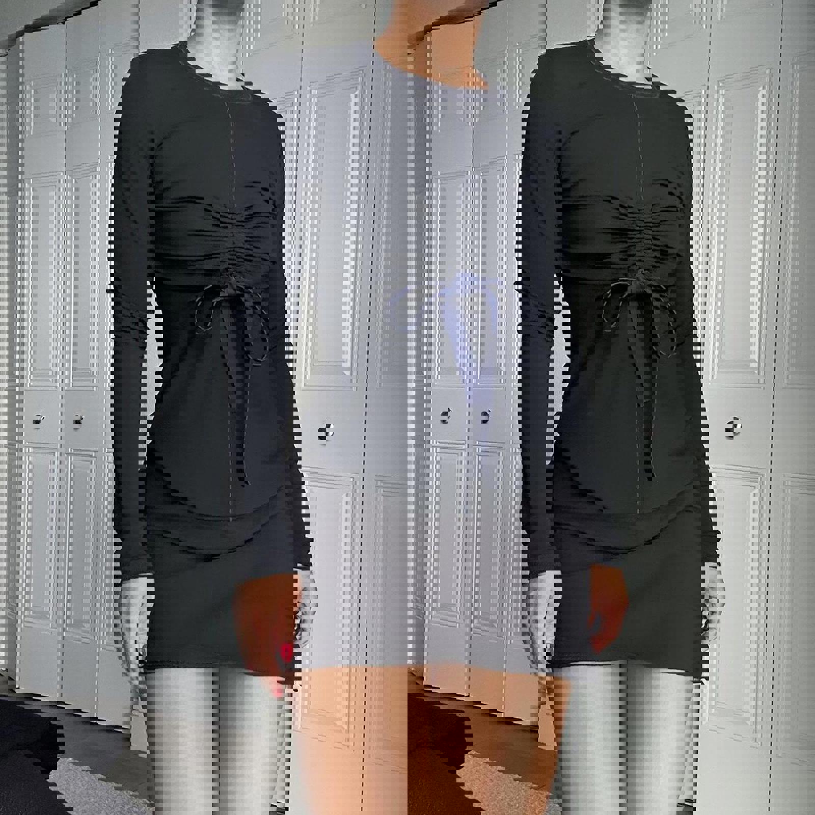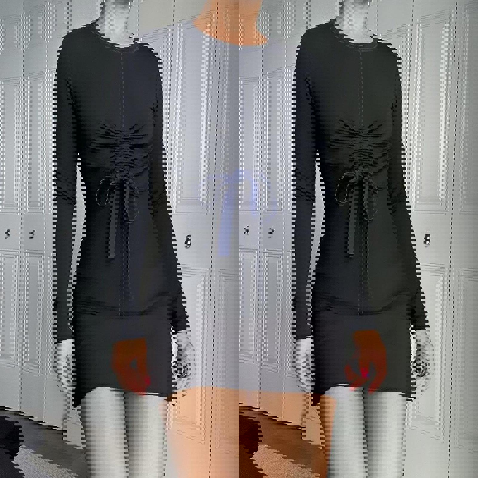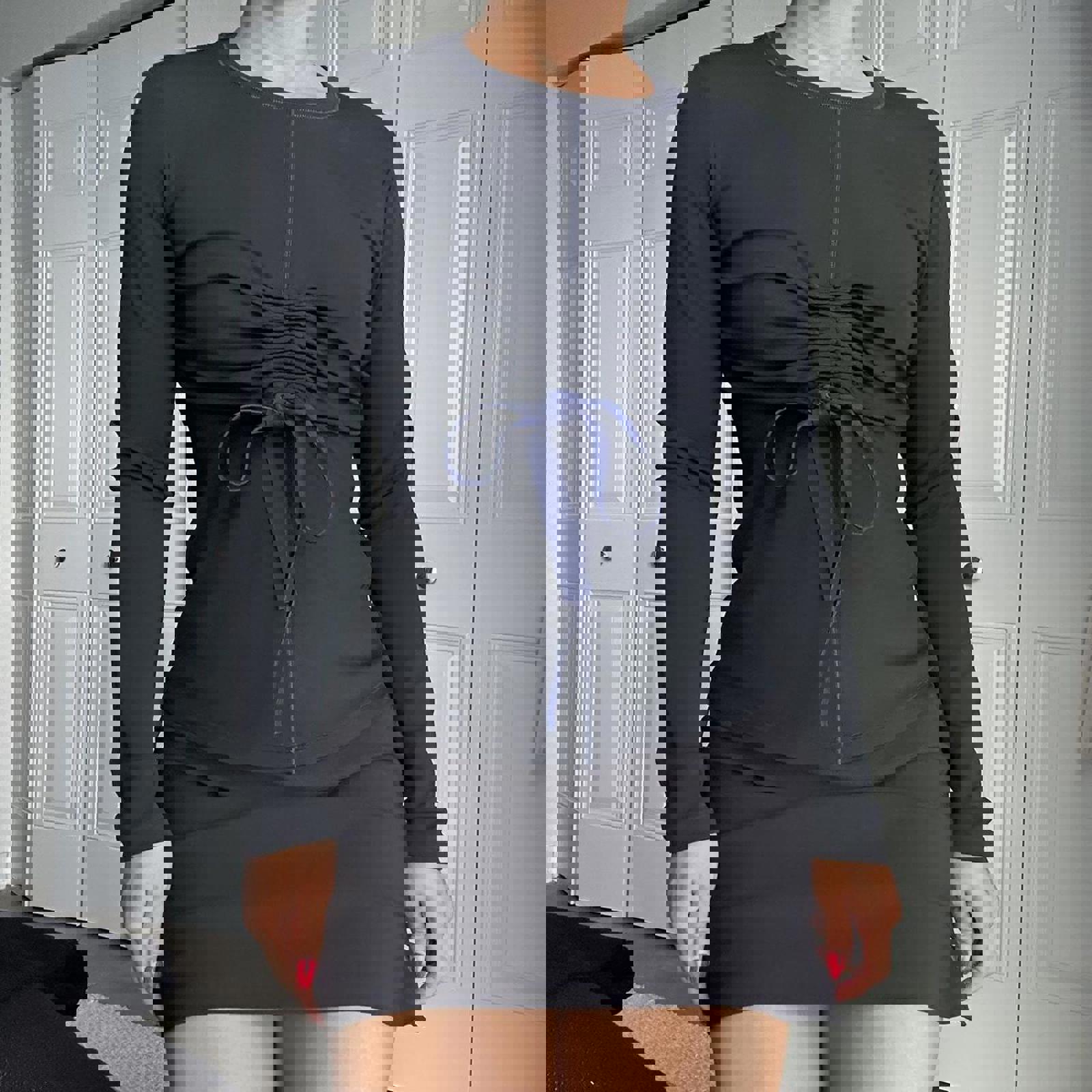 753. Sport Max top with blue bow-tailing and blue stitching. Top is black with cinched detail in the front. Perfect condition. Size tag was cut out, so not sure of actual size. I would say it can fit like a medium. Measurements listed below: