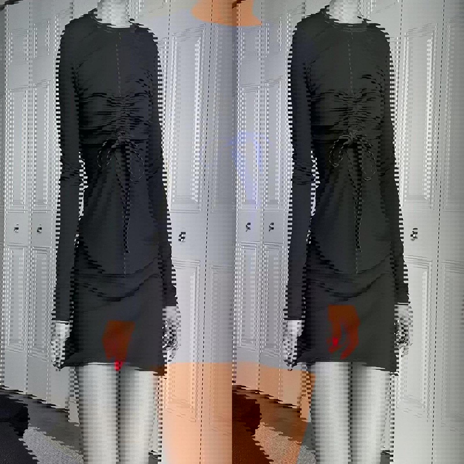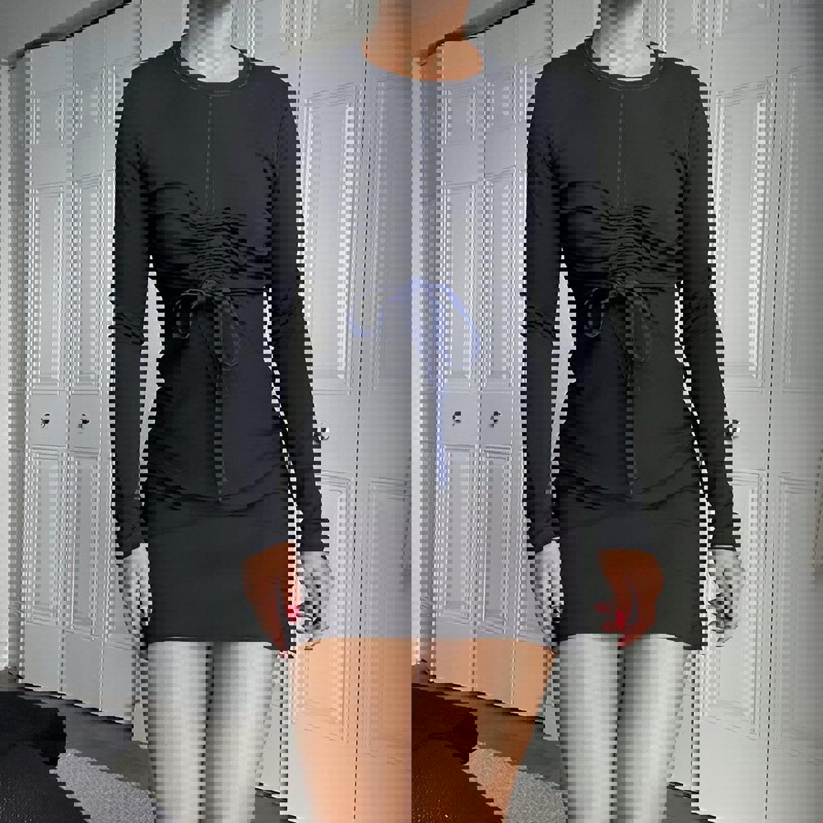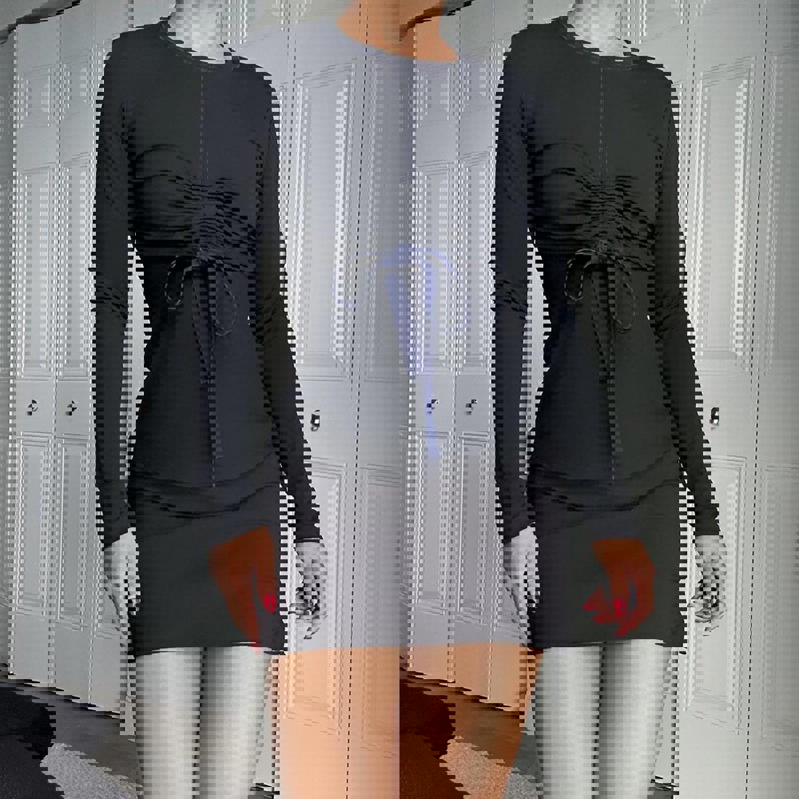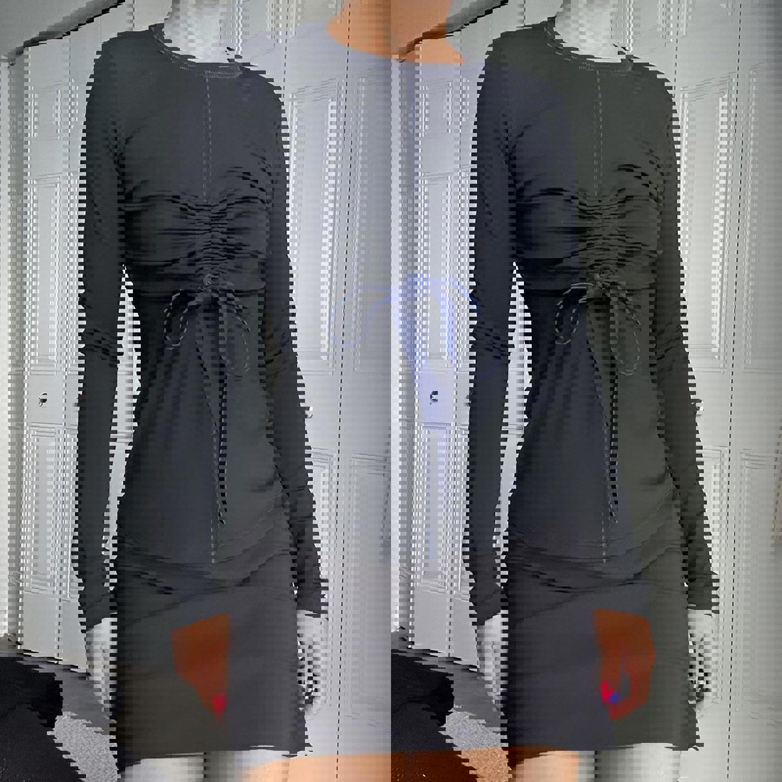 753. Sport Max top with blue bow-tailing and blue stitching. Top is black with cinched detail in the front. Perfect condition. Size tag was cut out, so not sure of actual size. I would say it can fit like a medium. Measurements listed below: