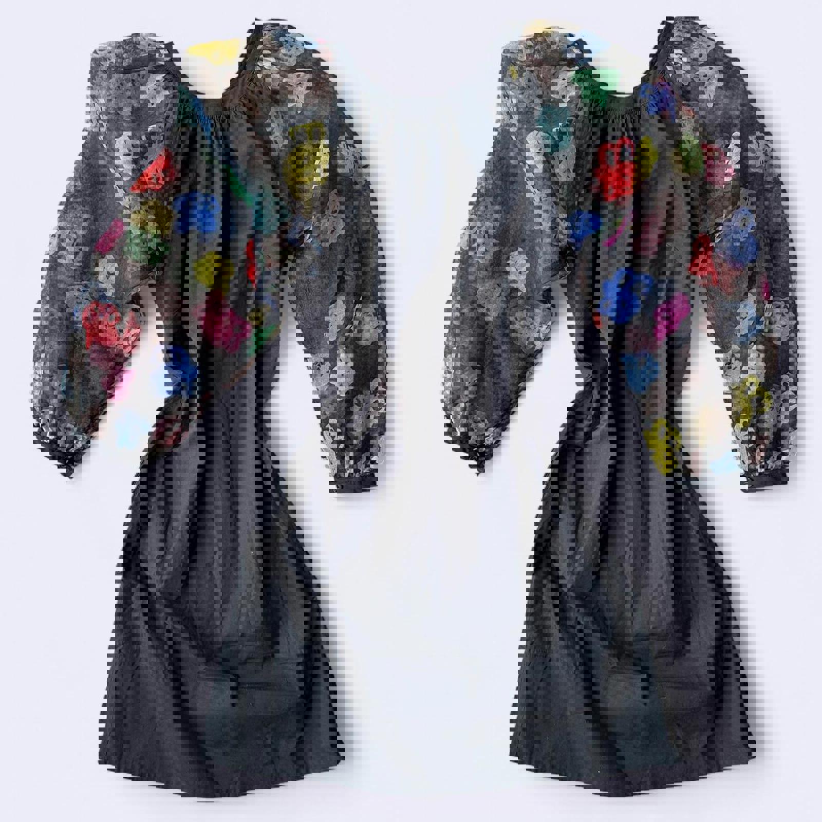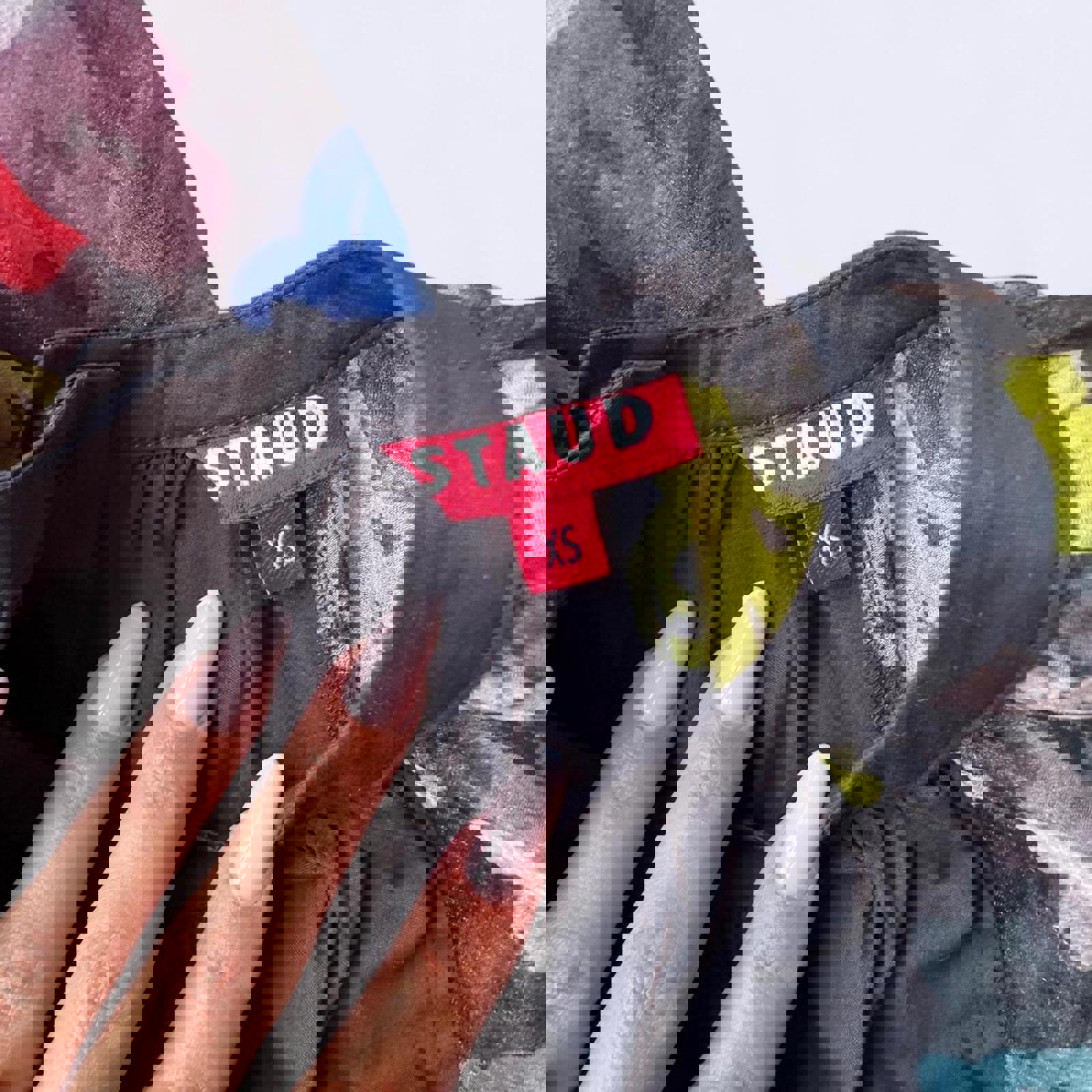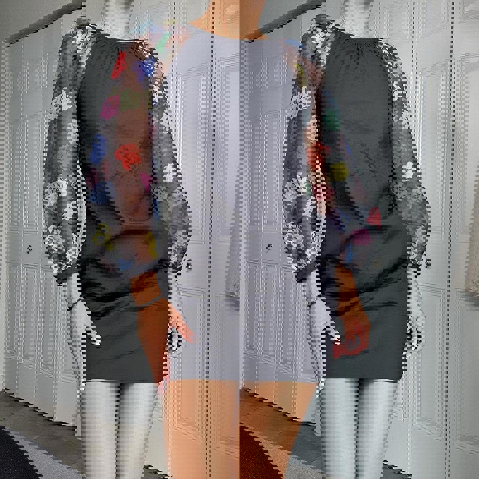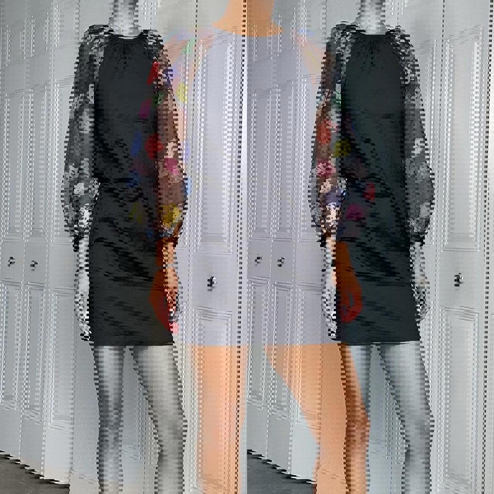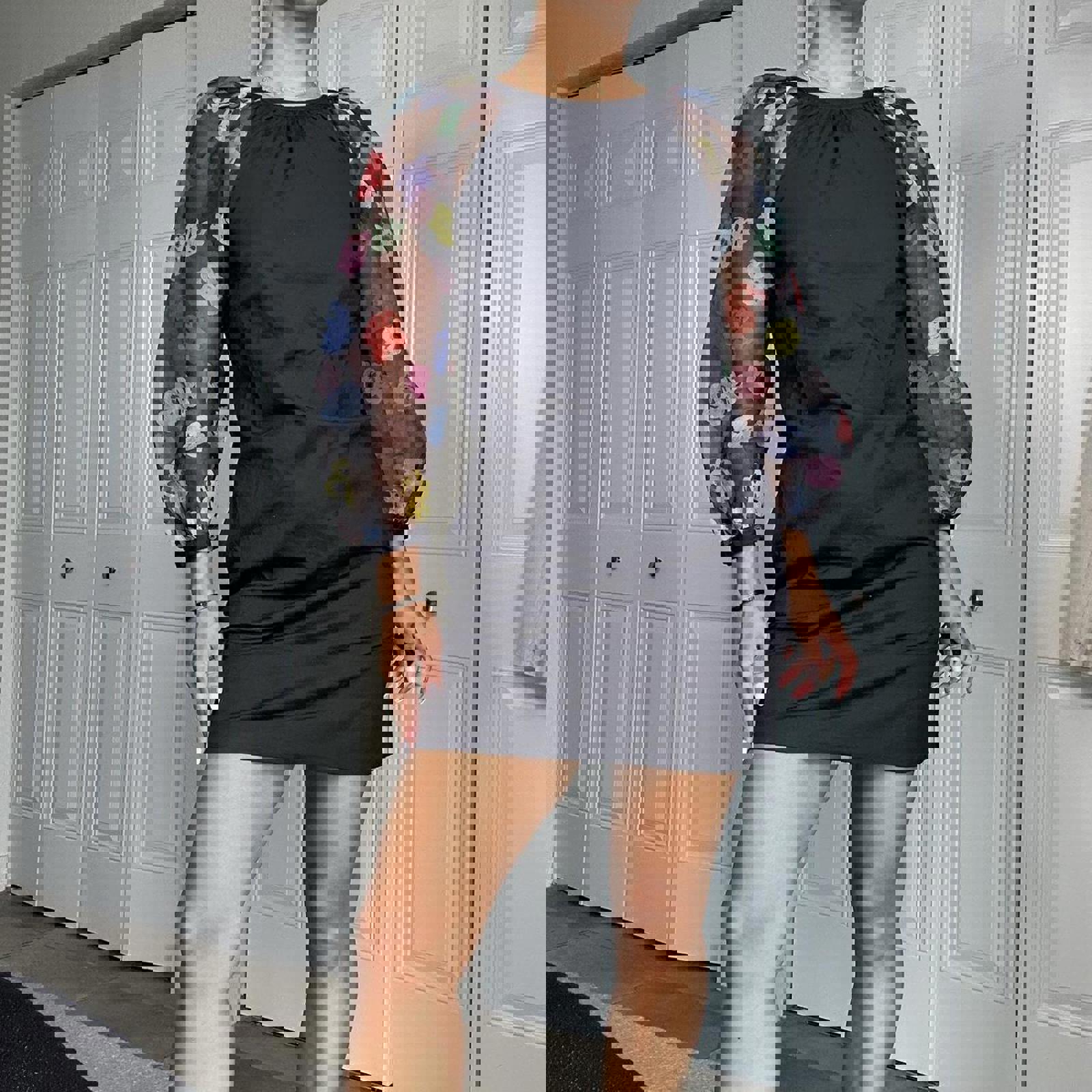 475. Staud black mini dress with floral organza sleeves in perfect condition. Size xs (shown unbuttoned in photos which is the reason for the look)