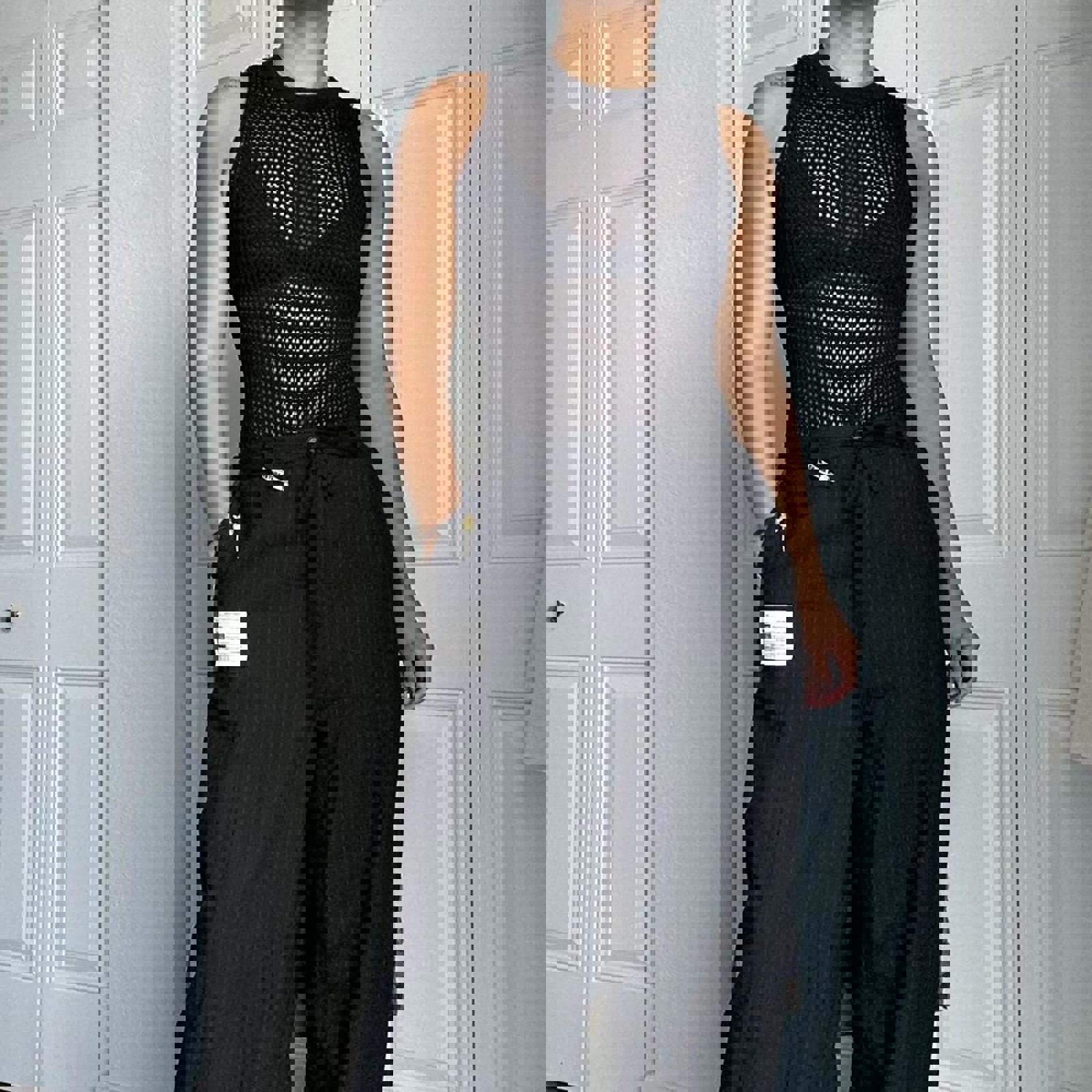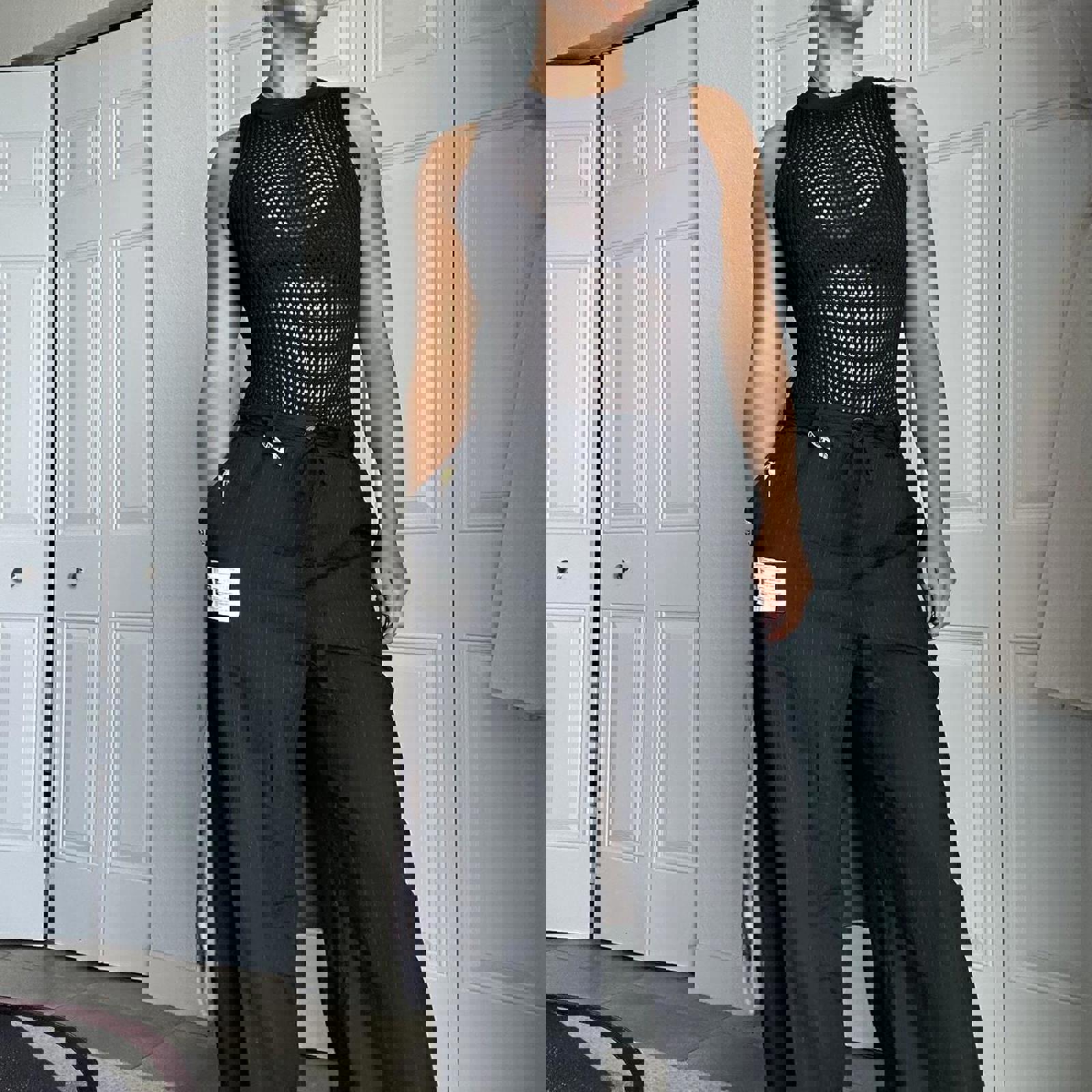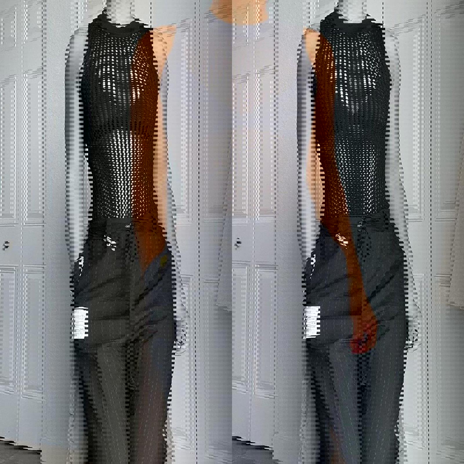 black mesh, fitted, sleeveless, stretch knit, sleek, minimalist, partywear, body-hugging, modern, versatile