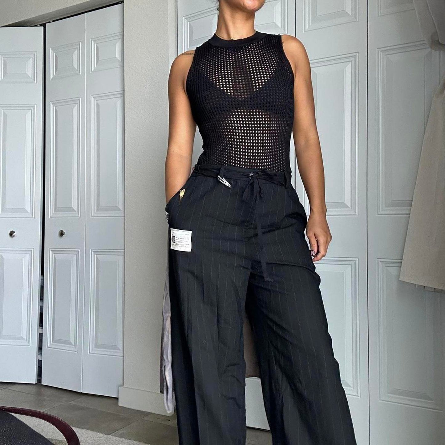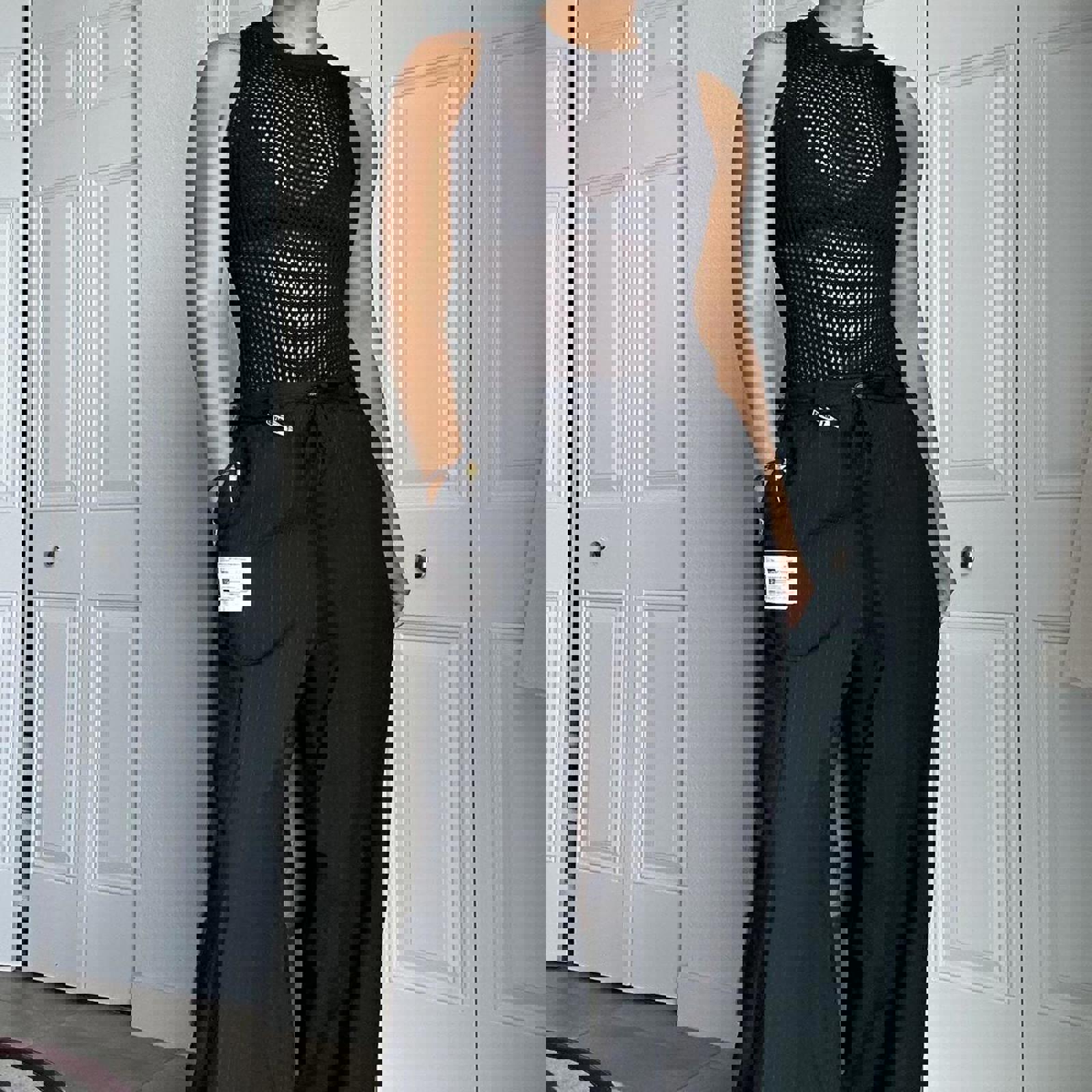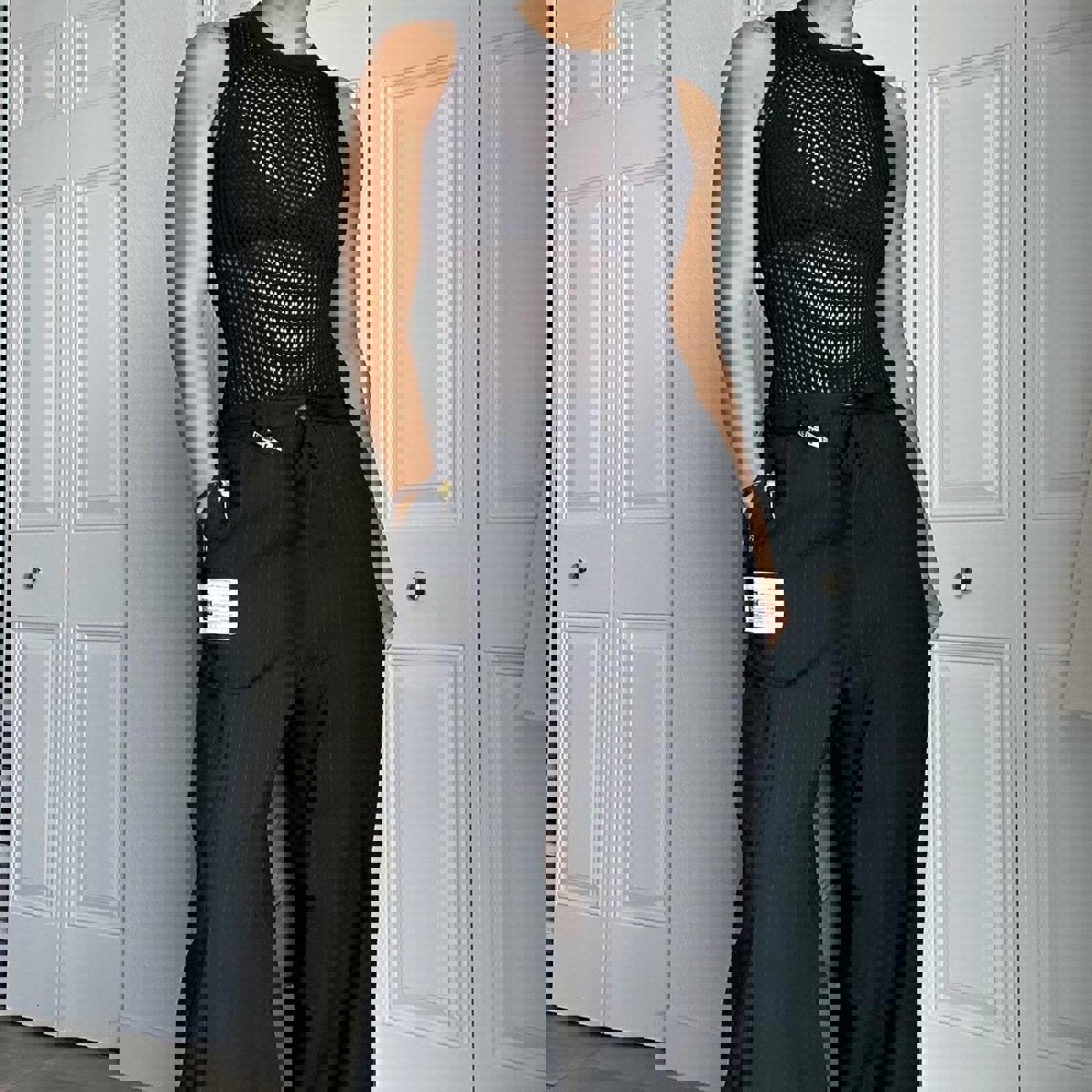 black mesh, fitted, sleeveless, stretch knit, sleek, minimalist, partywear, body-hugging, modern, versatile