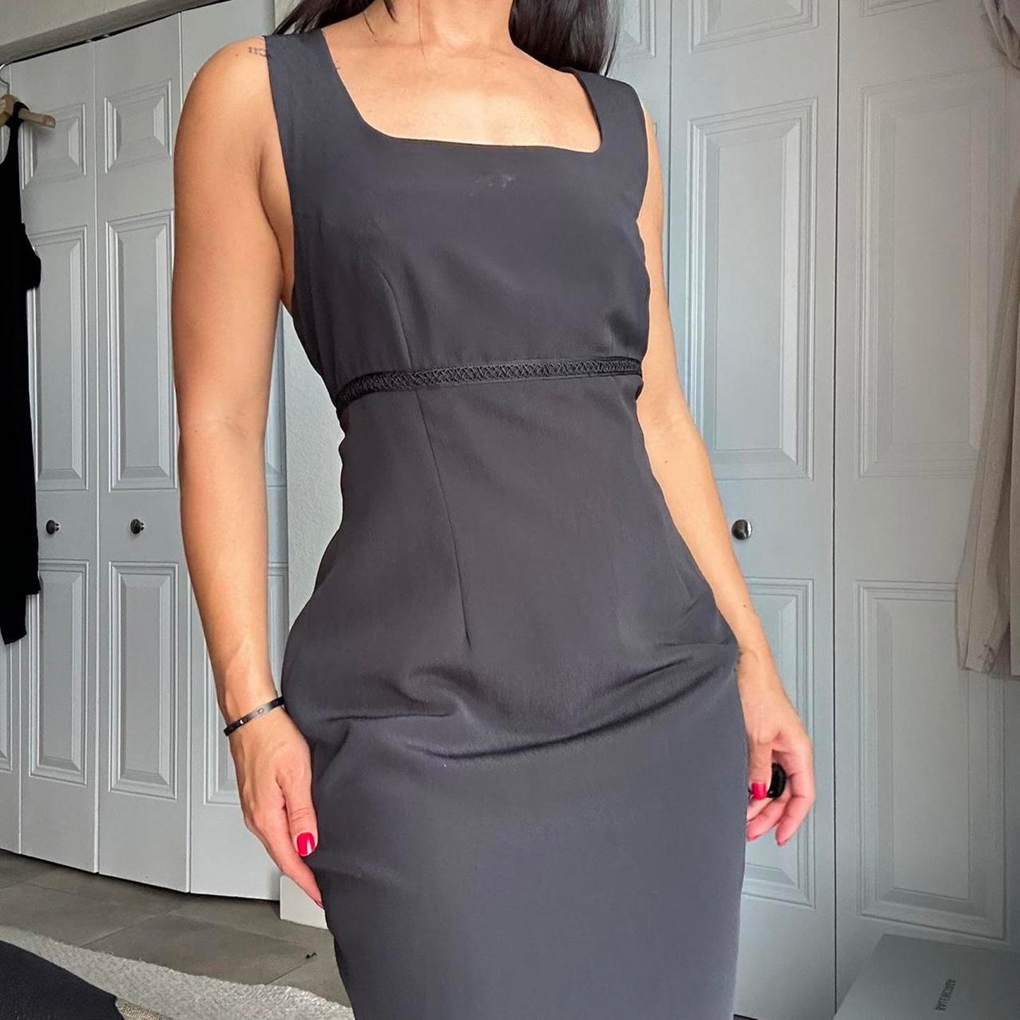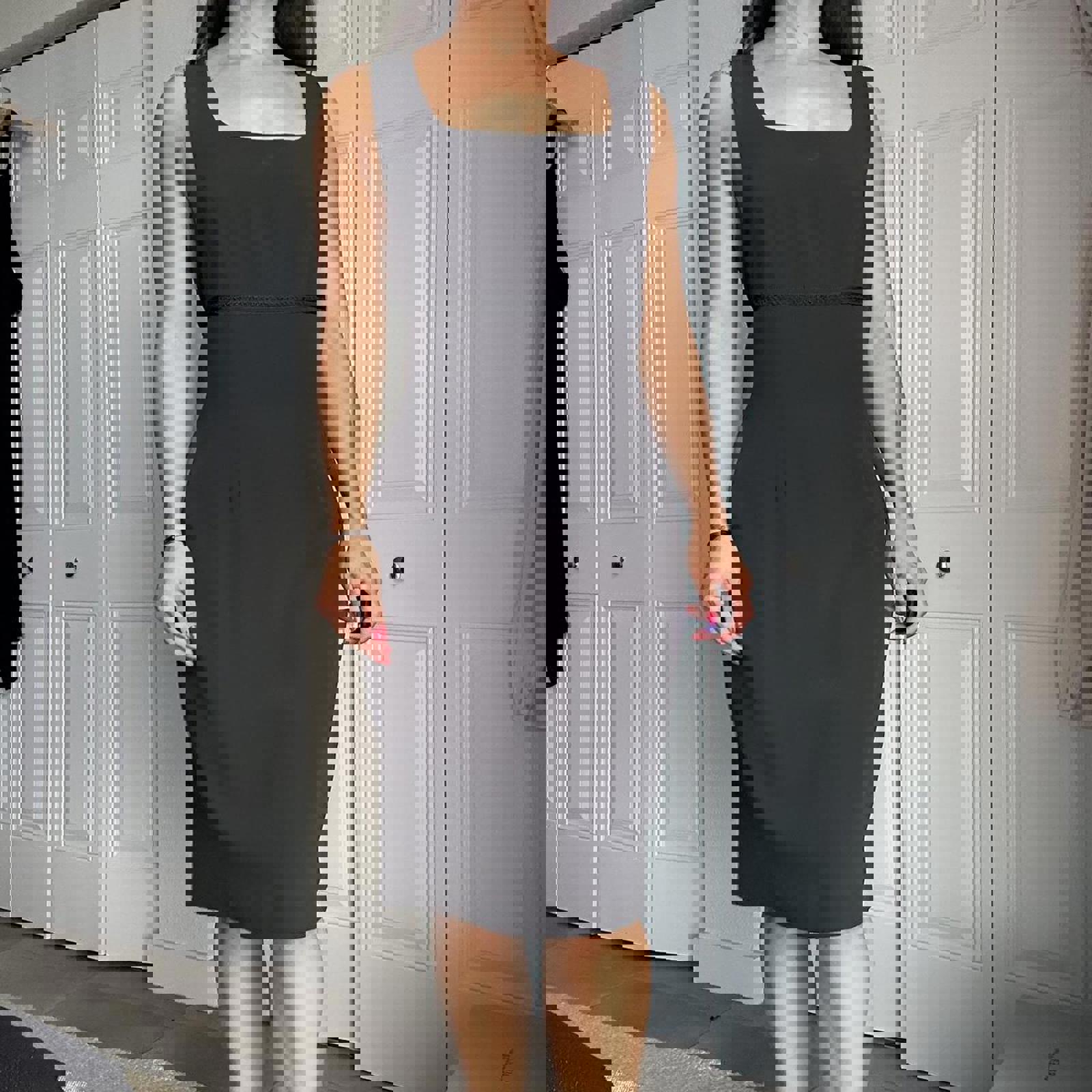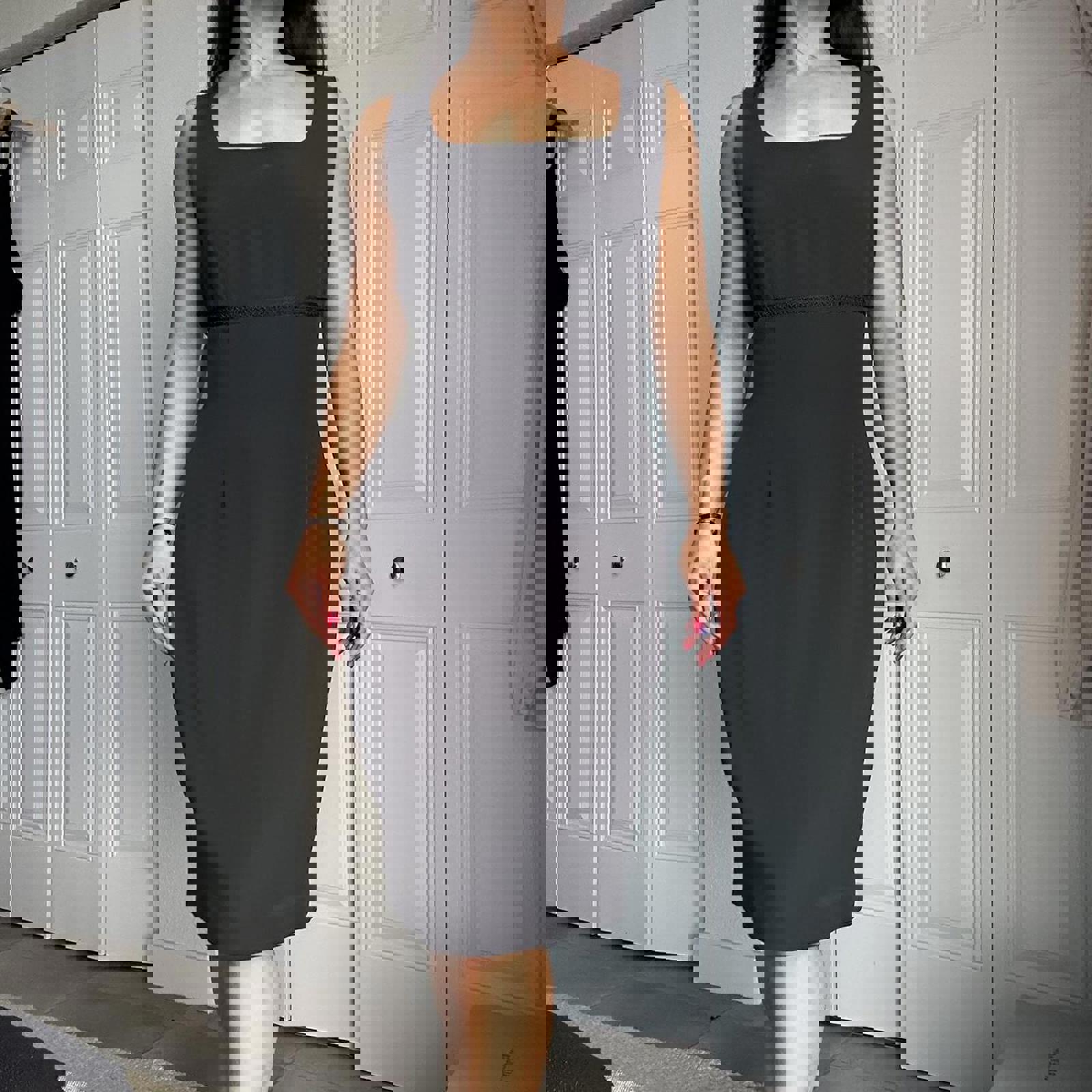 173. Black midi dress with square neckline and zipper closure. Studio by Pat Argenti - vintage size 12 fits like a medium IMO, perfect condition