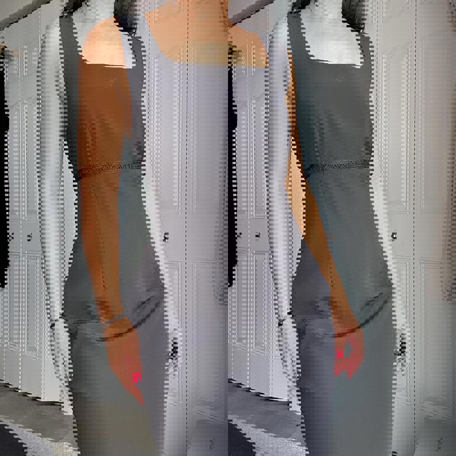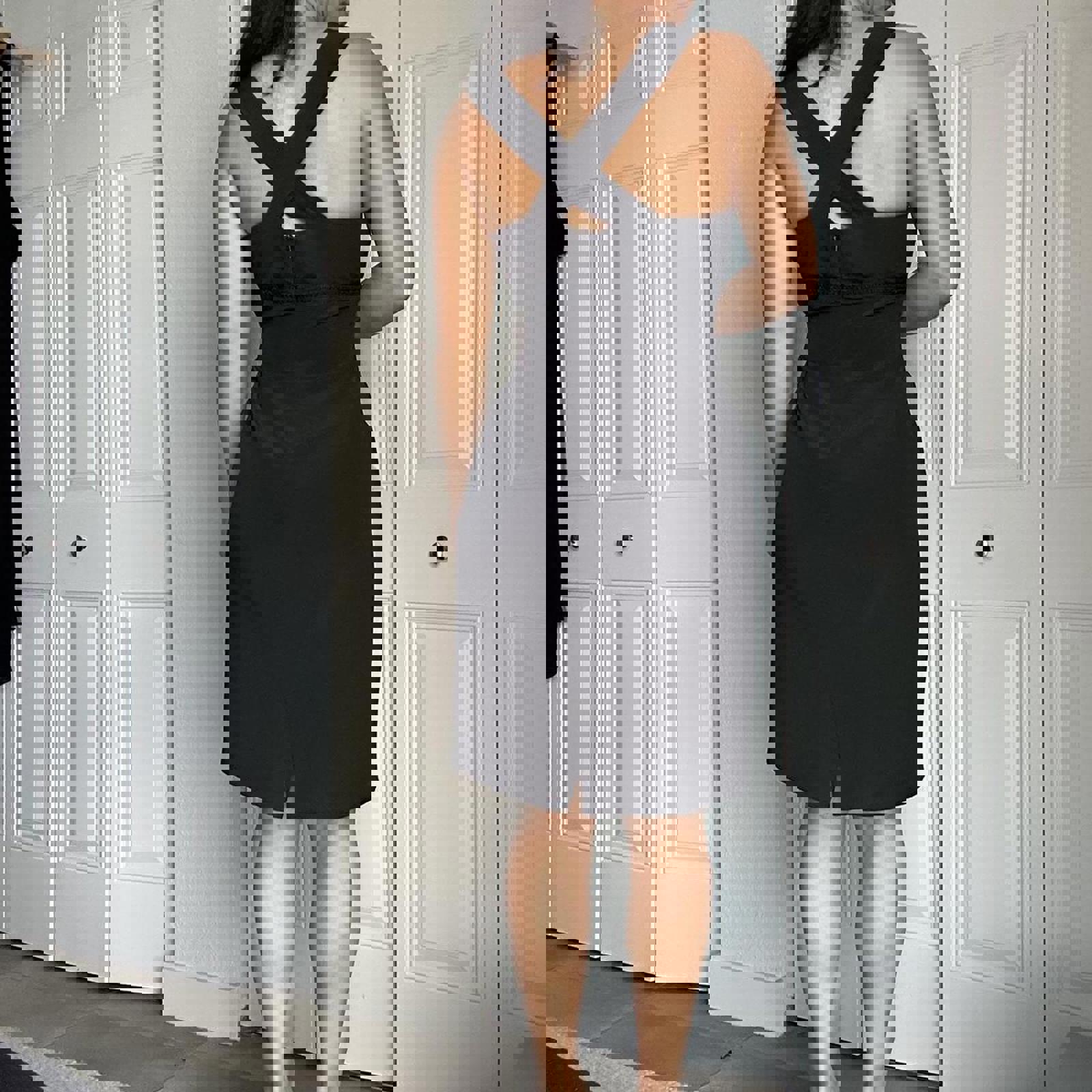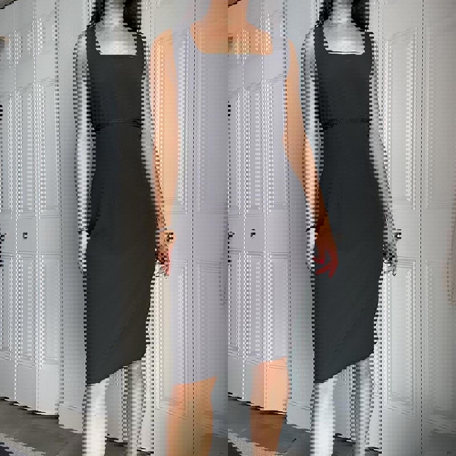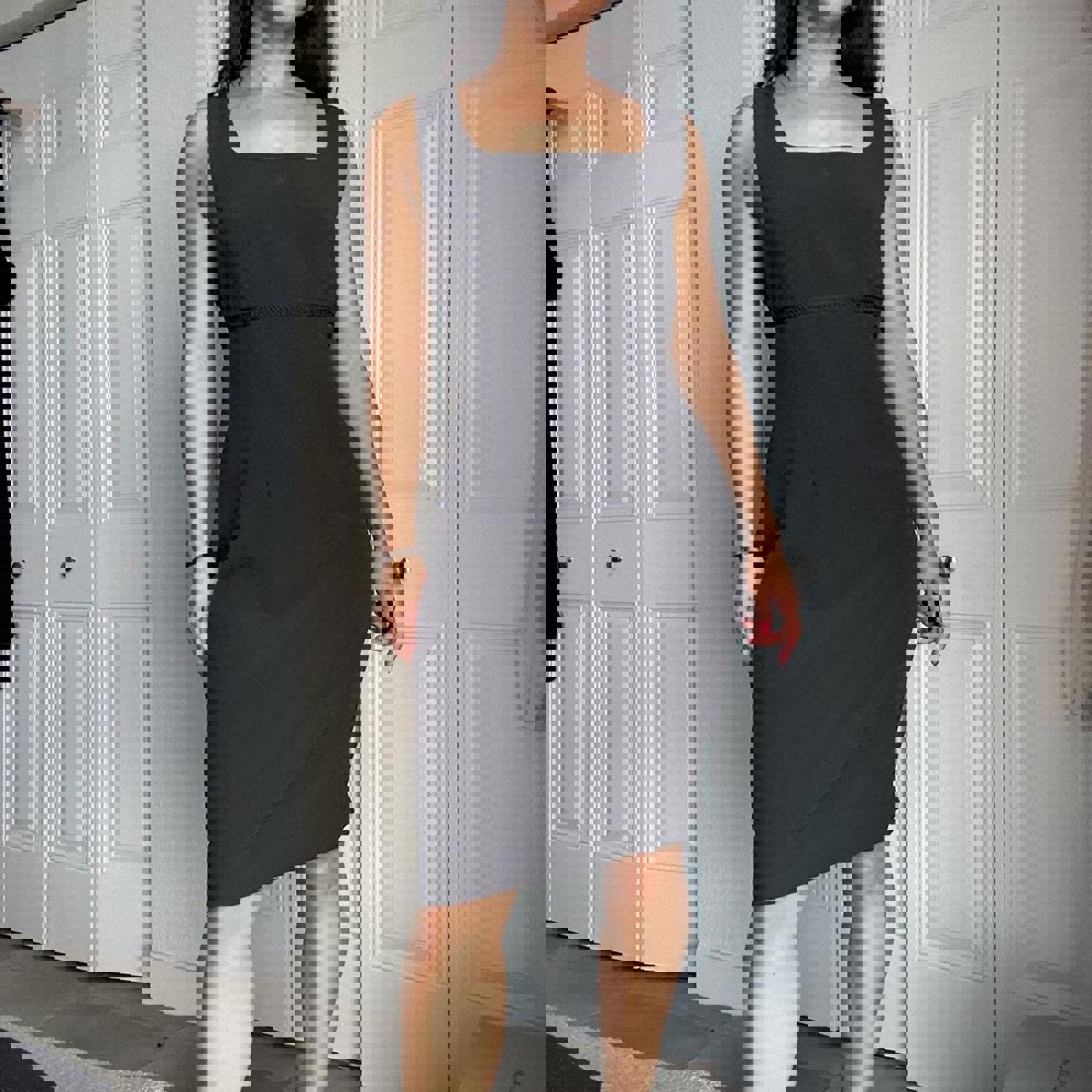 173. Black midi dress with square neckline and zipper closure. Studio by Pat Argenti - vintage size 12 fits like a medium IMO, perfect condition