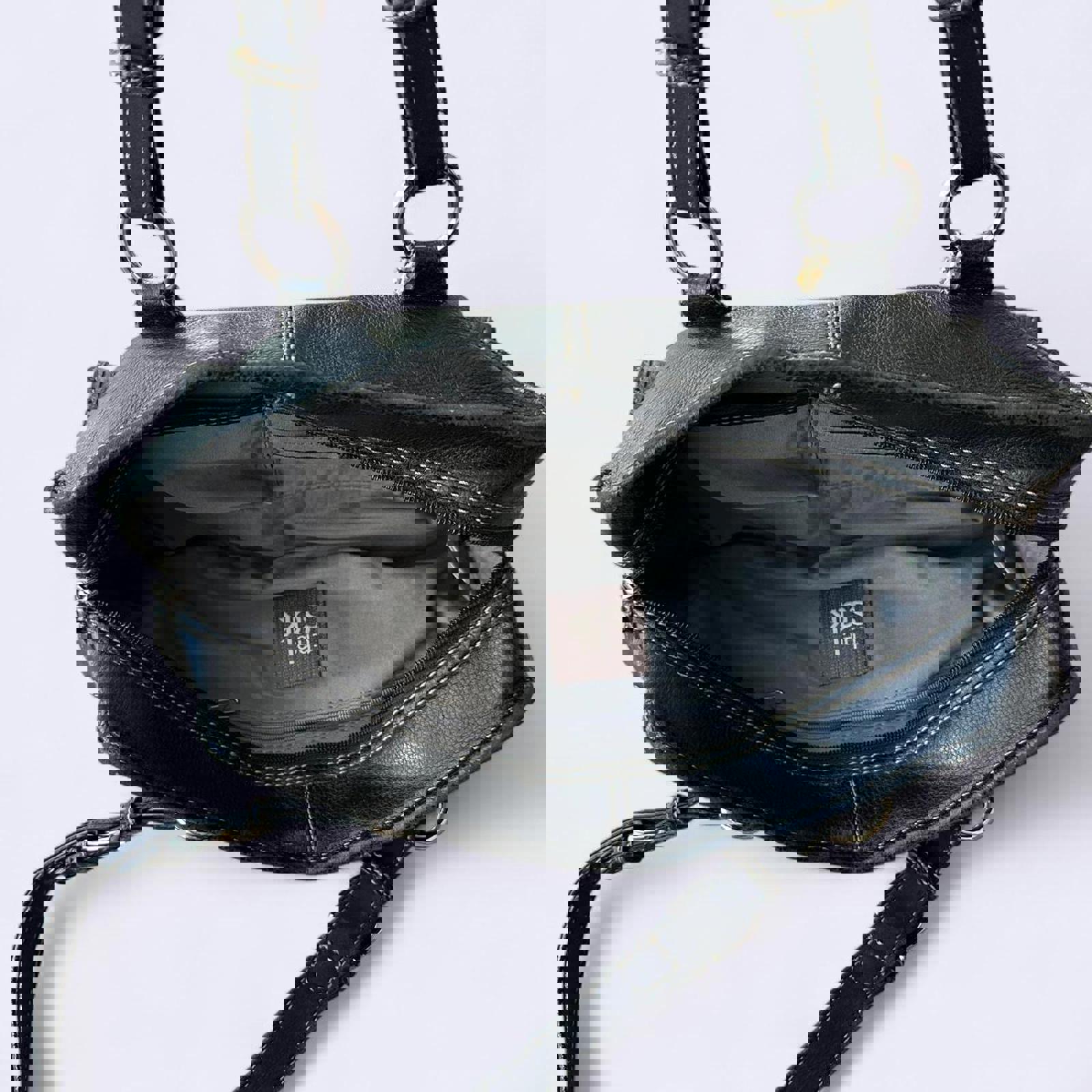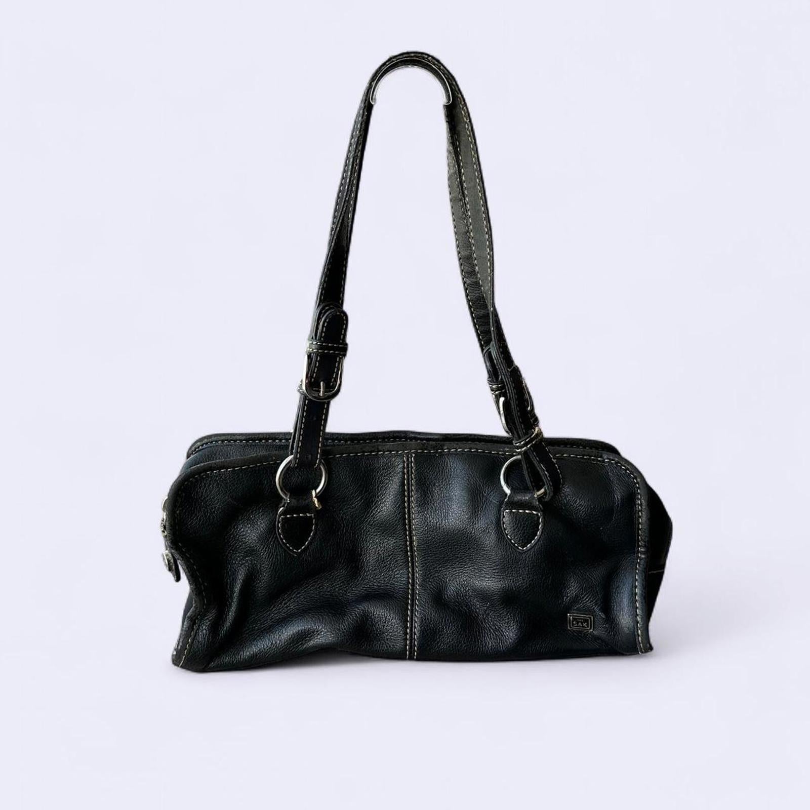 genuine leather, shoulder tote, zipper closure, distressed straps, sleek design, black leather, structured bag, minimalist, everyday carry, accessory