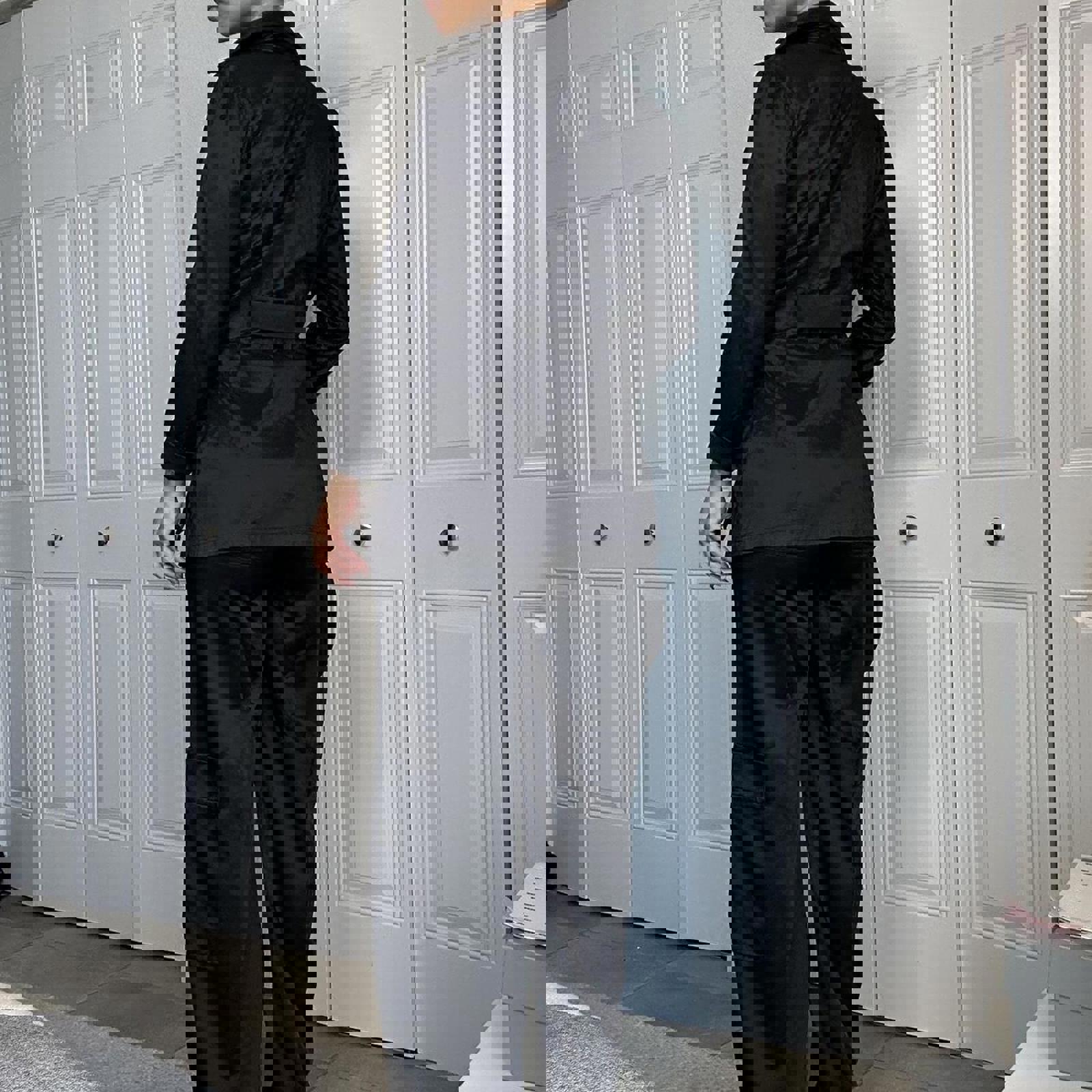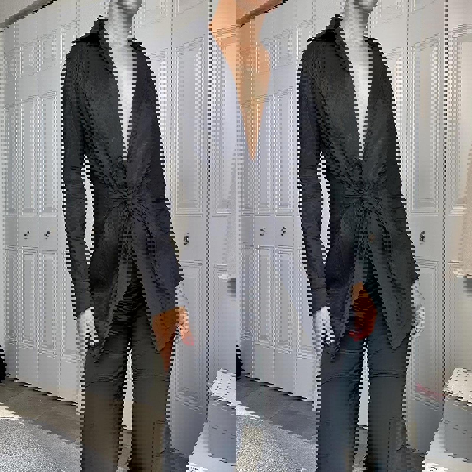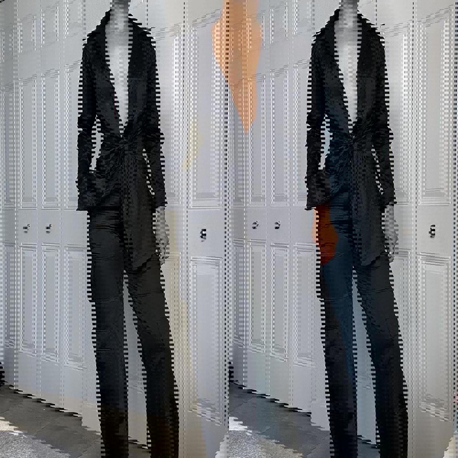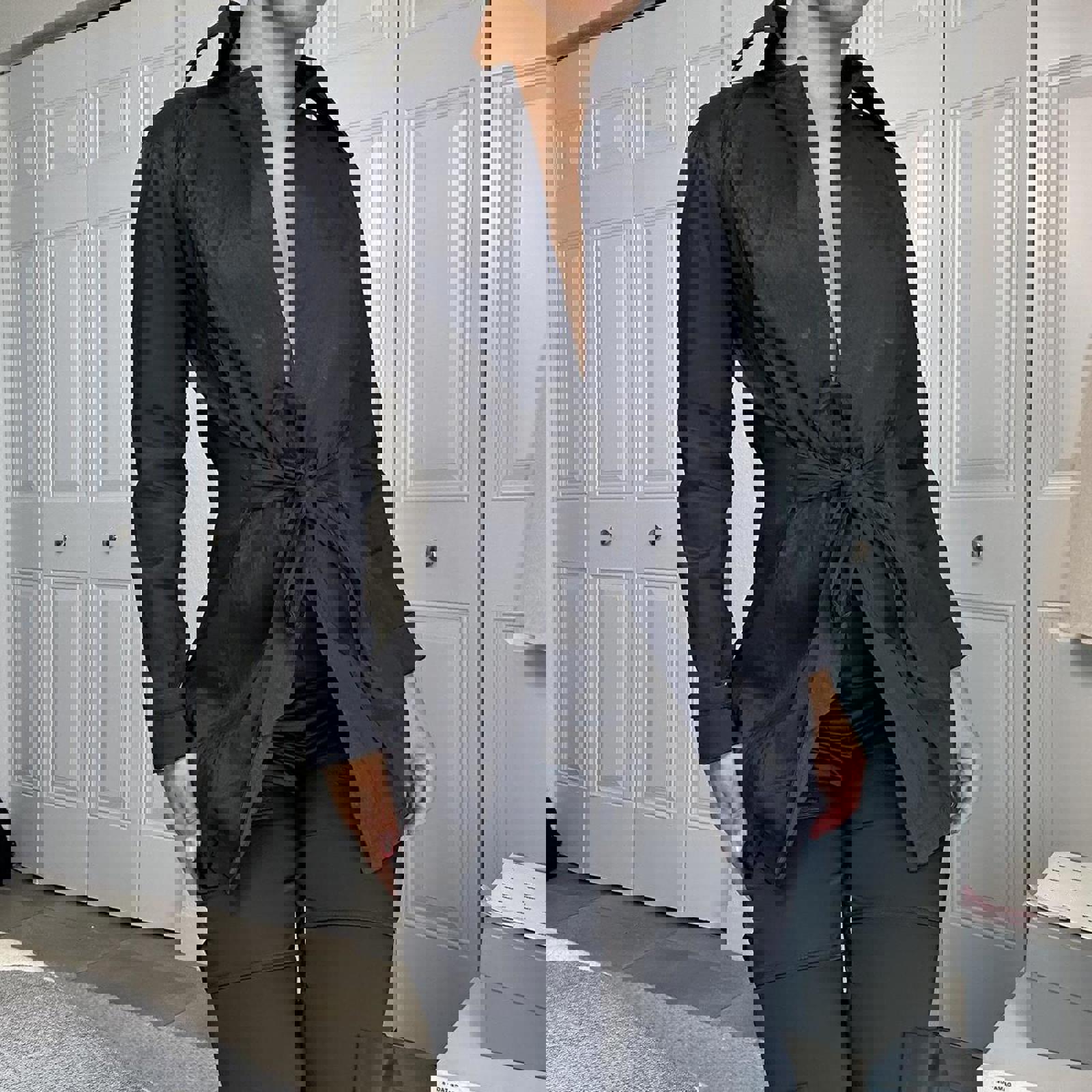 397. Black trench like jacket, no label, no size but fits like a small and has a really nice material, likely true vintage