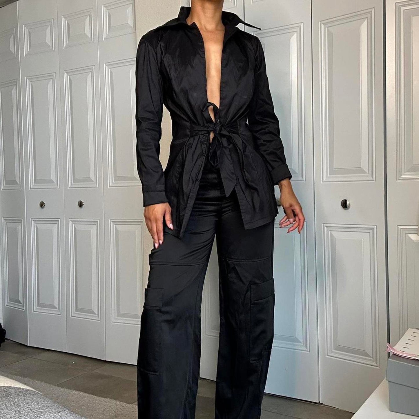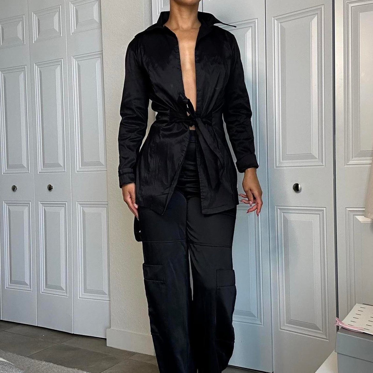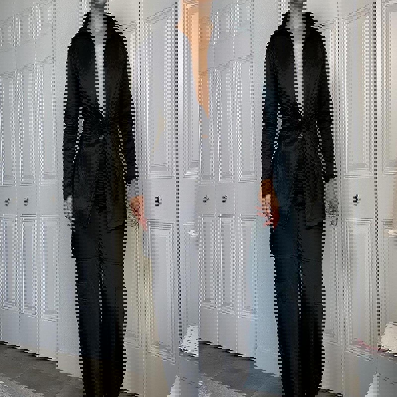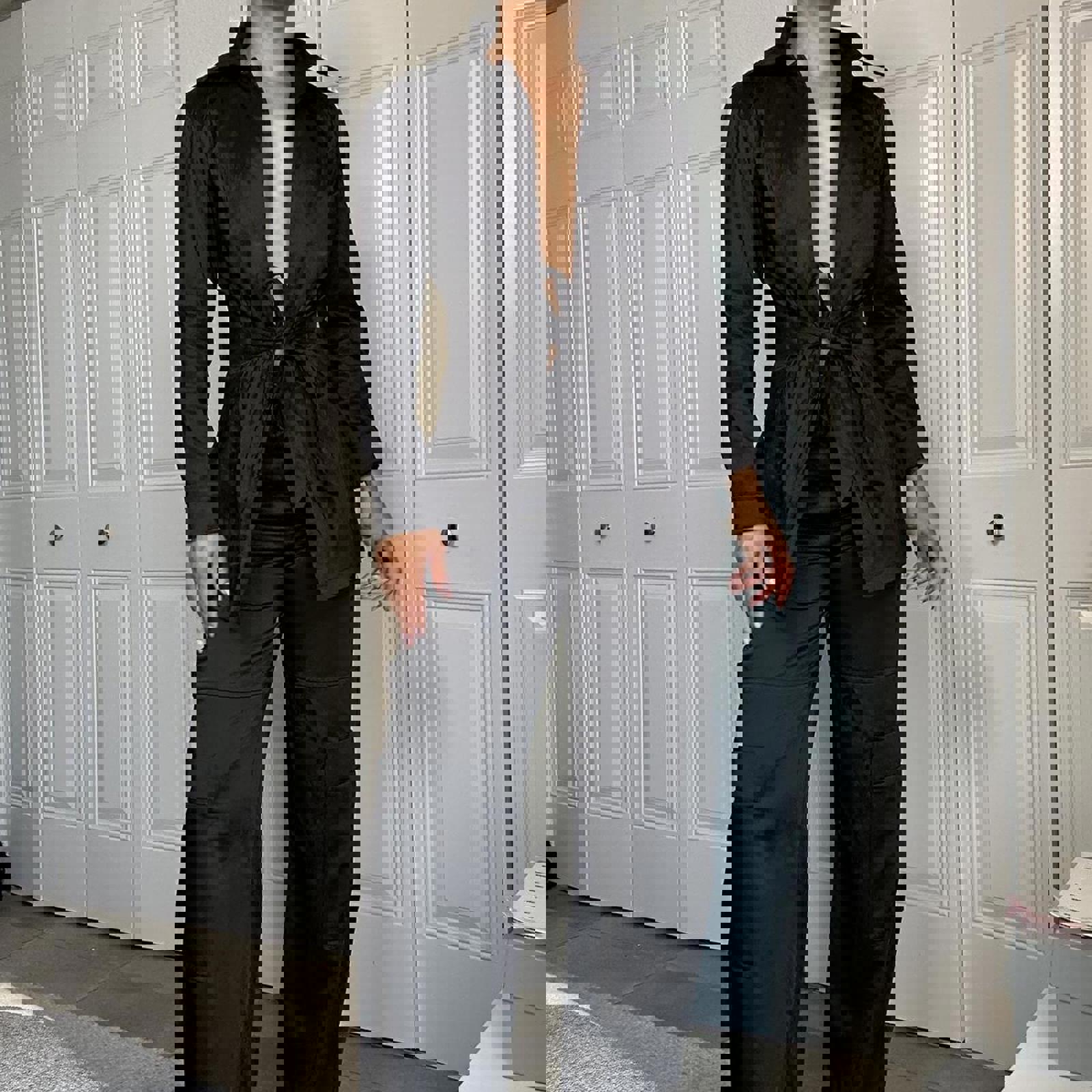 397. Black trench like jacket, no label, no size but fits like a small and has a really nice material, likely true vintage