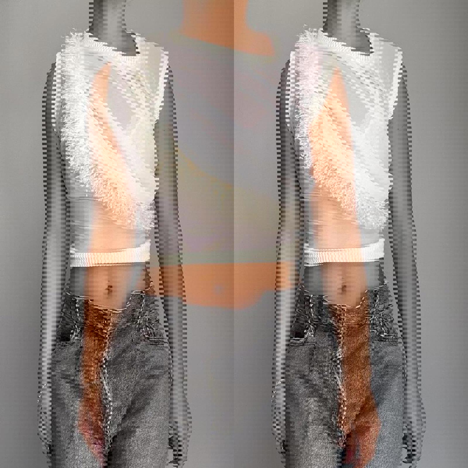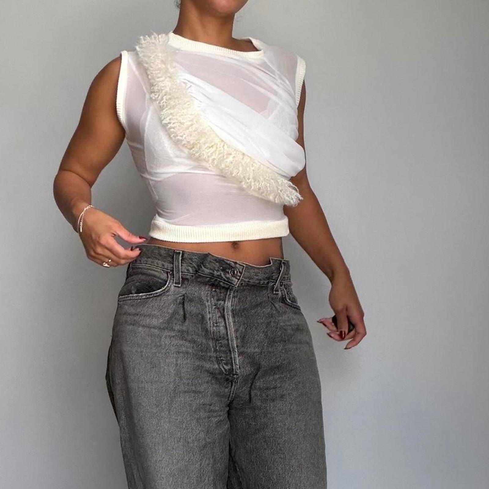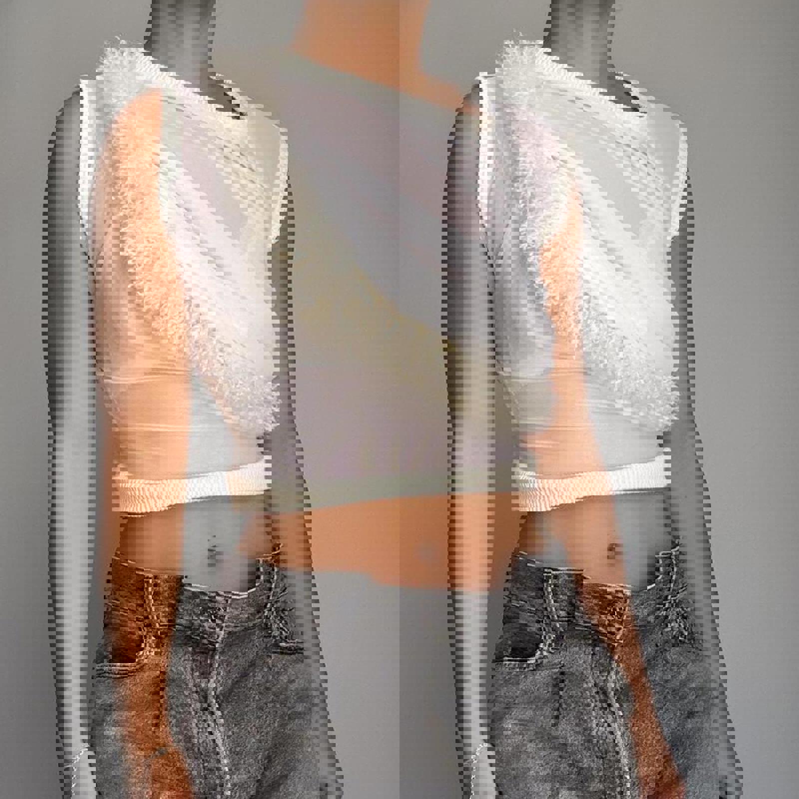 861. Vaquera cropped white and cream mesh top with Mongolian fur detail in the front.