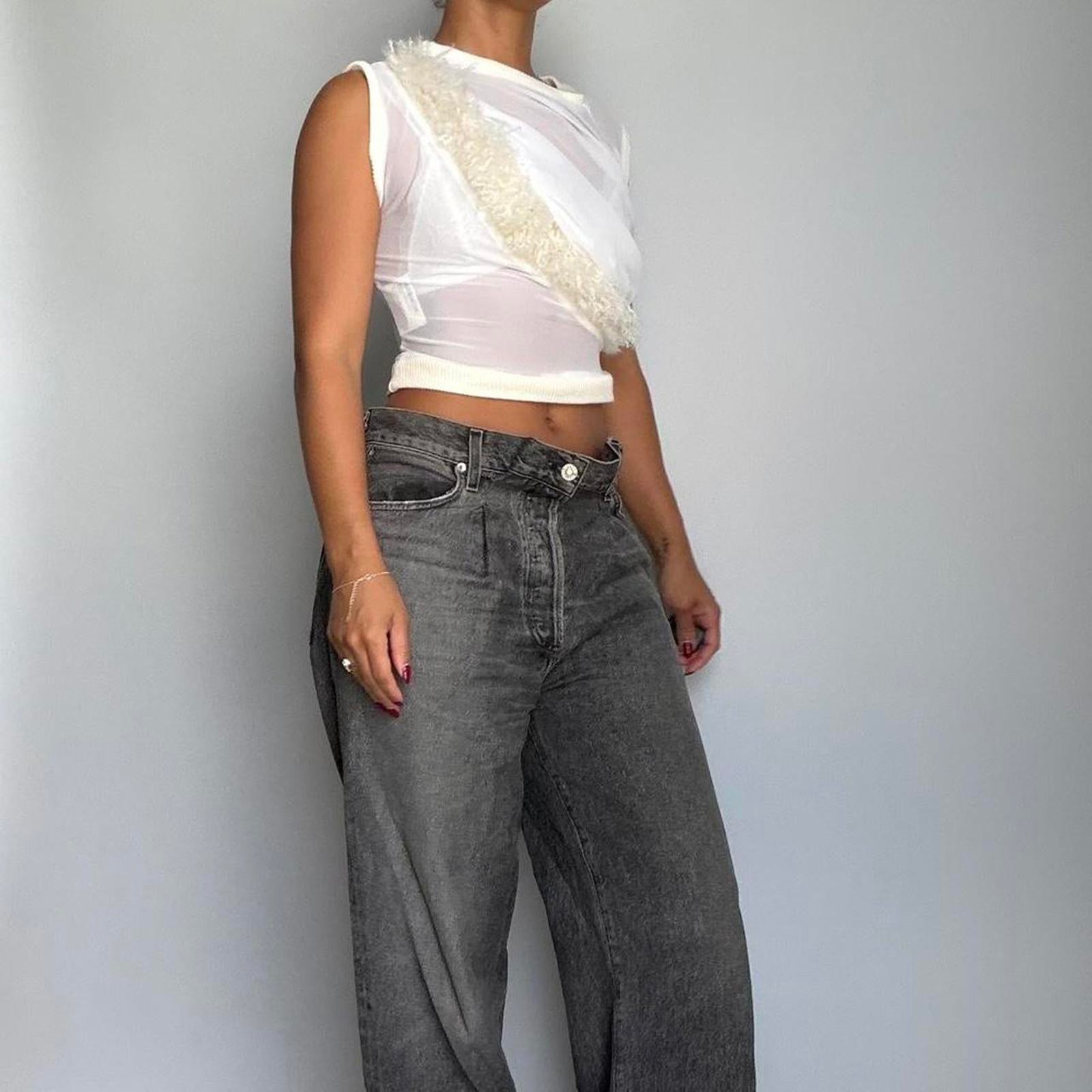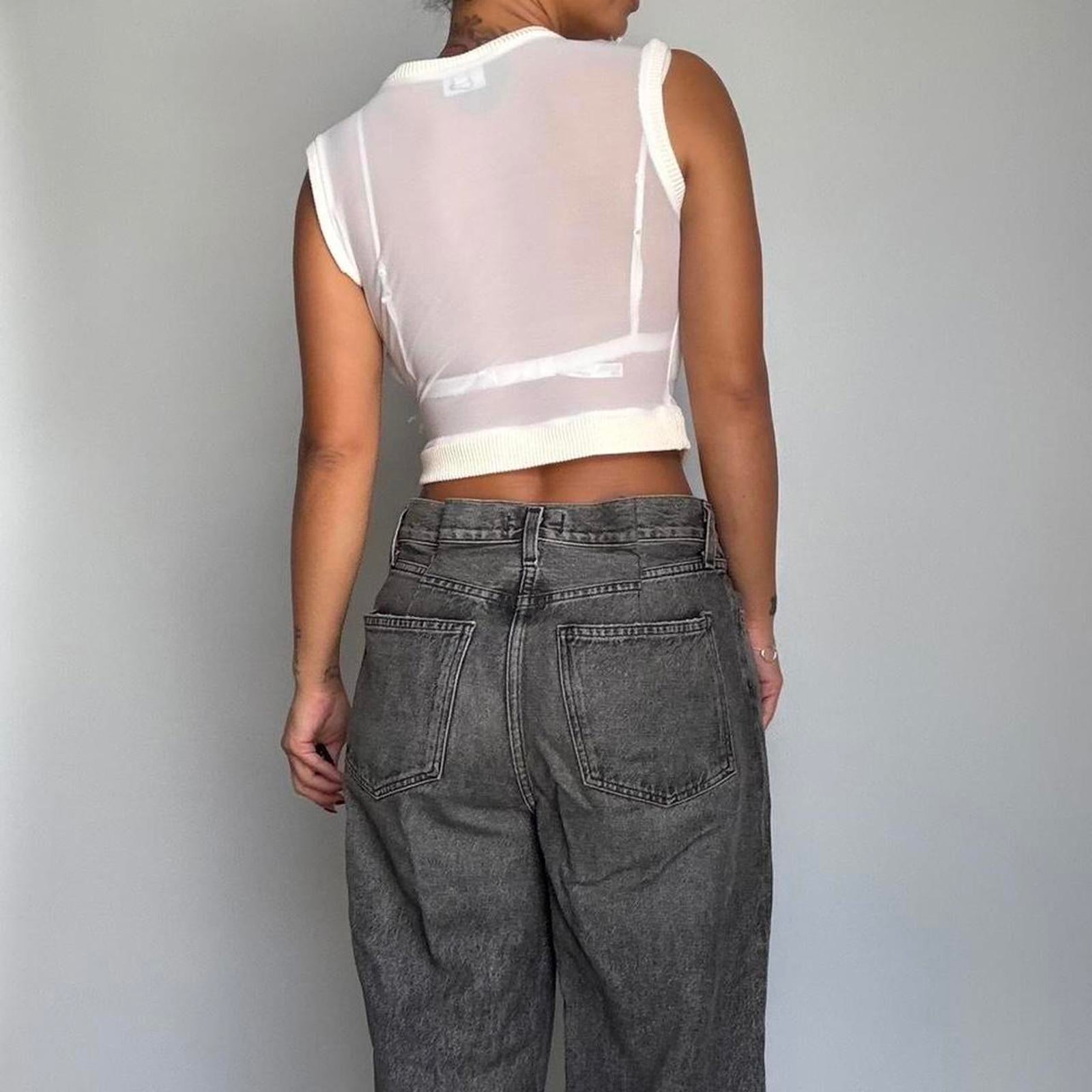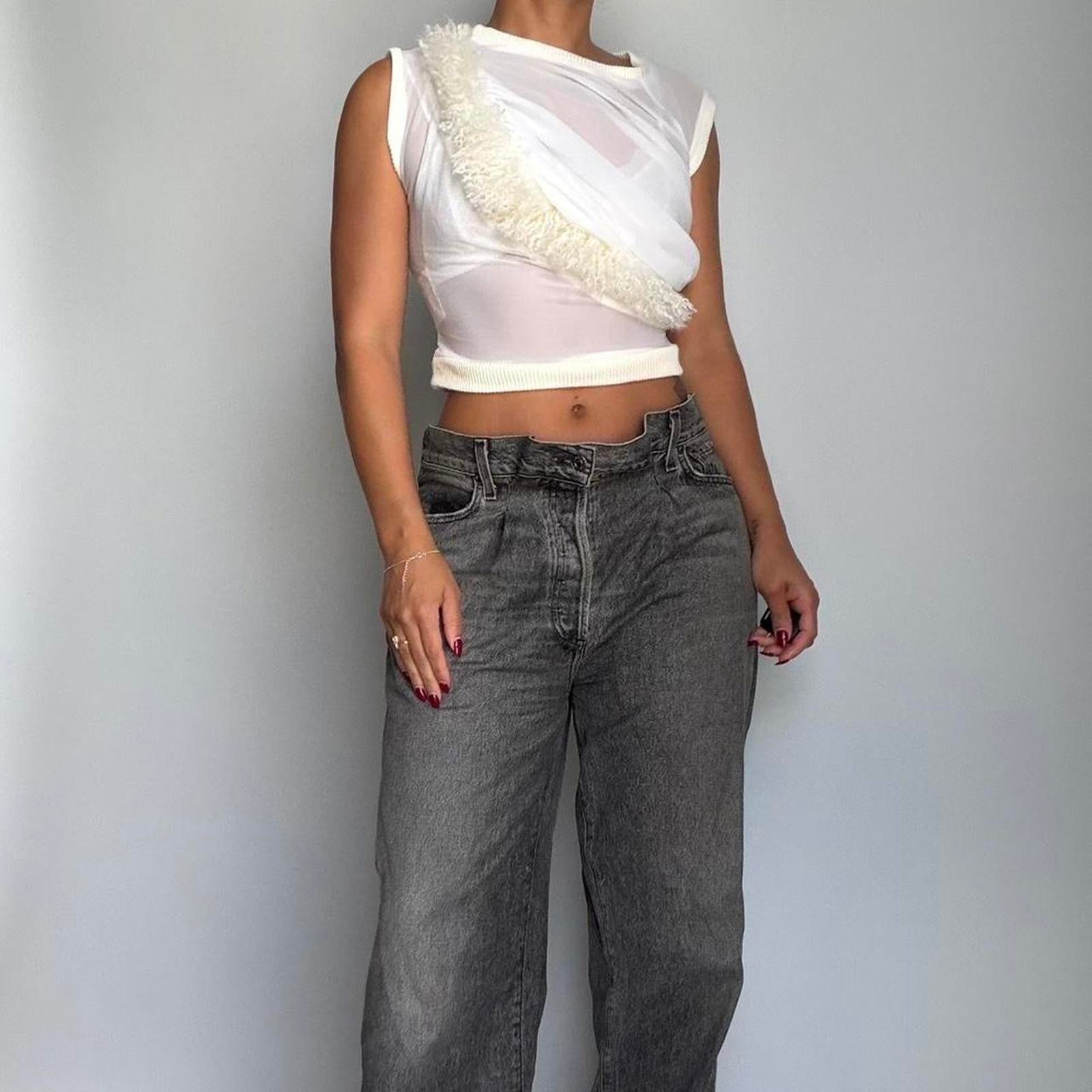 861. Vaquera cropped white and cream mesh top with Mongolian fur detail in the front.