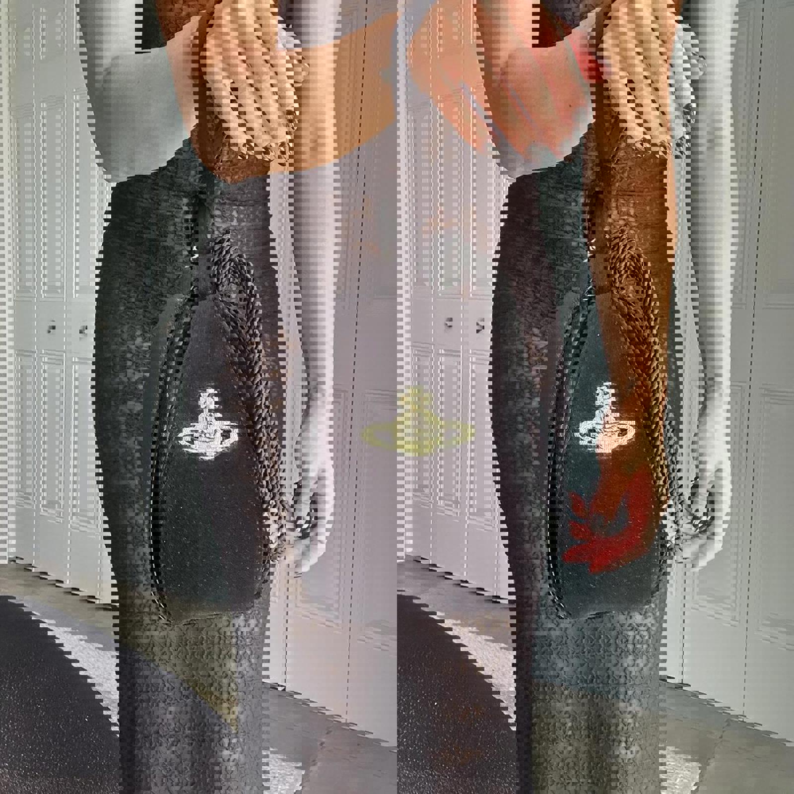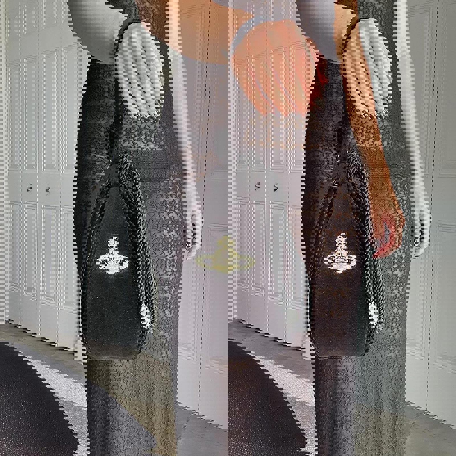 812. Vivienne Westwood black velvet bucket bag with top handle and rope closure. It's in perfect condition, the tag is still attached, and it's never been used. Comes with dustbag .Measurements are listed below: