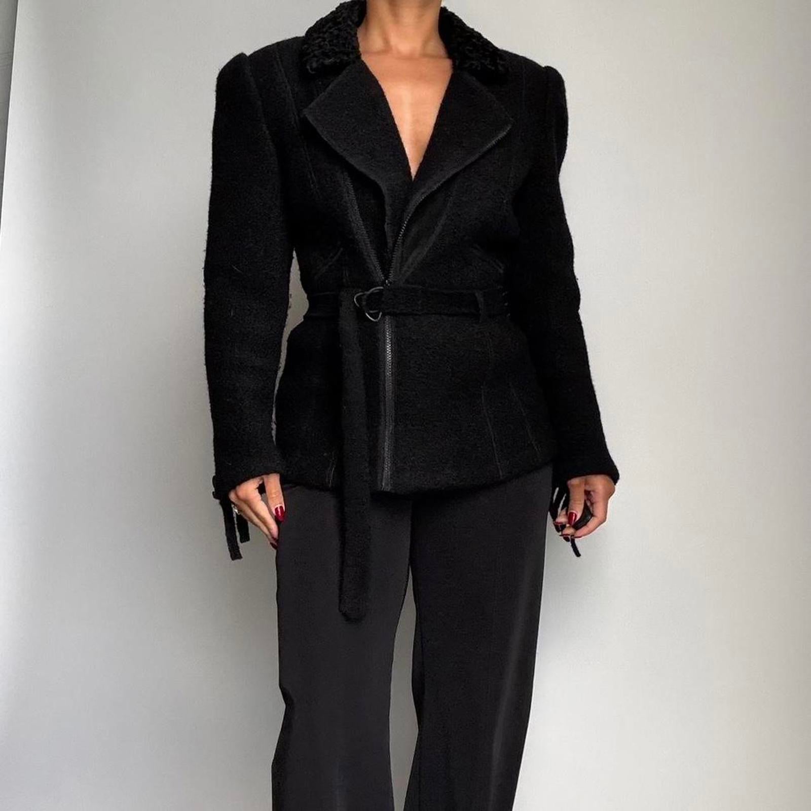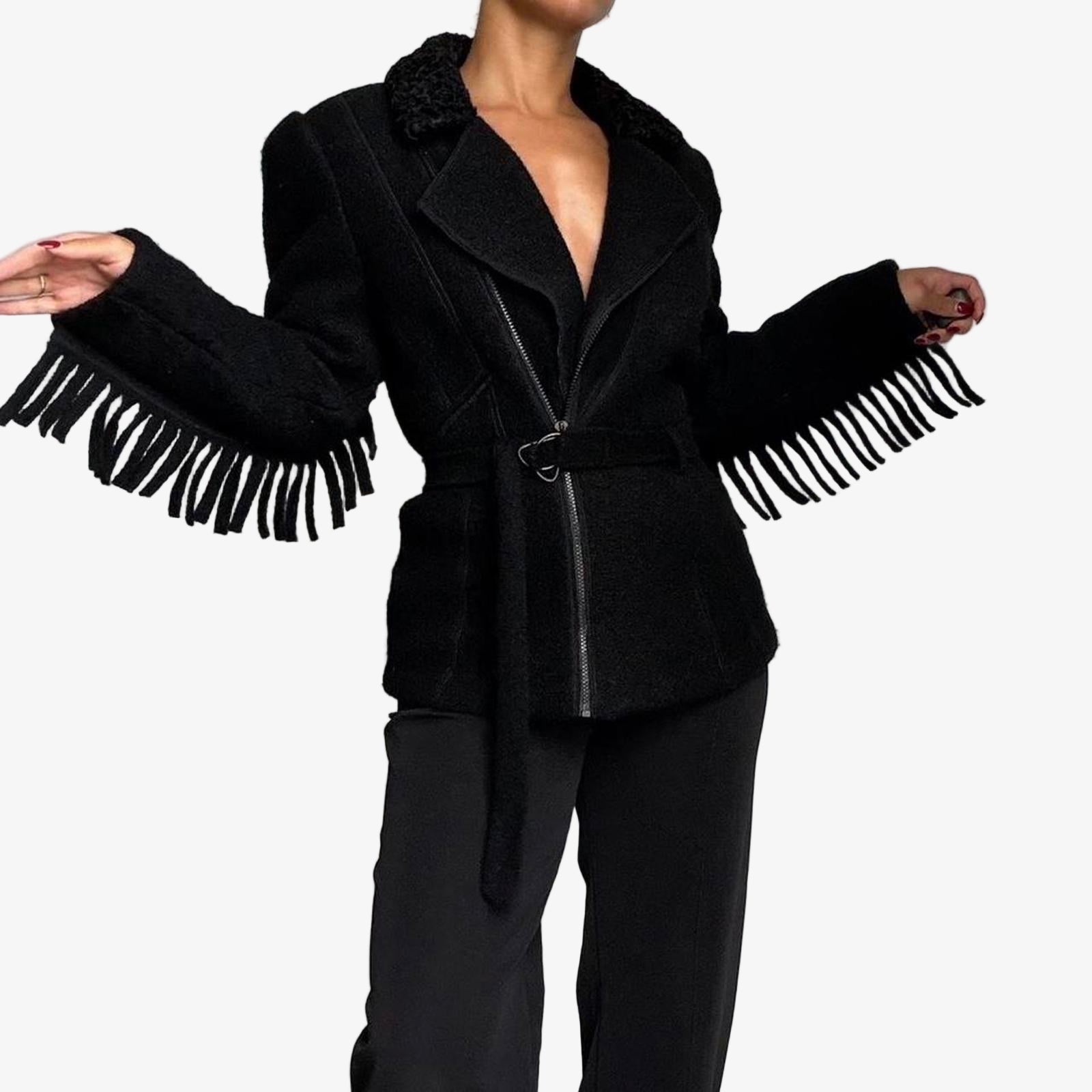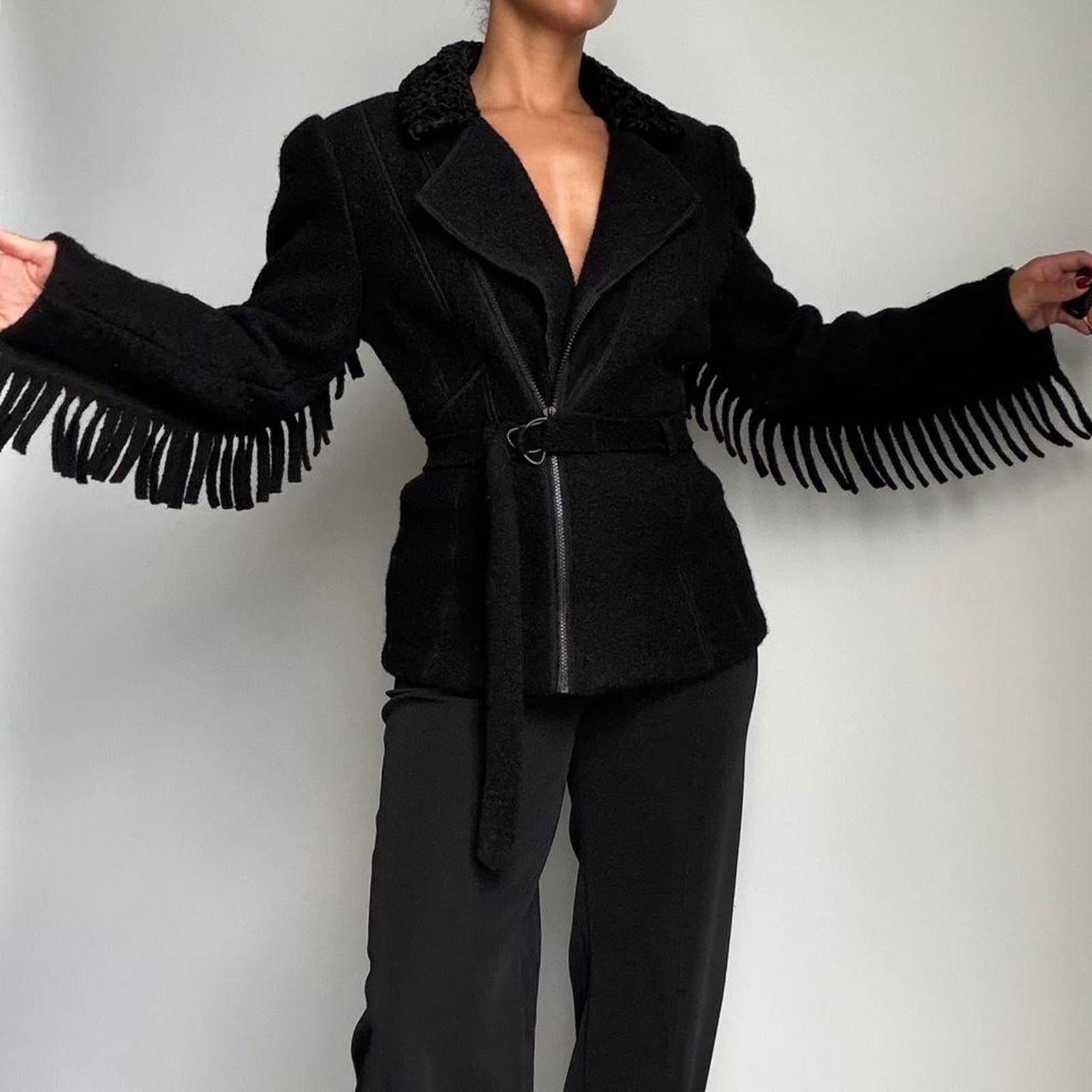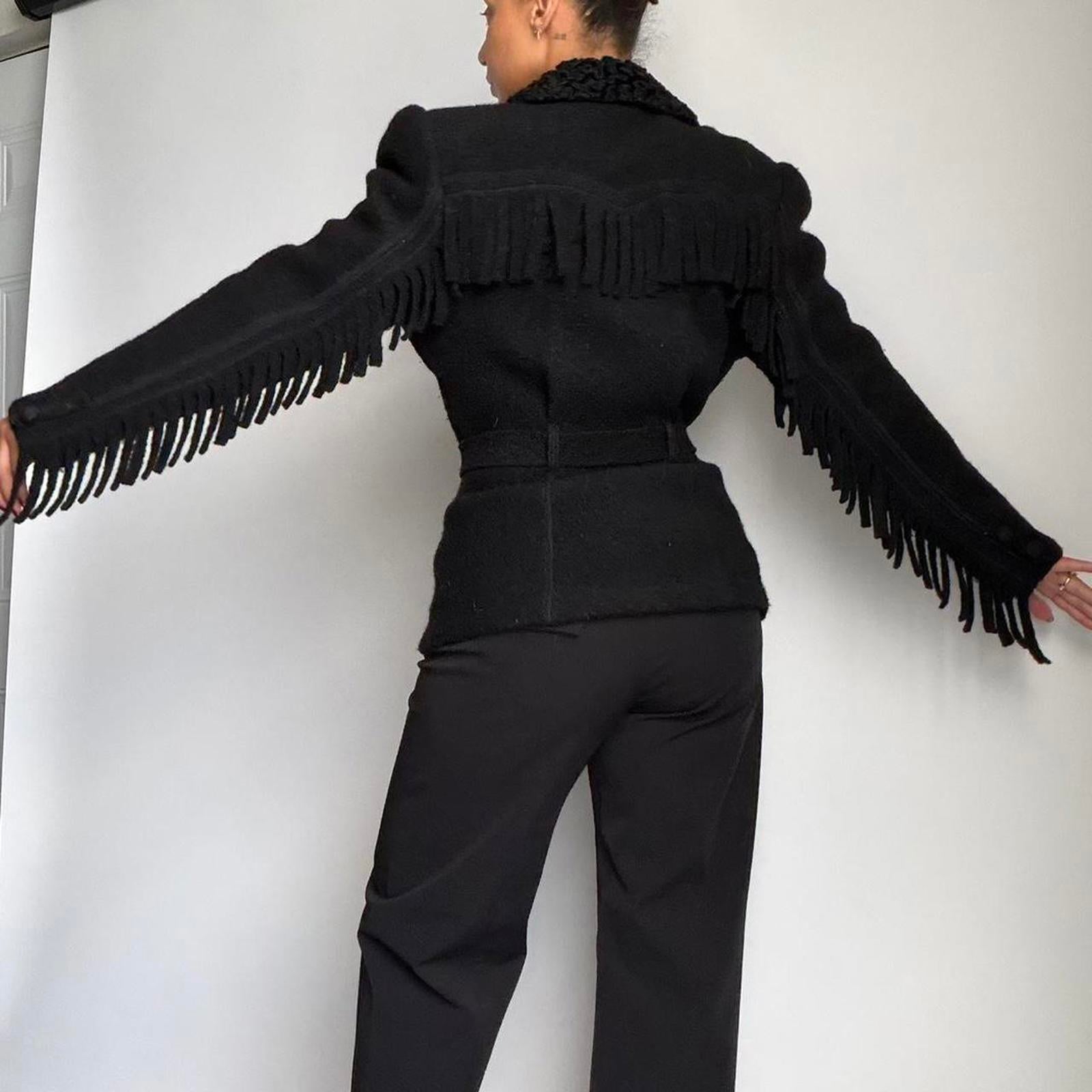 899. The most gorgeous vintage Wayne Rogers 100% wool jacket in mint condition. Has tassel sleeves and back and comes with adjustable belt. A real piece. Labeled a size 6, shown on a size small, however, measurements are listed below.