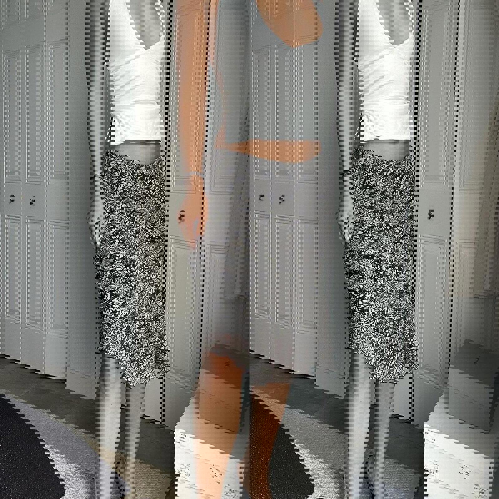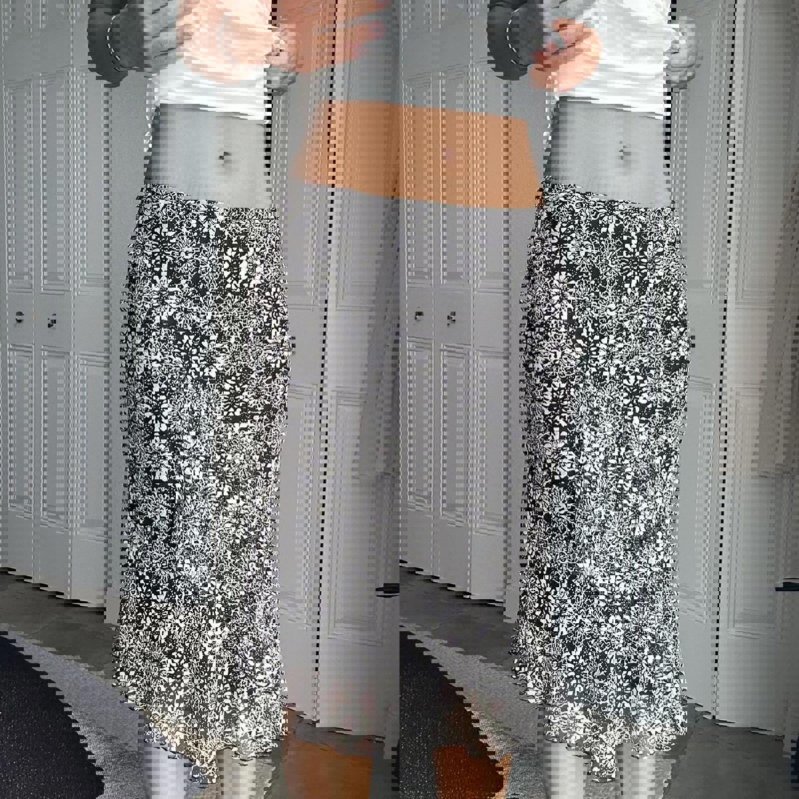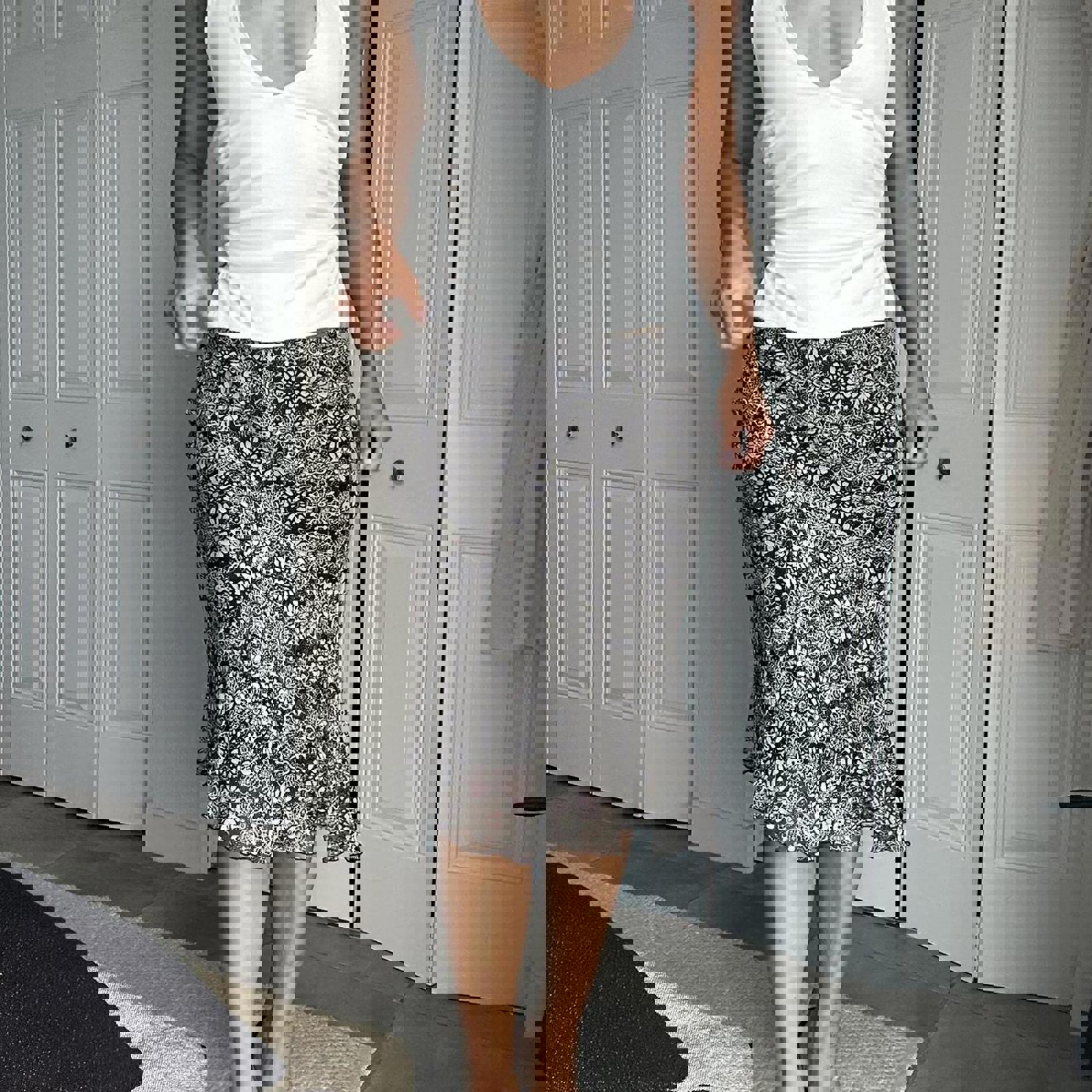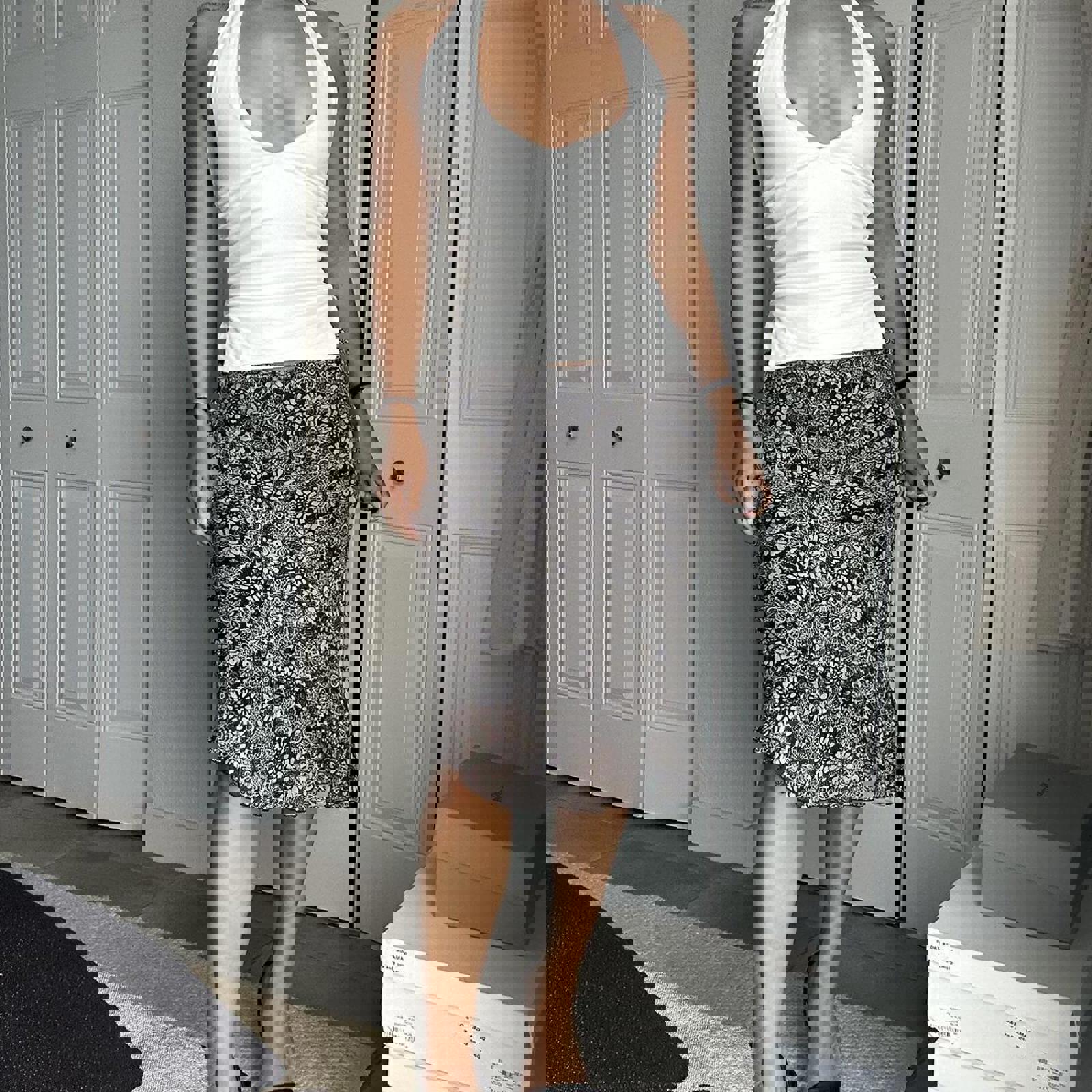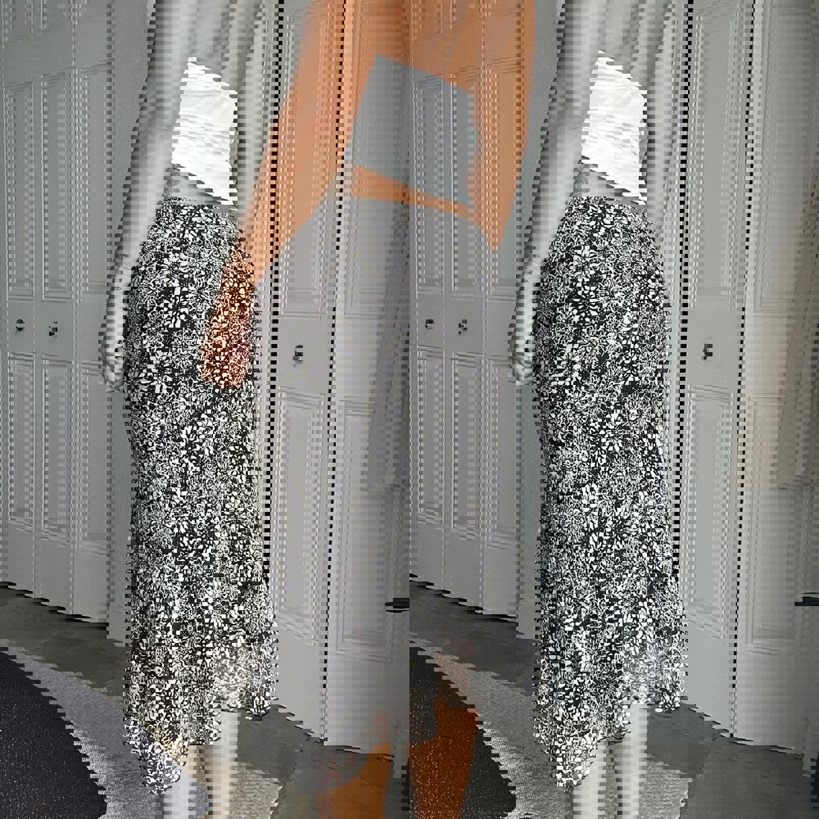 346. 100% silk Allison Taylor skirt in a size medium. I would say if it fits like a small medium. Flower detailing black and cream coloring. In perfect vintage condition