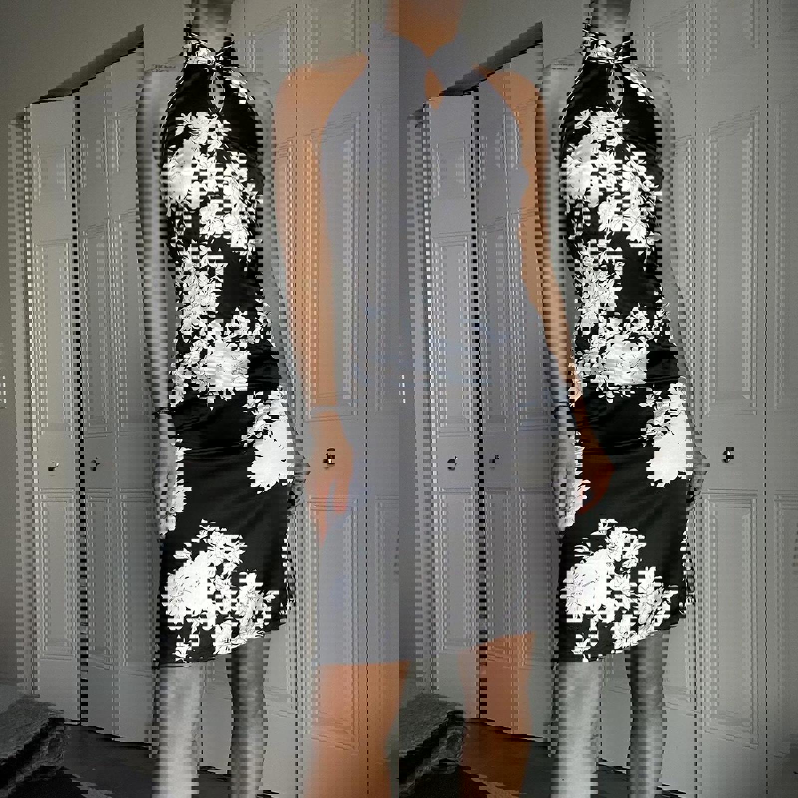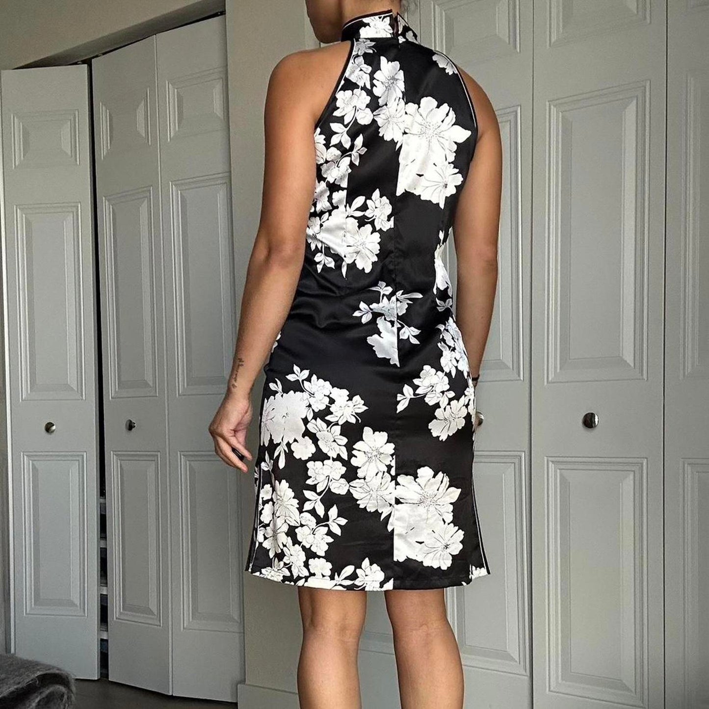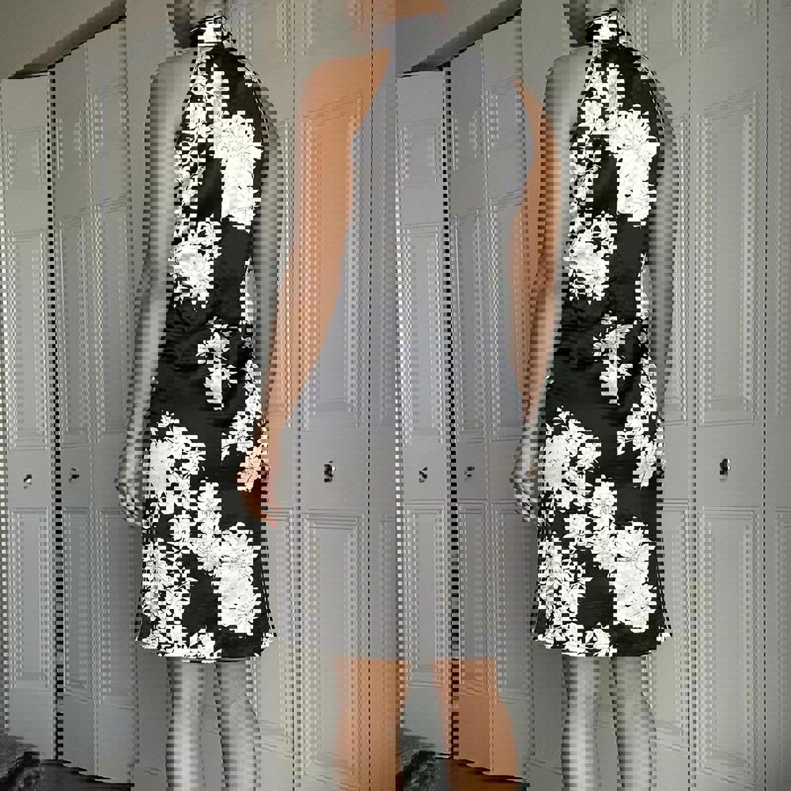 150. Mao collar dress by Danica. Black dress with white flower detail, high color with button closure. Size 40, fits like a small