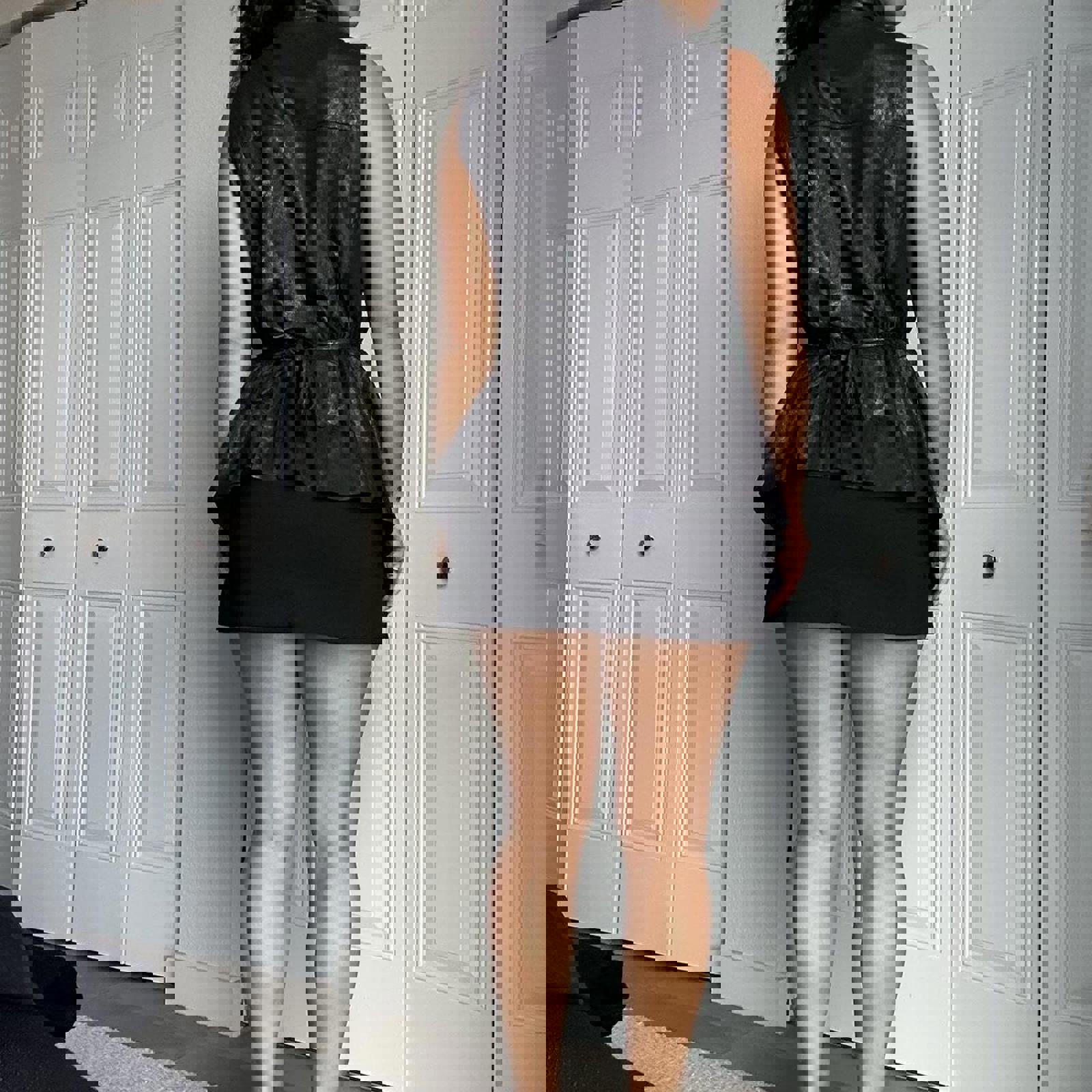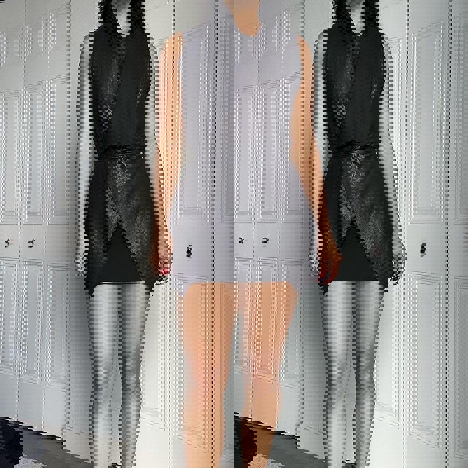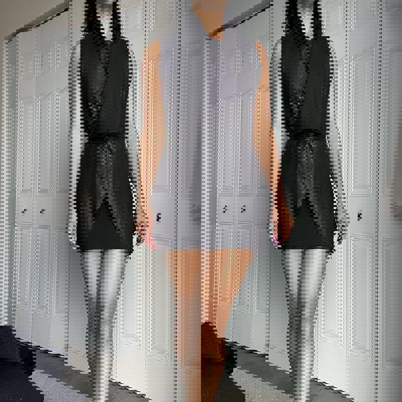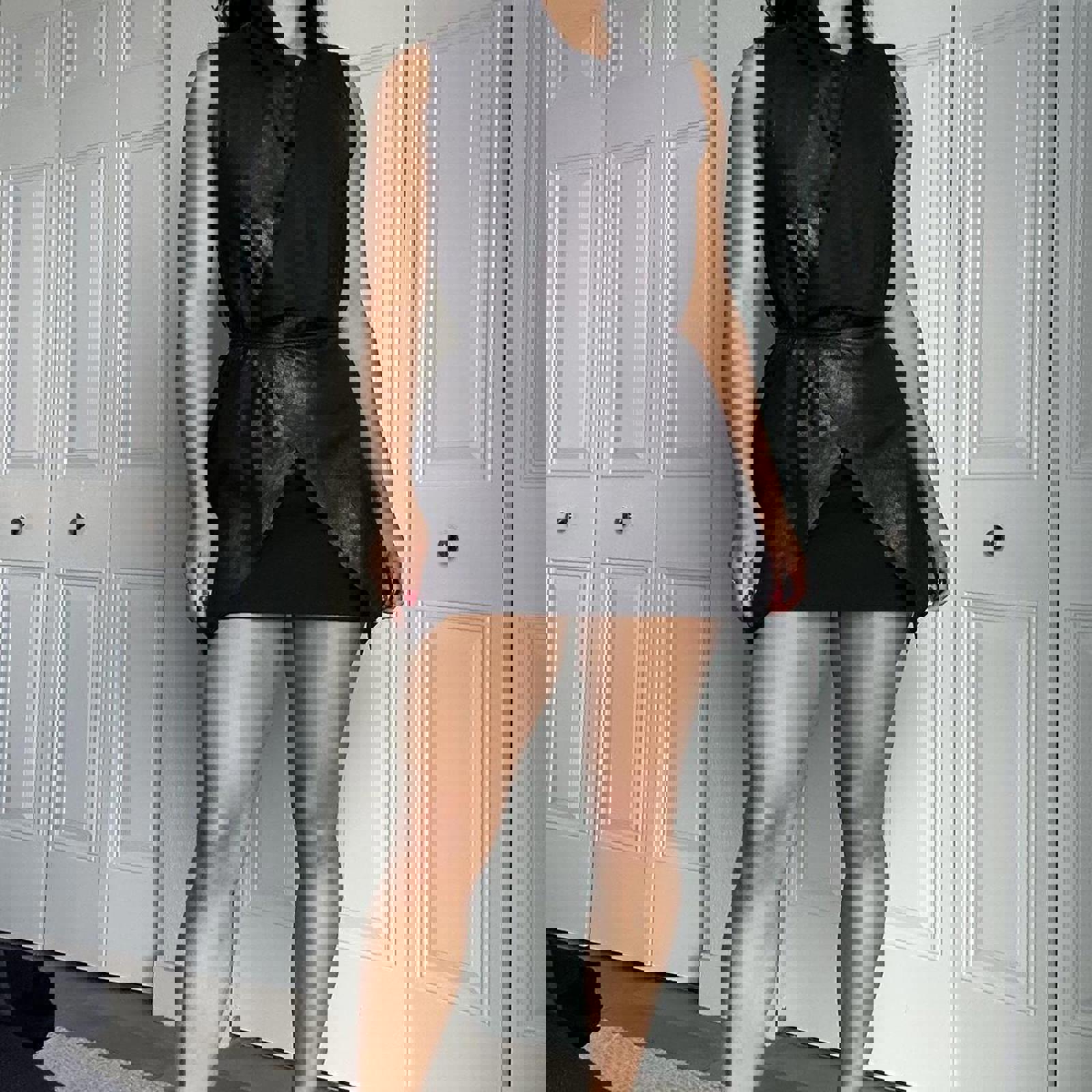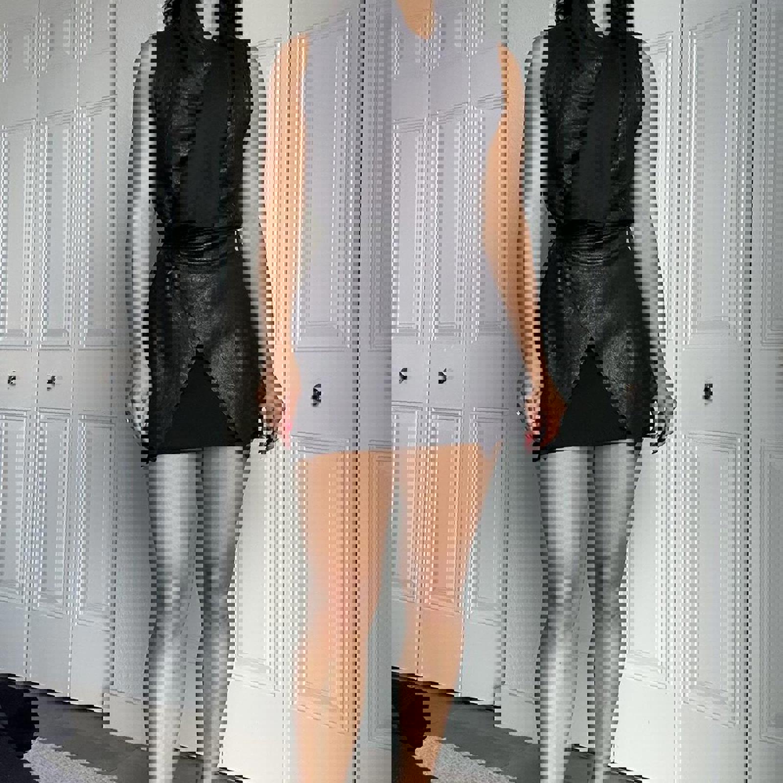lamb leather, shiny finish, wrap vest, oversized fit, edgy style, minimalistic, fashion-forward, tie closure, sleek design, modern silhouette