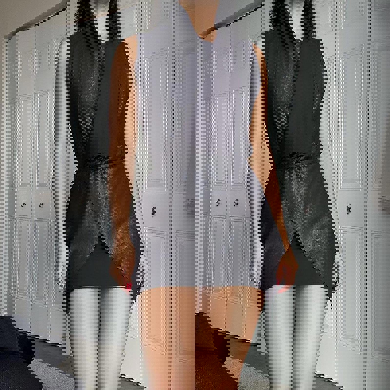 756. Bagatelle wrap vest in a size medium, perfect condition, has a very Rick Owens vibe to it. Kind of shiny lamb leather look on the outside. Shown on a small. Comes with wrap tie.