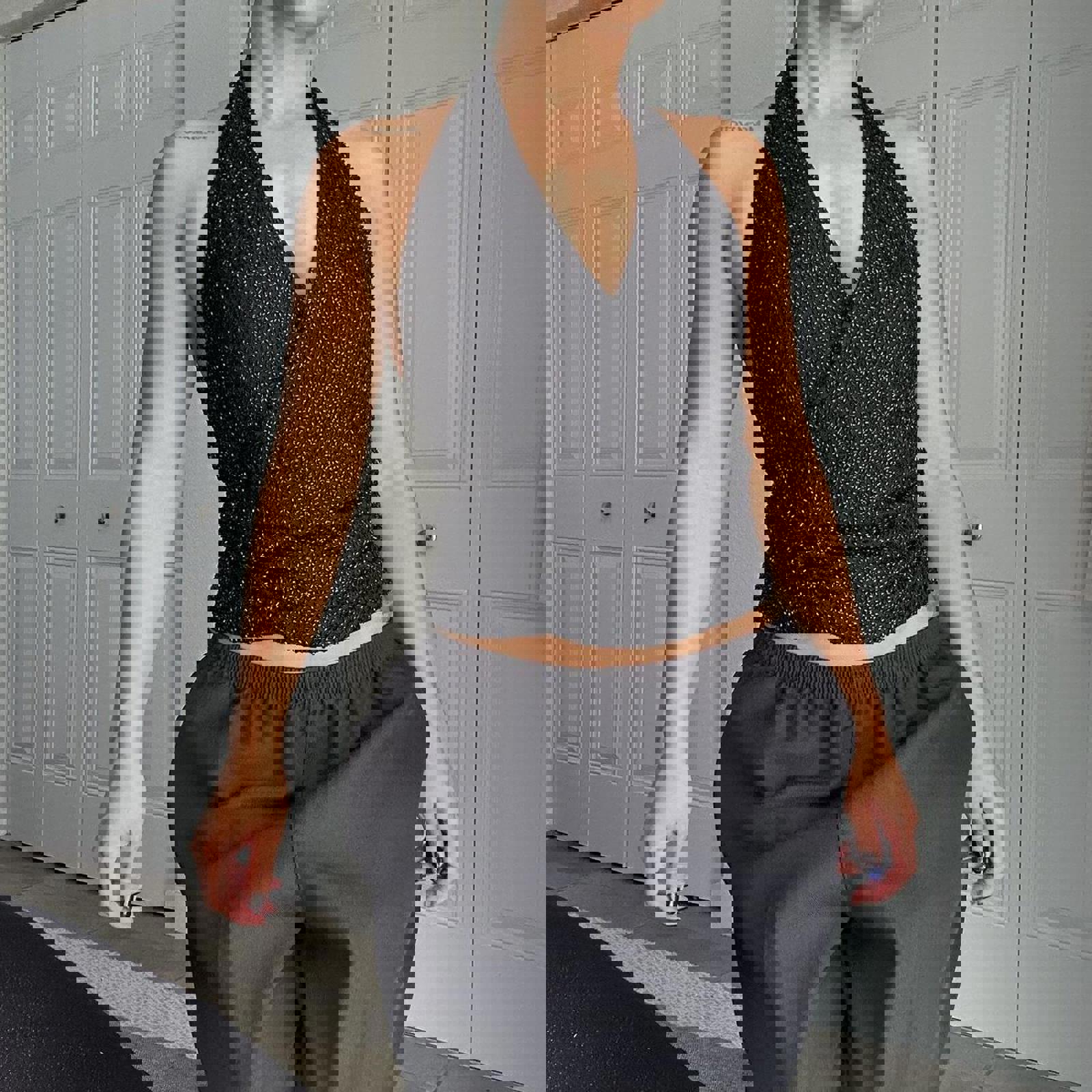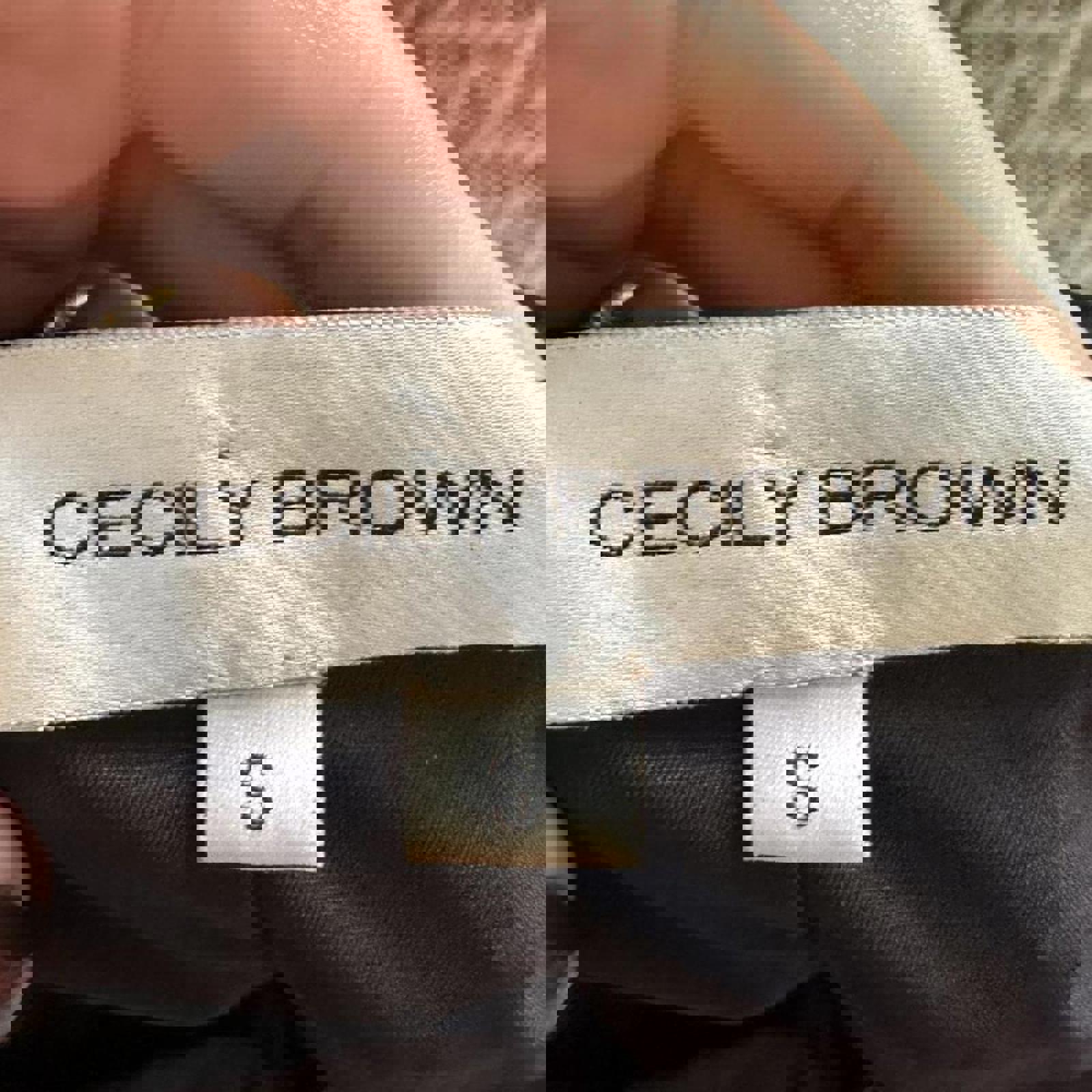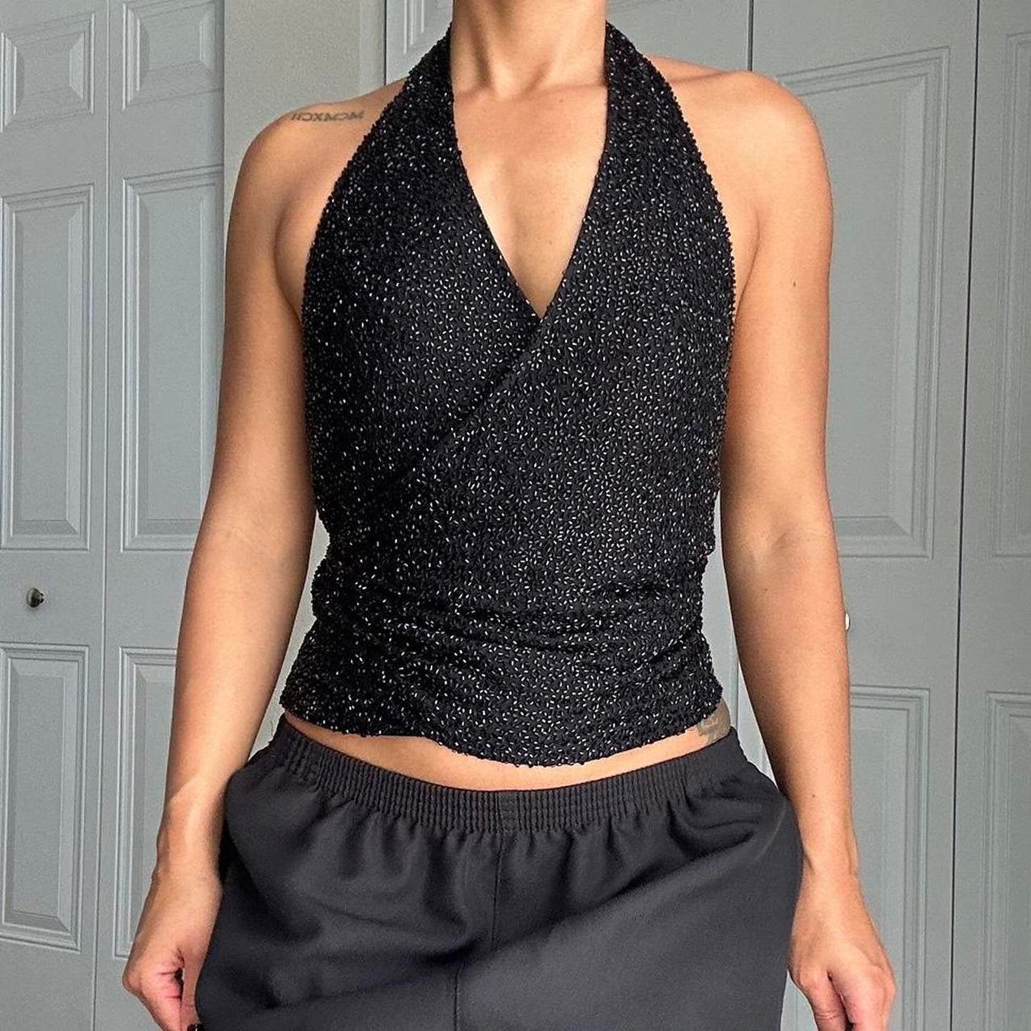 254. Cecily Brown fully beaded vintage top in perfect condition. It is a halter top that has padding built-in and eyelet hooks on the inside and the outside to really wrap your waist. It is in perfect condition, 100% silk. Measurements are listed below.