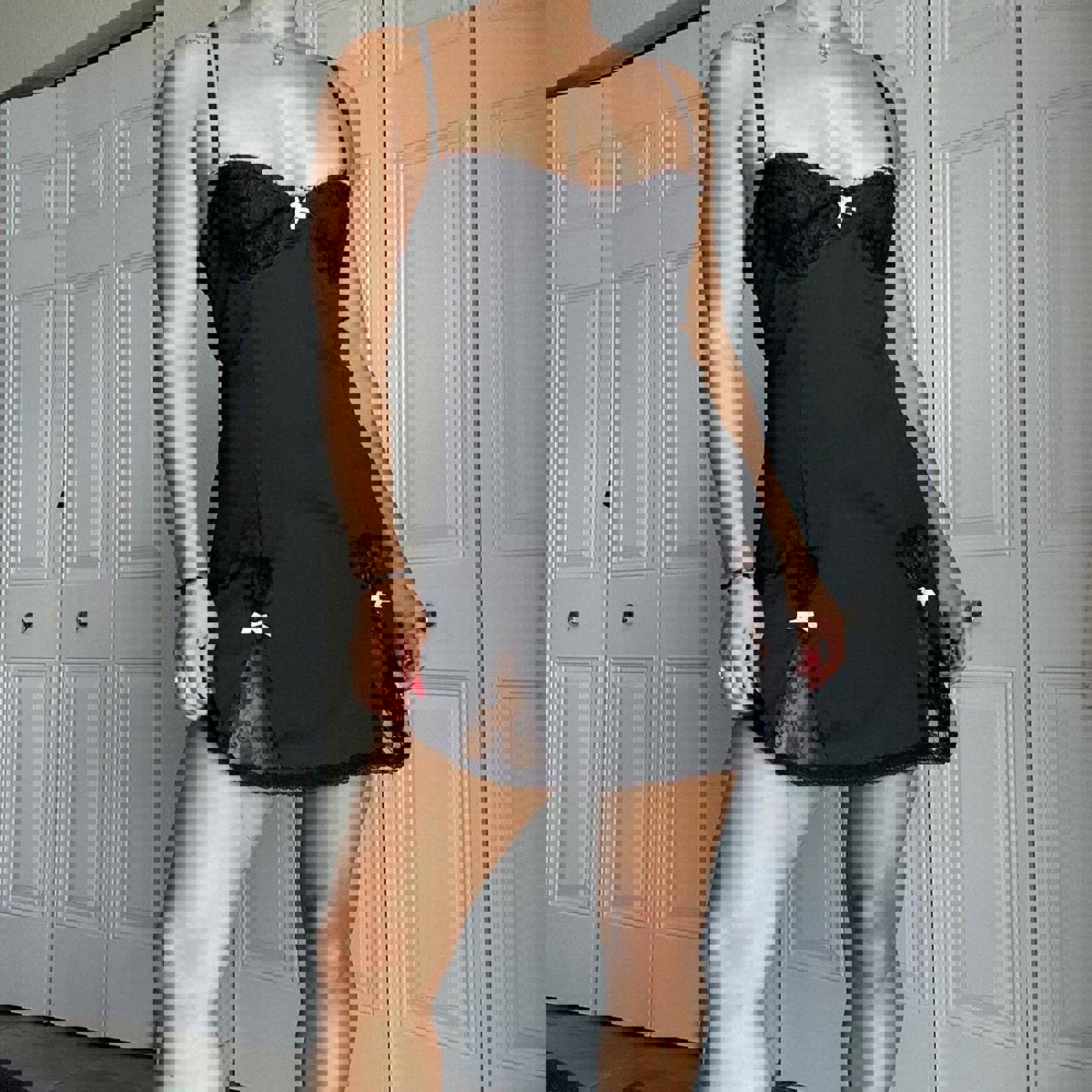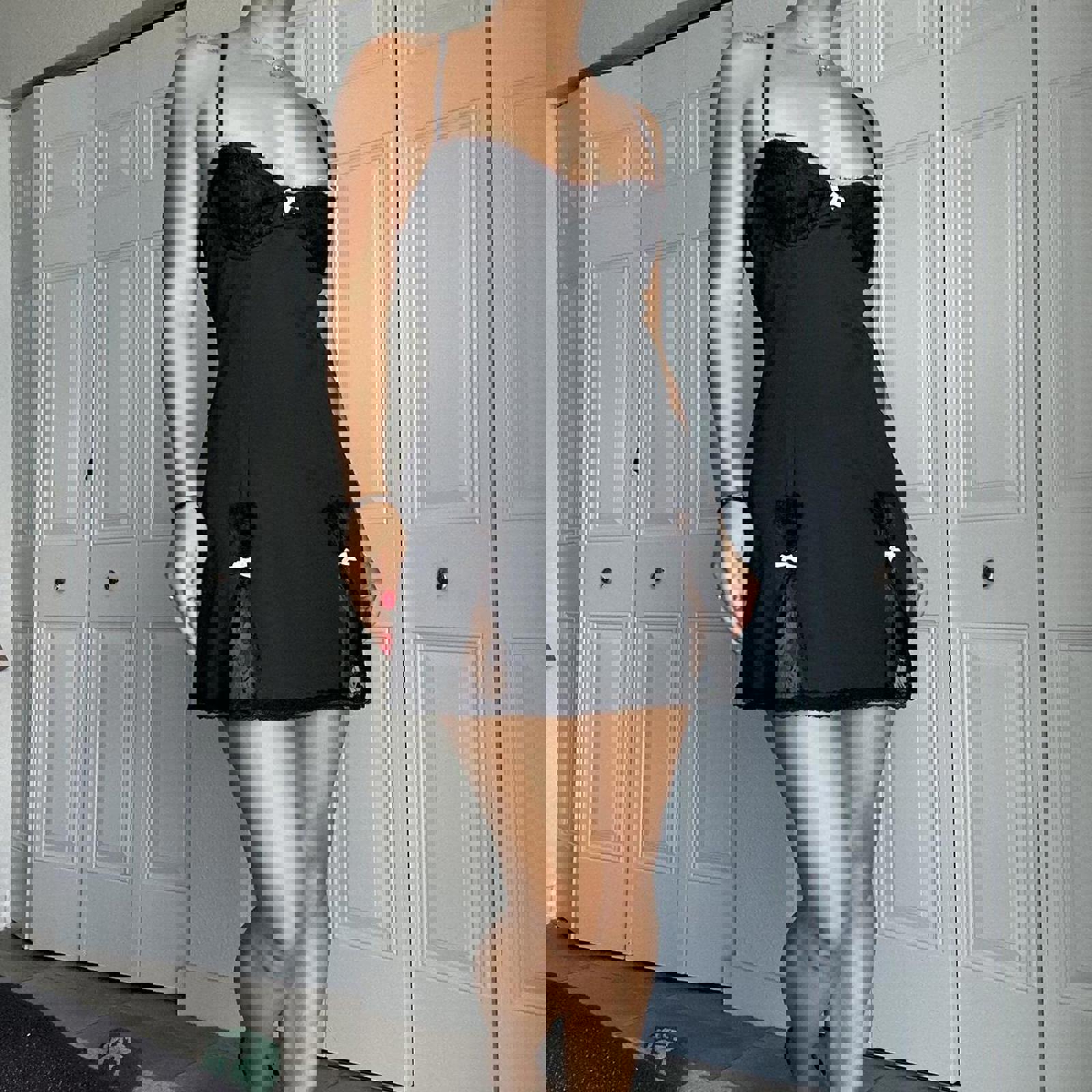 658. Pink and black lace baby doll dress with heart shaped lace pieces on the front. so adorable. This stress has no brand tag but does show as a size large. I would say it fits more like a small or medium
