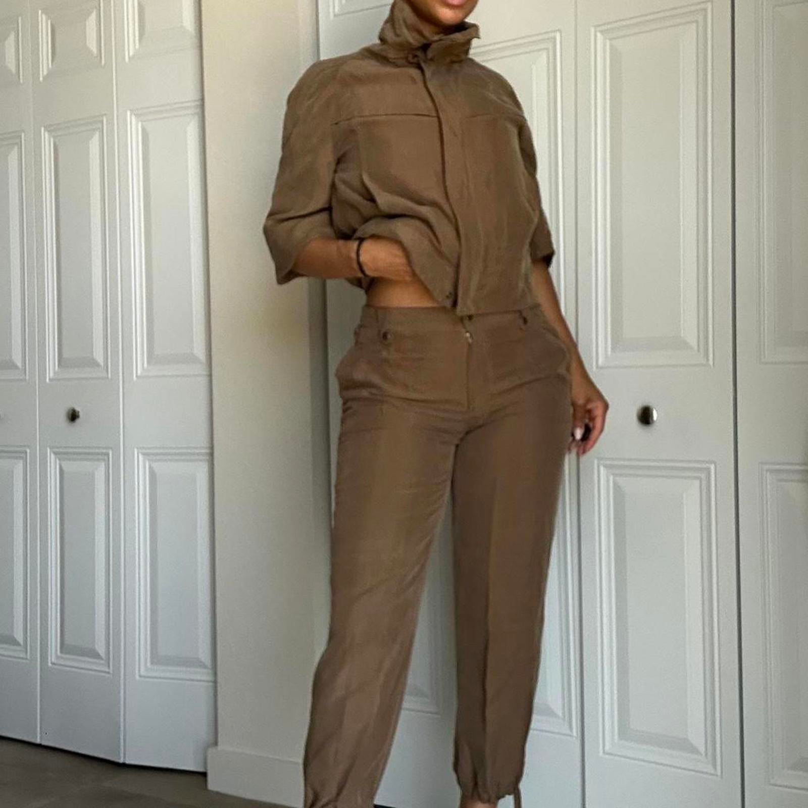 391. 100% silk high neck utility jacket Tan and brown Elliott Lauren set. Feels like suede. In absolutely excellent condition. Sleeves on top or three-quarter length #tan #brown