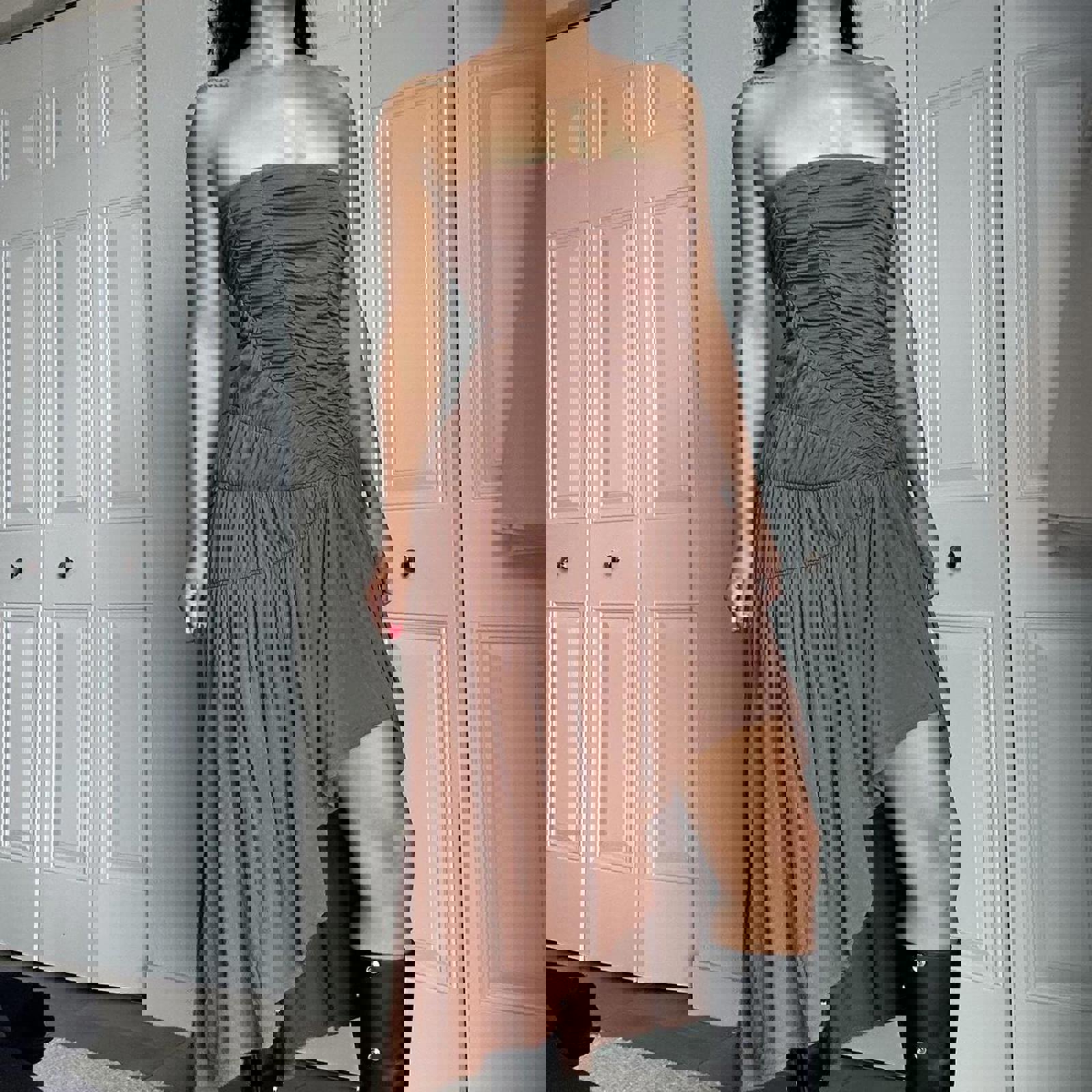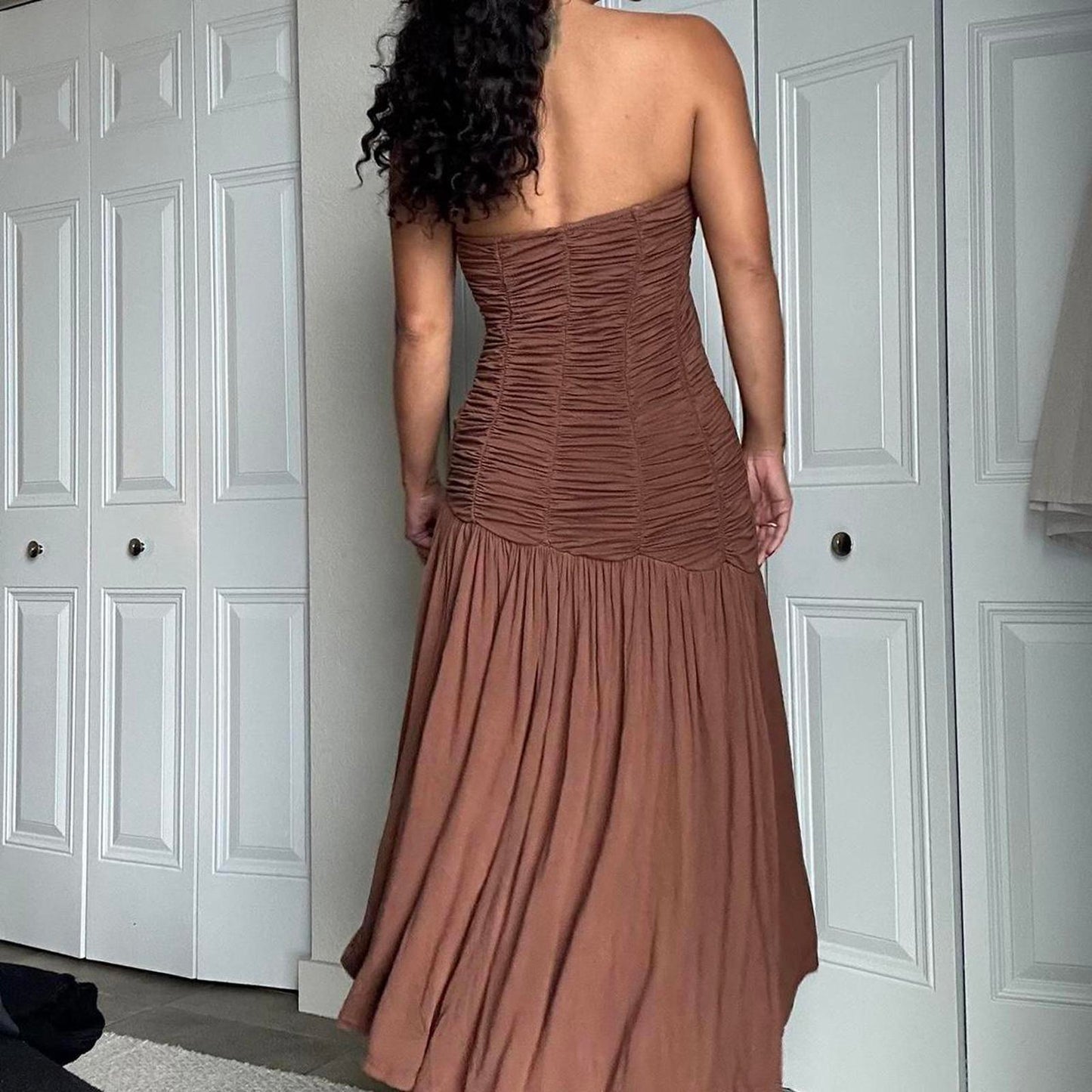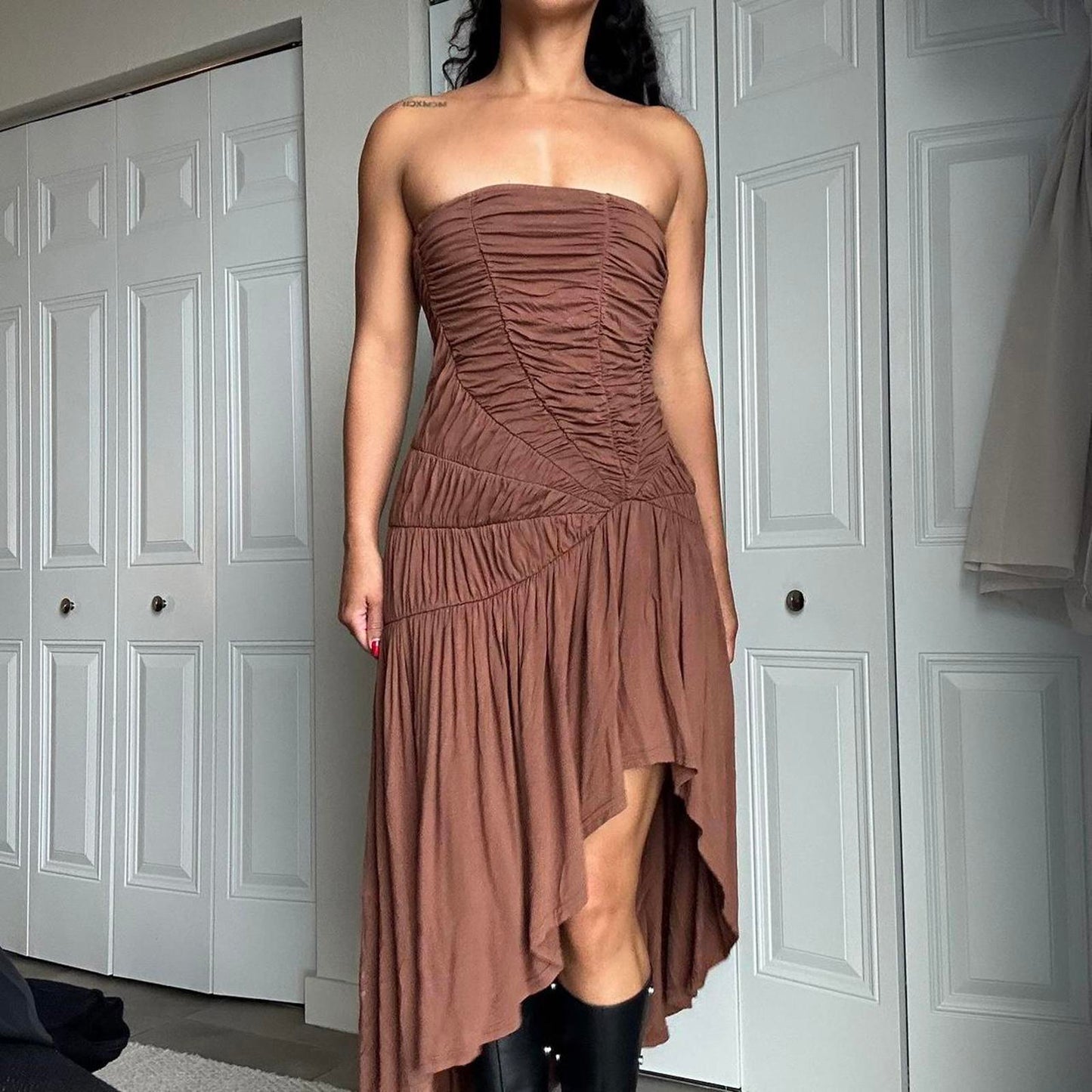 773. Celine Dean Brown Ruched Midi Dress with Asymmetrical Hem. Chocolate brown color in perfect condition. Has tons of stretch. It is a size medium shown on a size small. Measurements laying flat listed below.