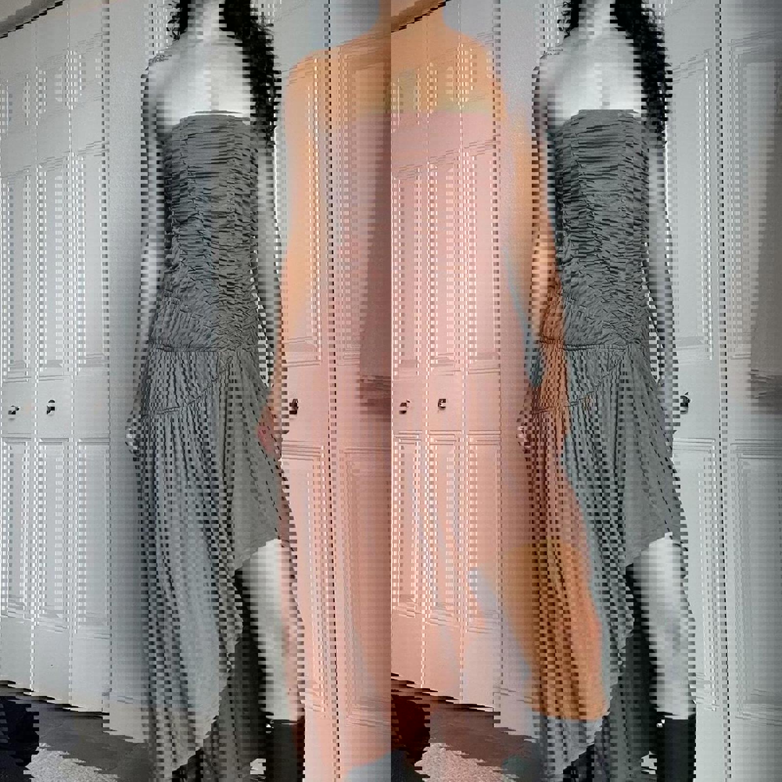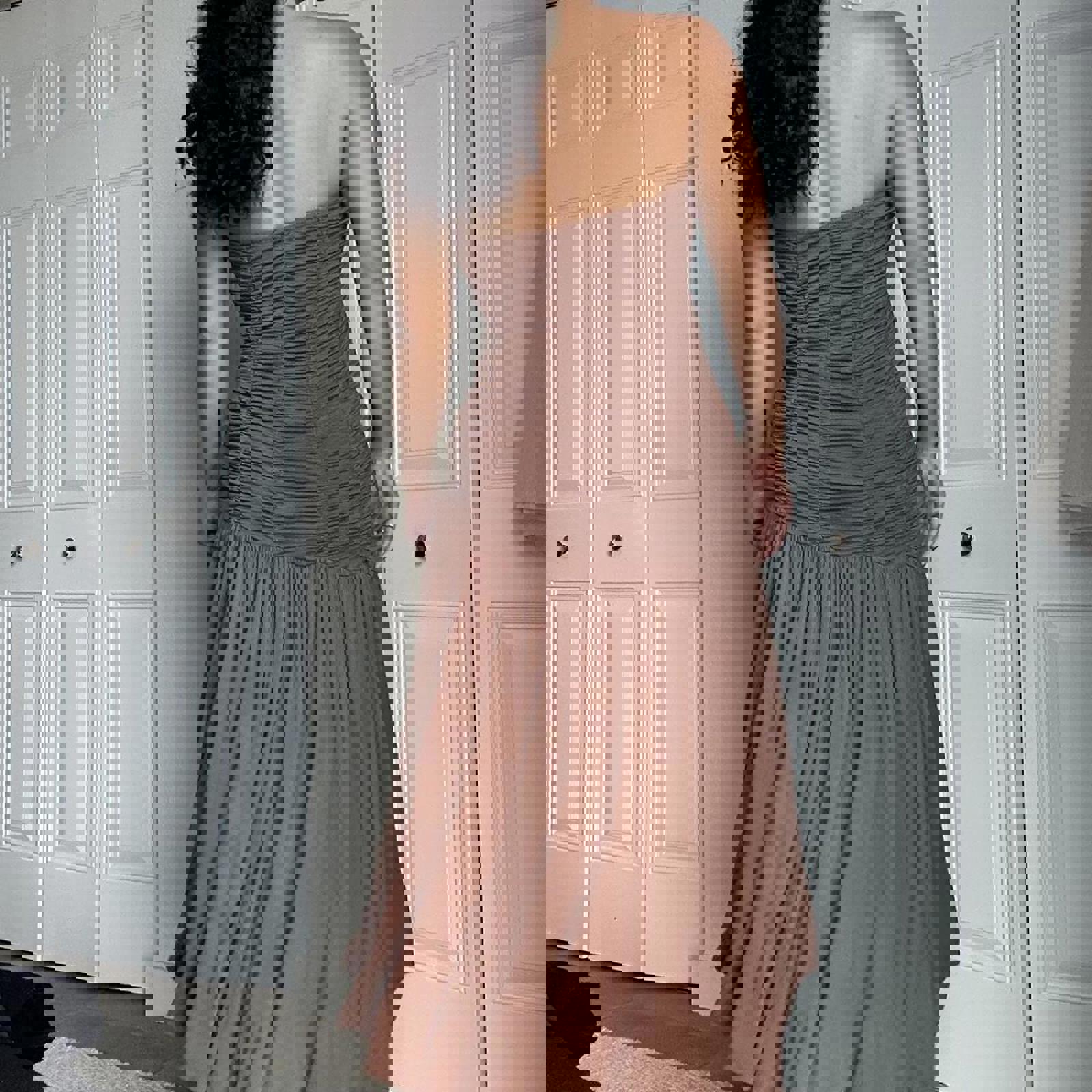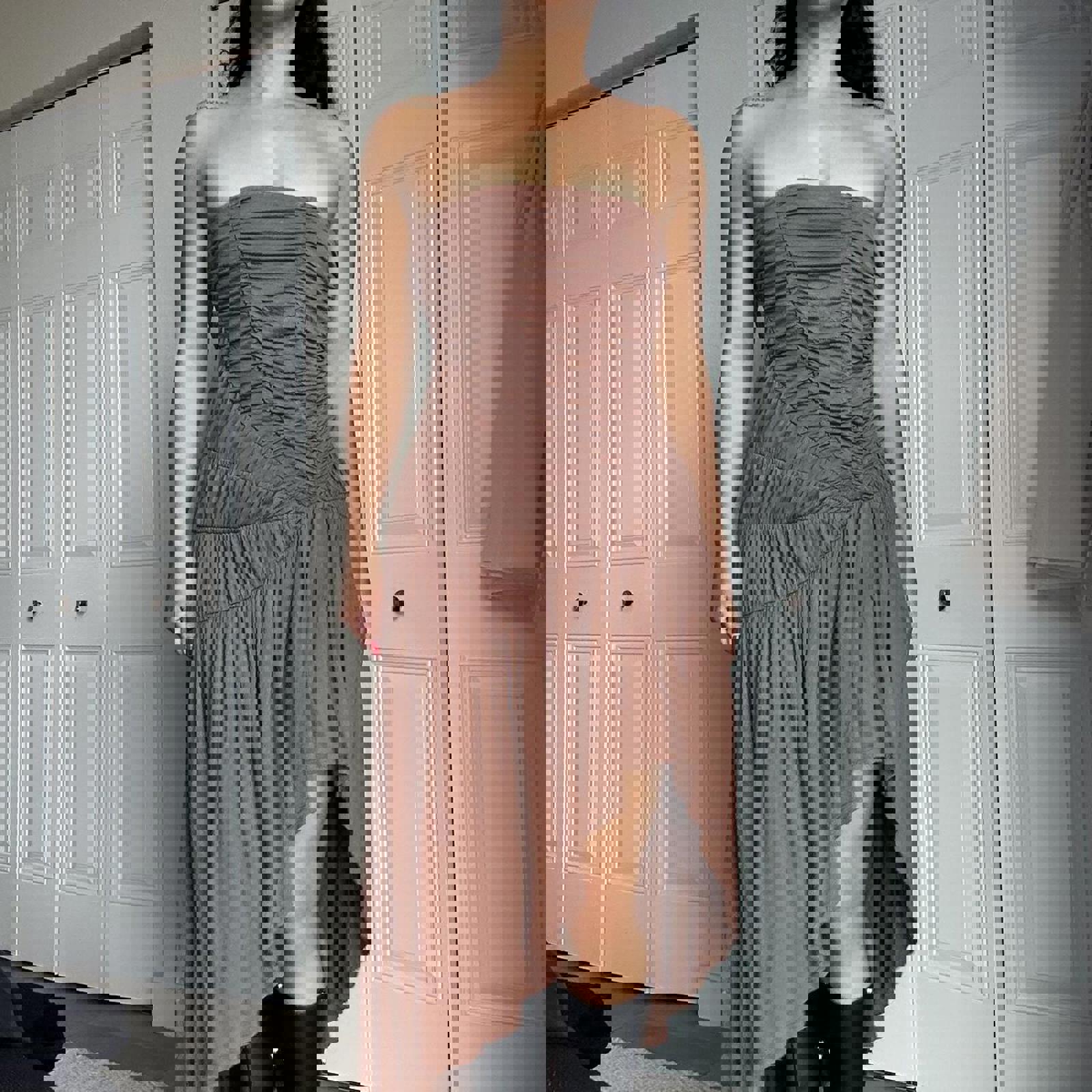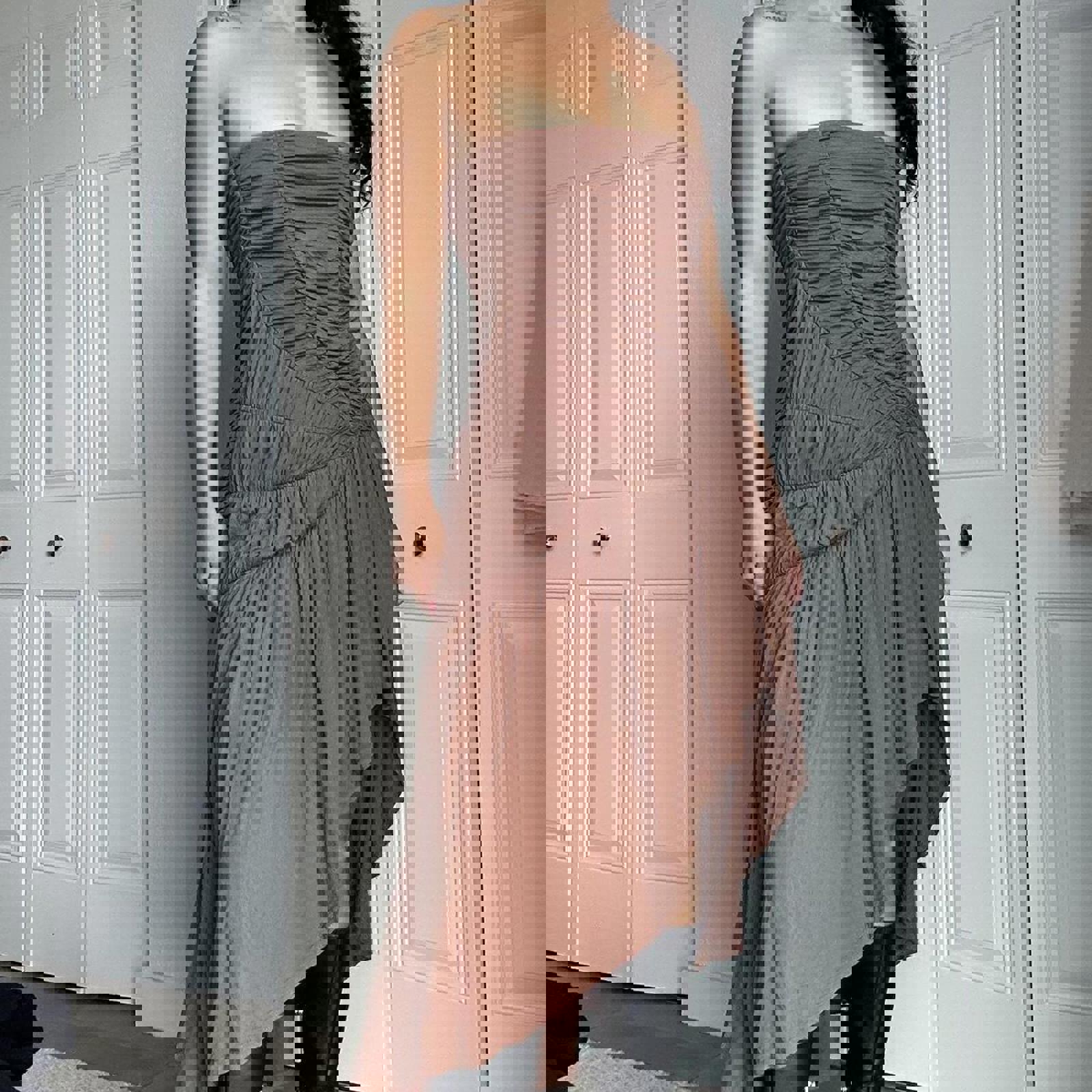 773. Celine Dean Brown Ruched Midi Dress with Asymmetrical Hem. Chocolate brown color in perfect condition. Has tons of stretch. It is a size medium shown on a size small. Measurements laying flat listed below.