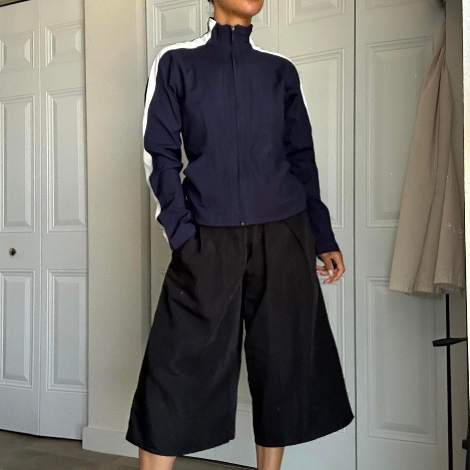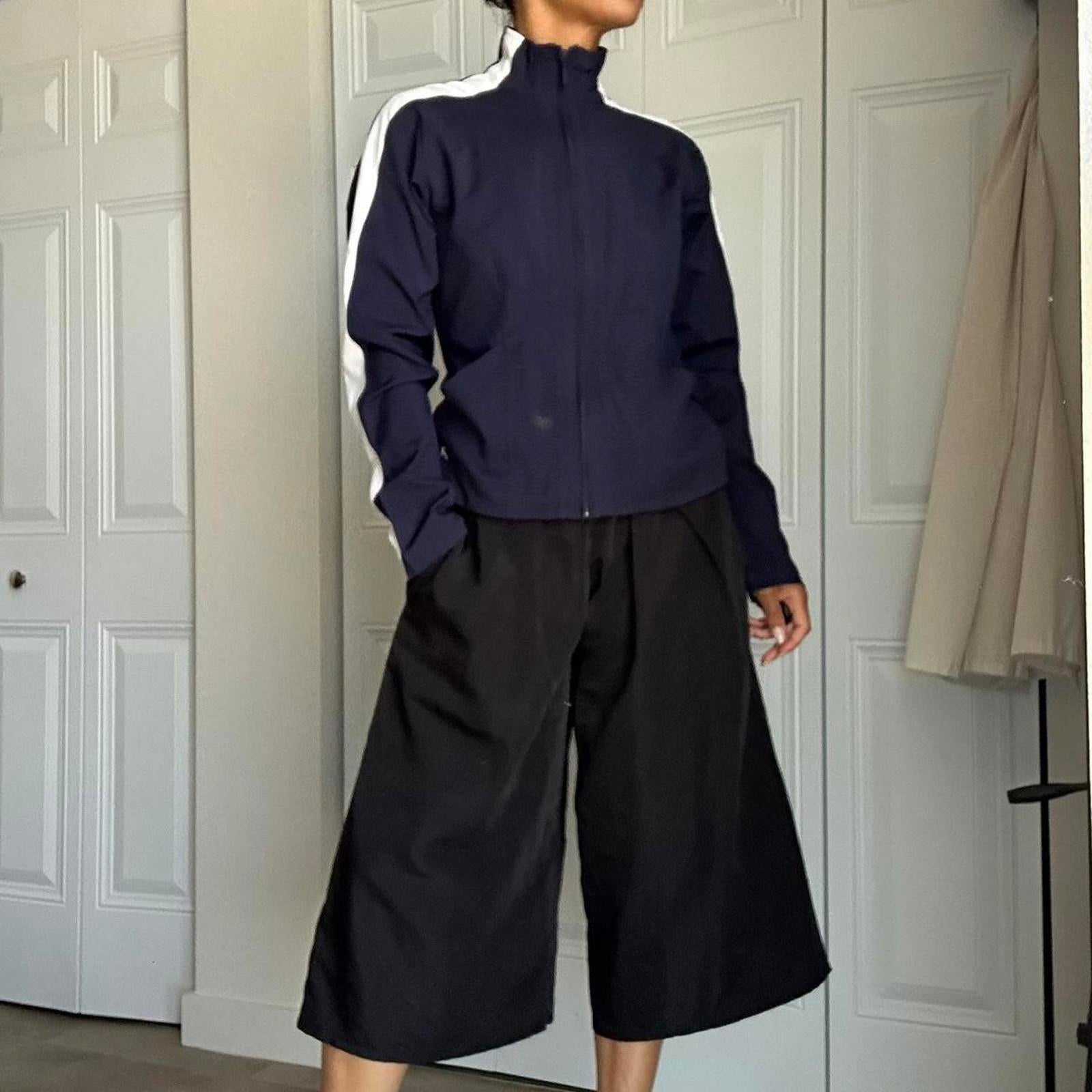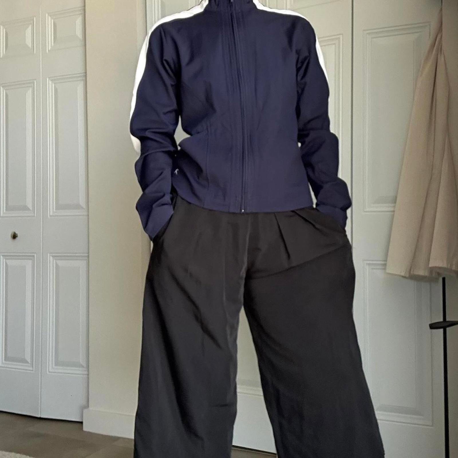 386. Dark blue track jacket in perfect condition white stripes down the side and intricate sewing detail all throughout. It is high neck, by Ativa
