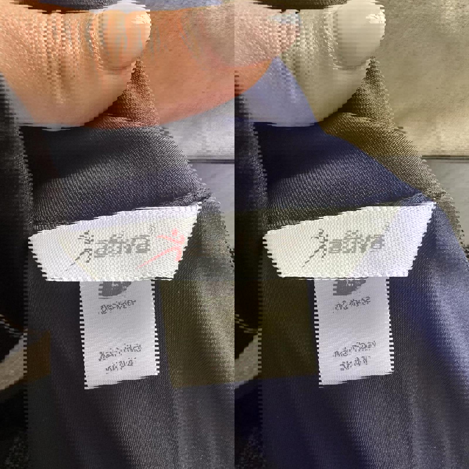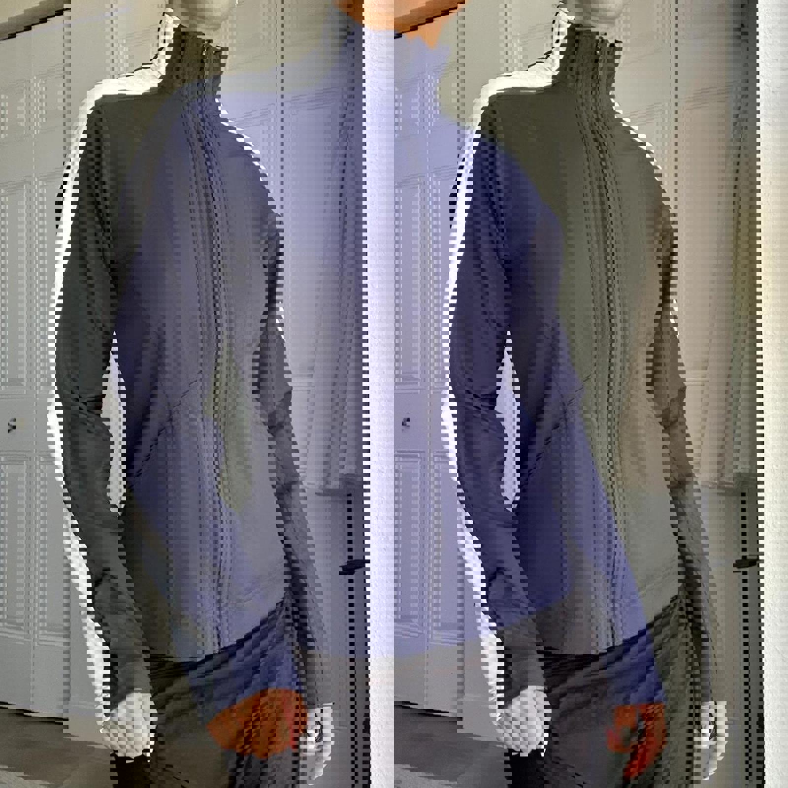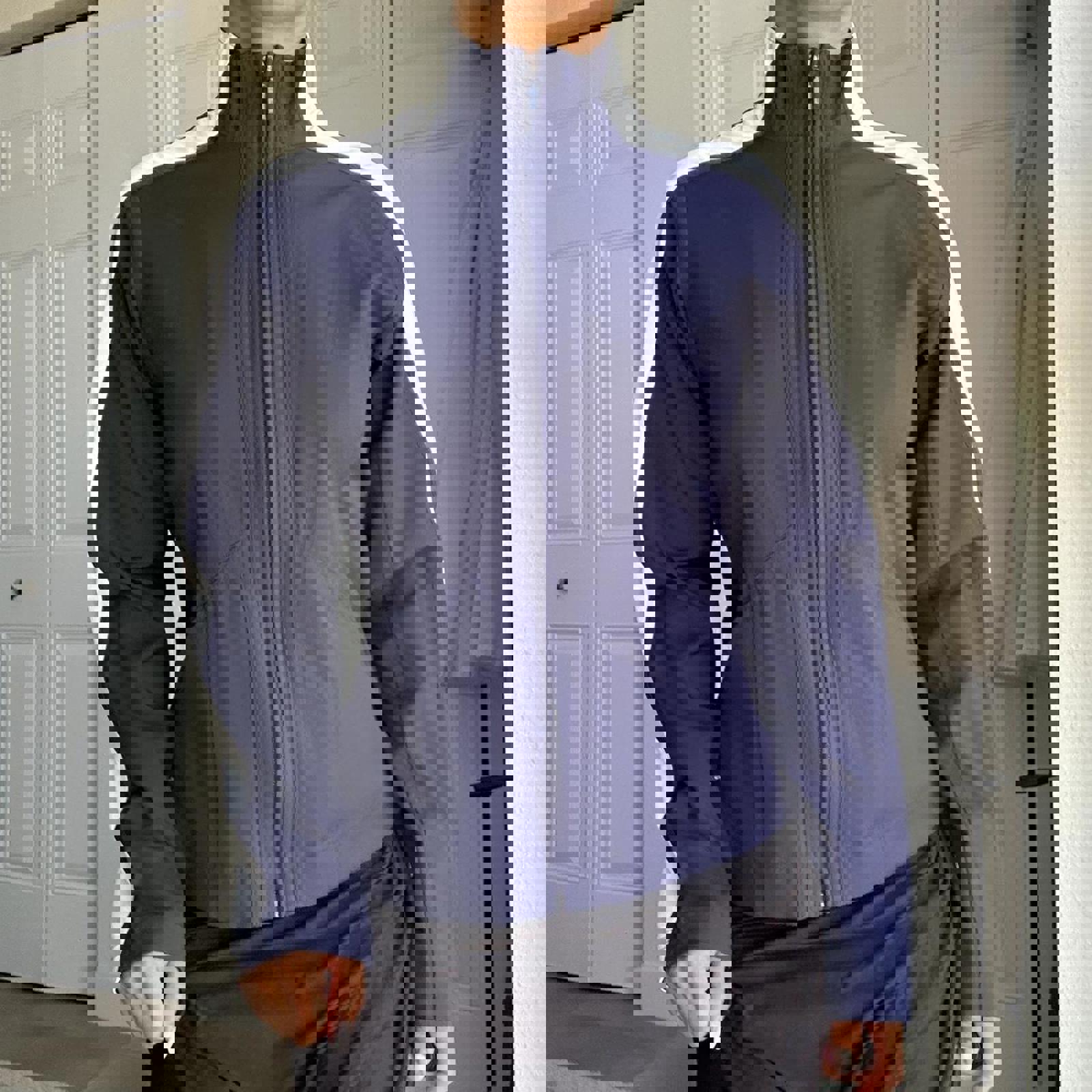 386. Dark blue track jacket in perfect condition white stripes down the side and intricate sewing detail all throughout. It is high neck, by Ativa