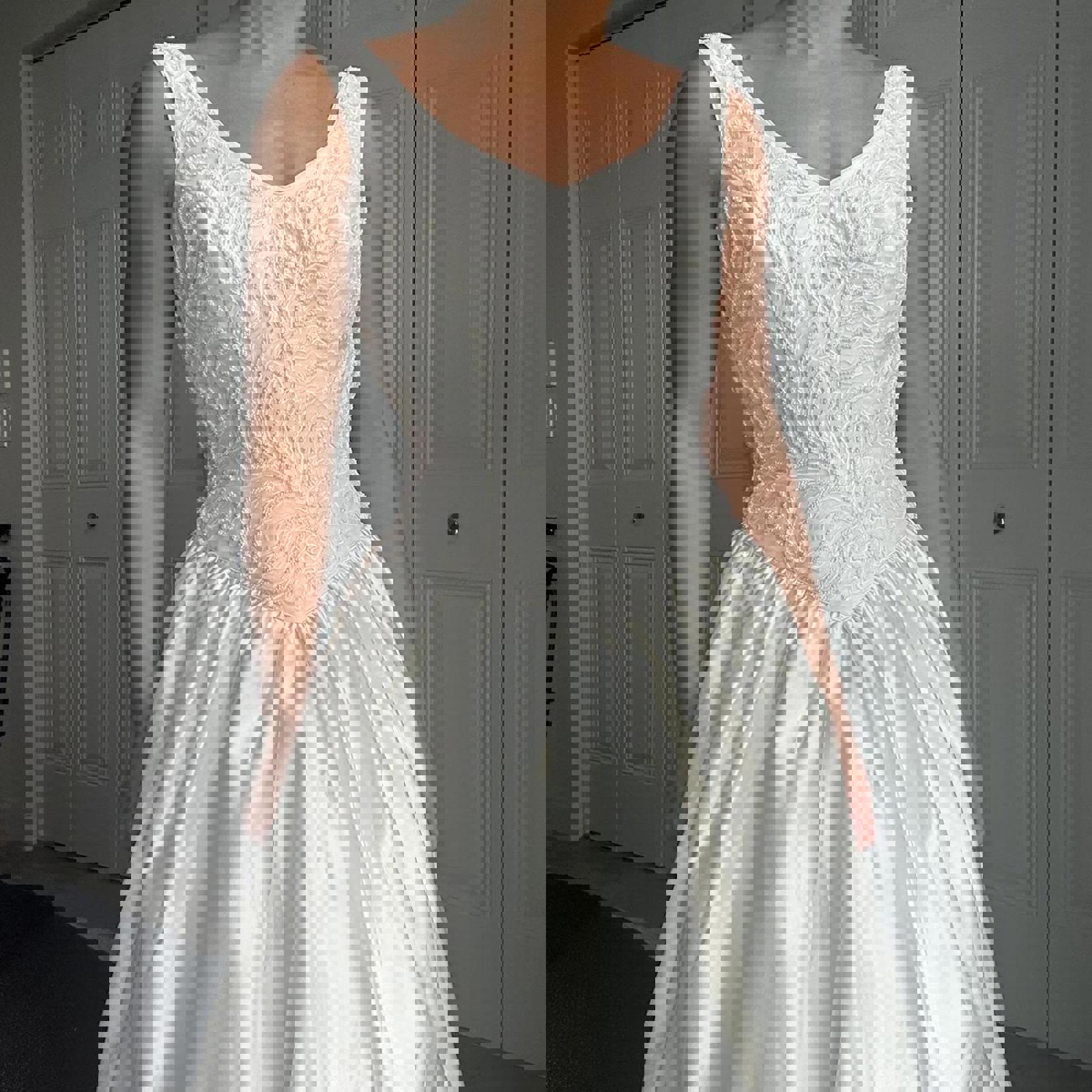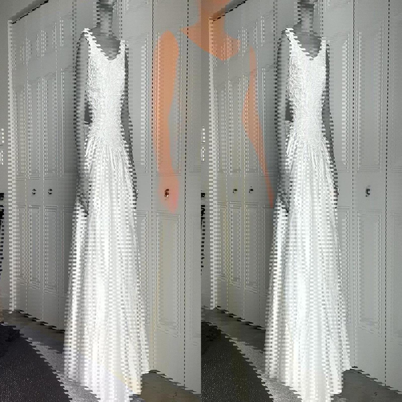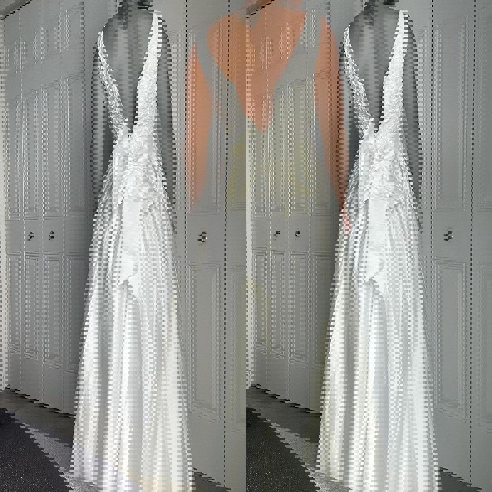792. Absolutely beautiful beaded corset wedding dress in great condition. Some makeup staining on the inside, but nothing that is visible. No brand tag and no size tag, but measurements are listed below.