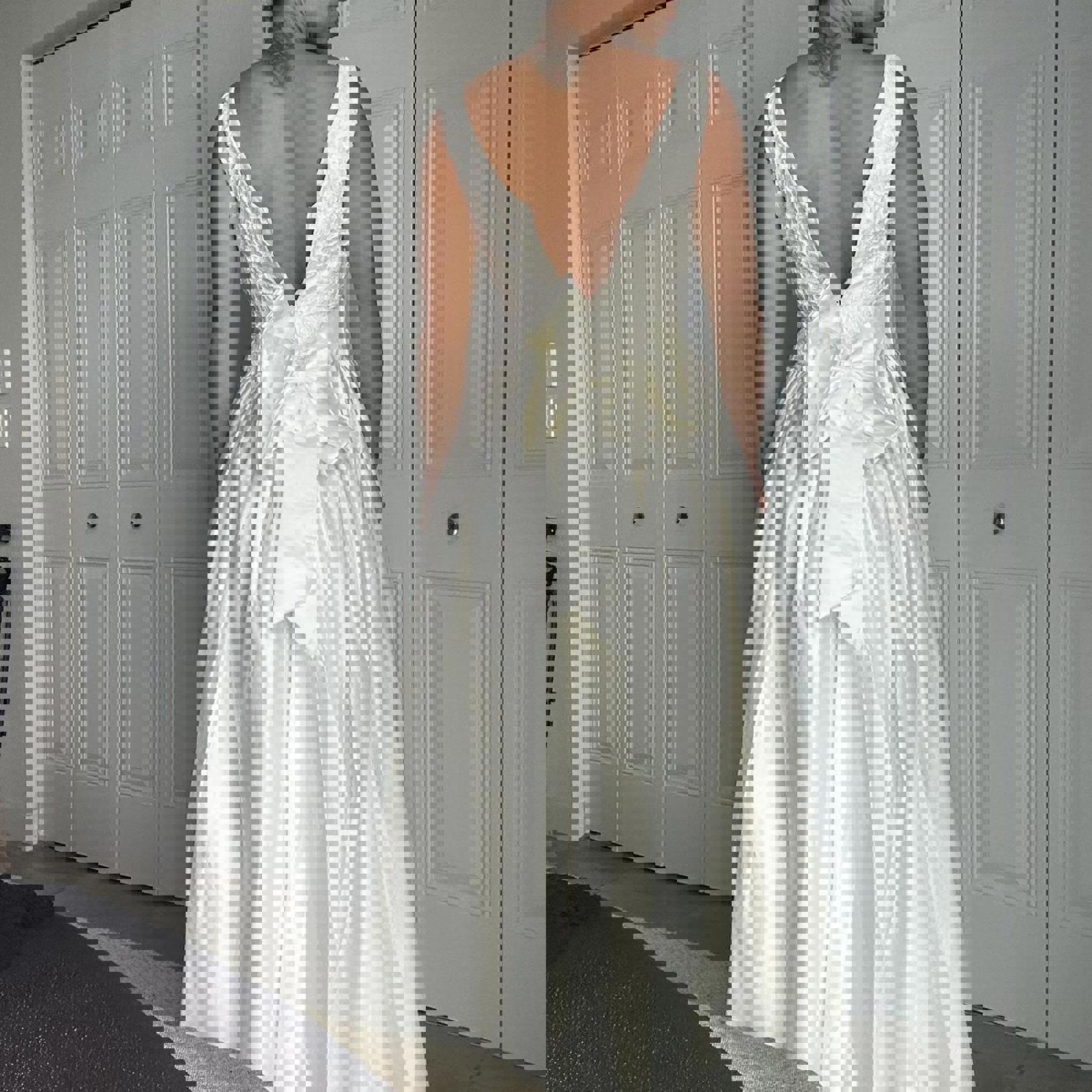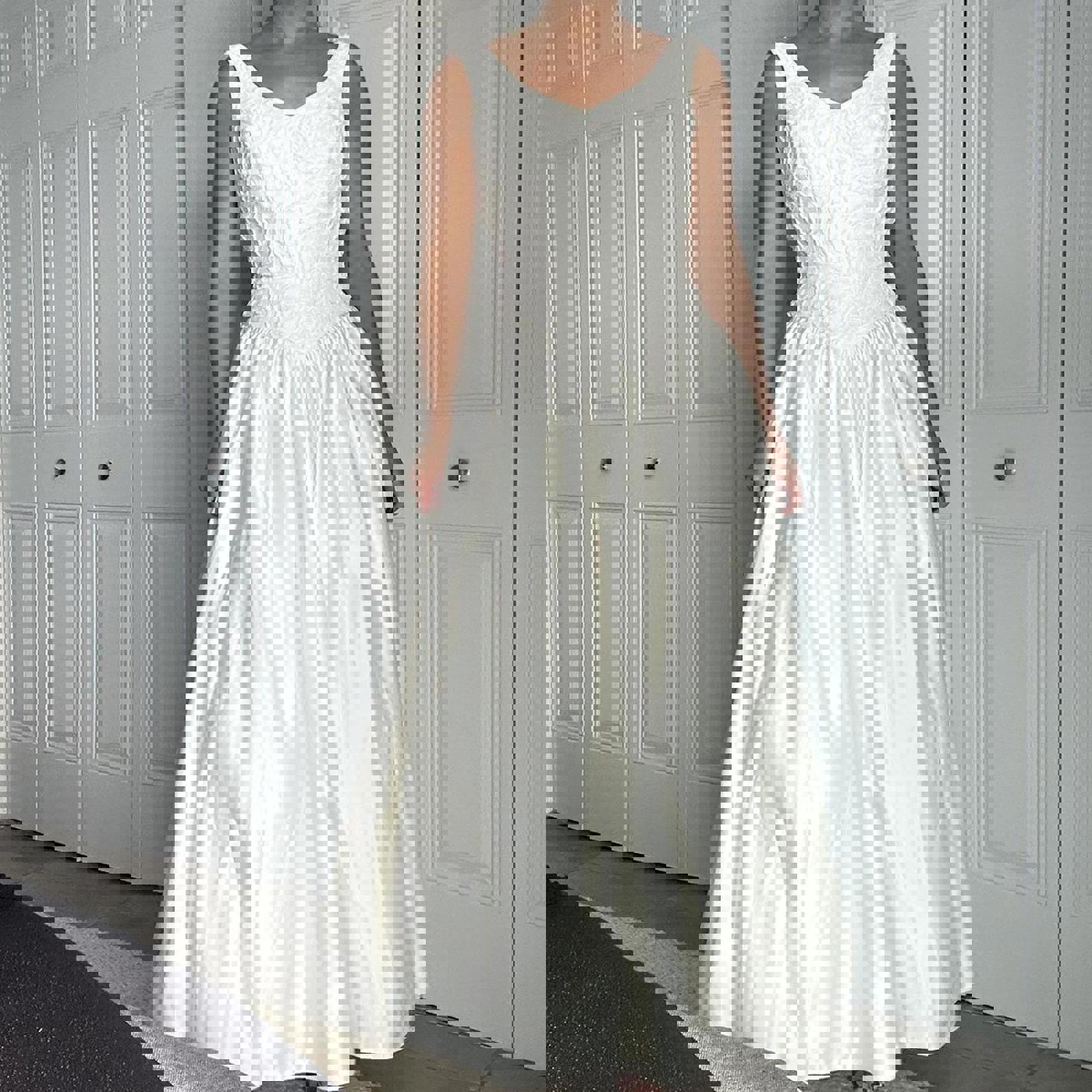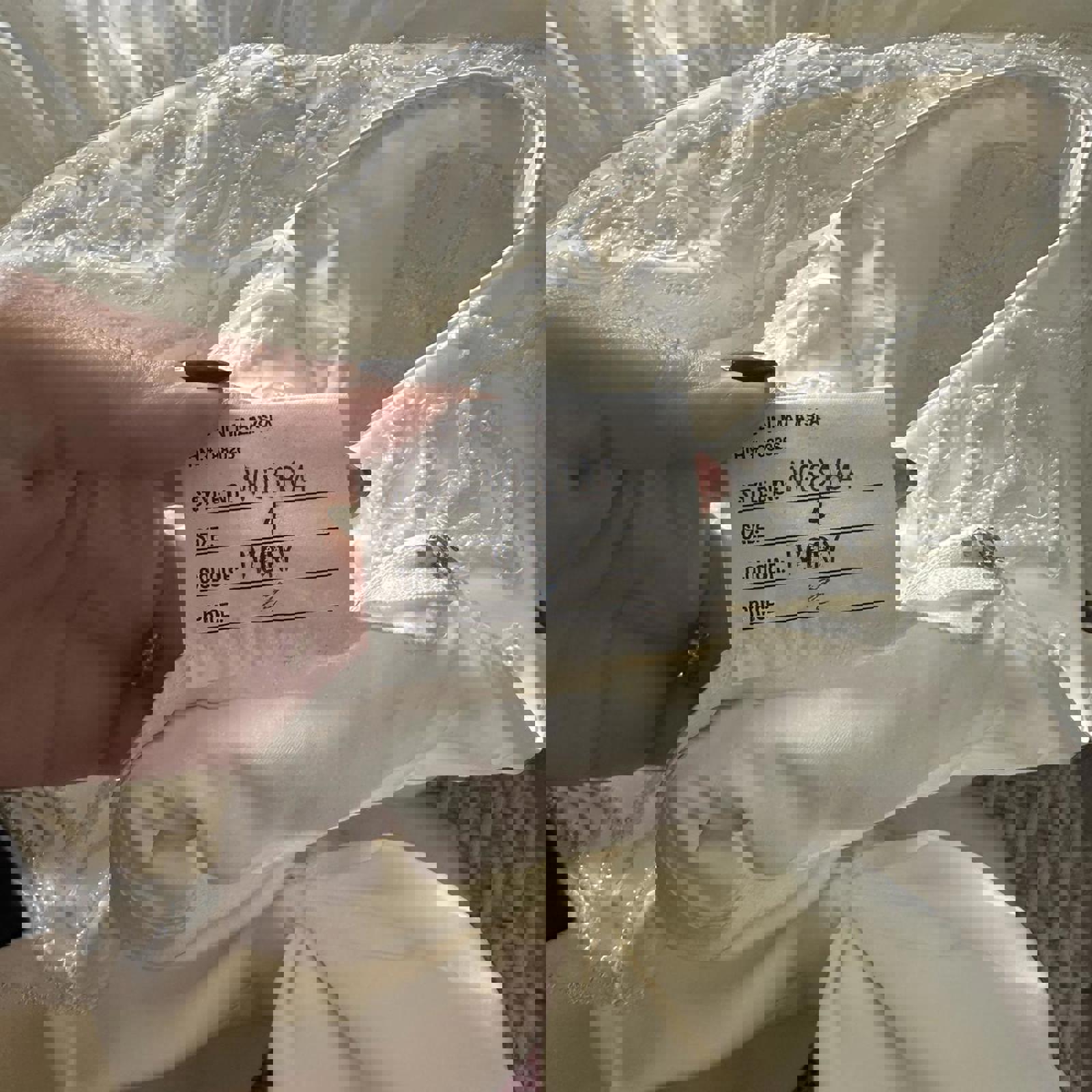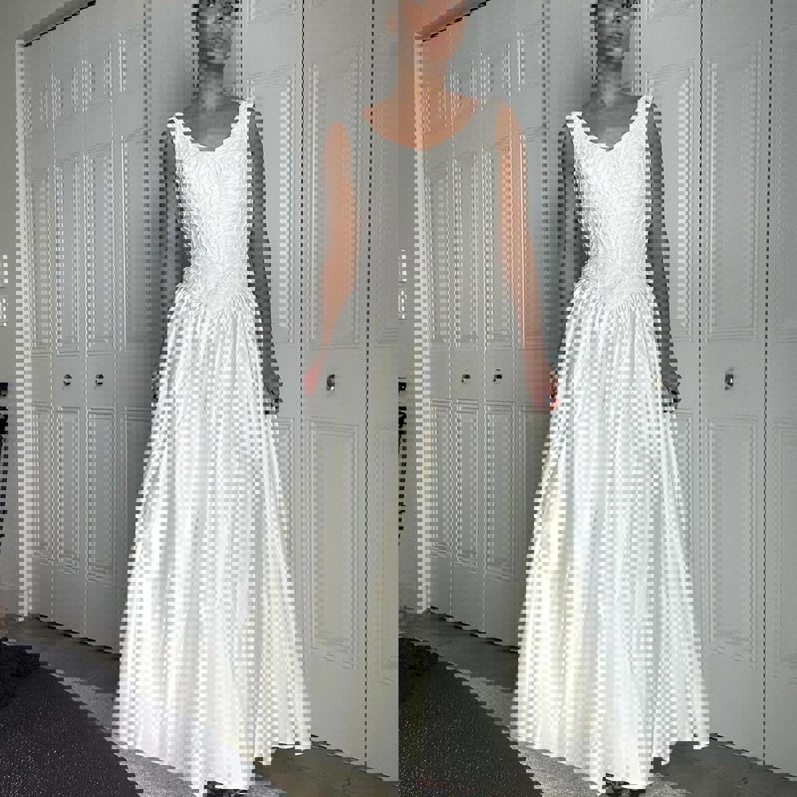 792. Absolutely beautiful beaded corset wedding dress in great condition. Some makeup staining on the inside, but nothing that is visible. No brand tag and no size tag, but measurements are listed below.