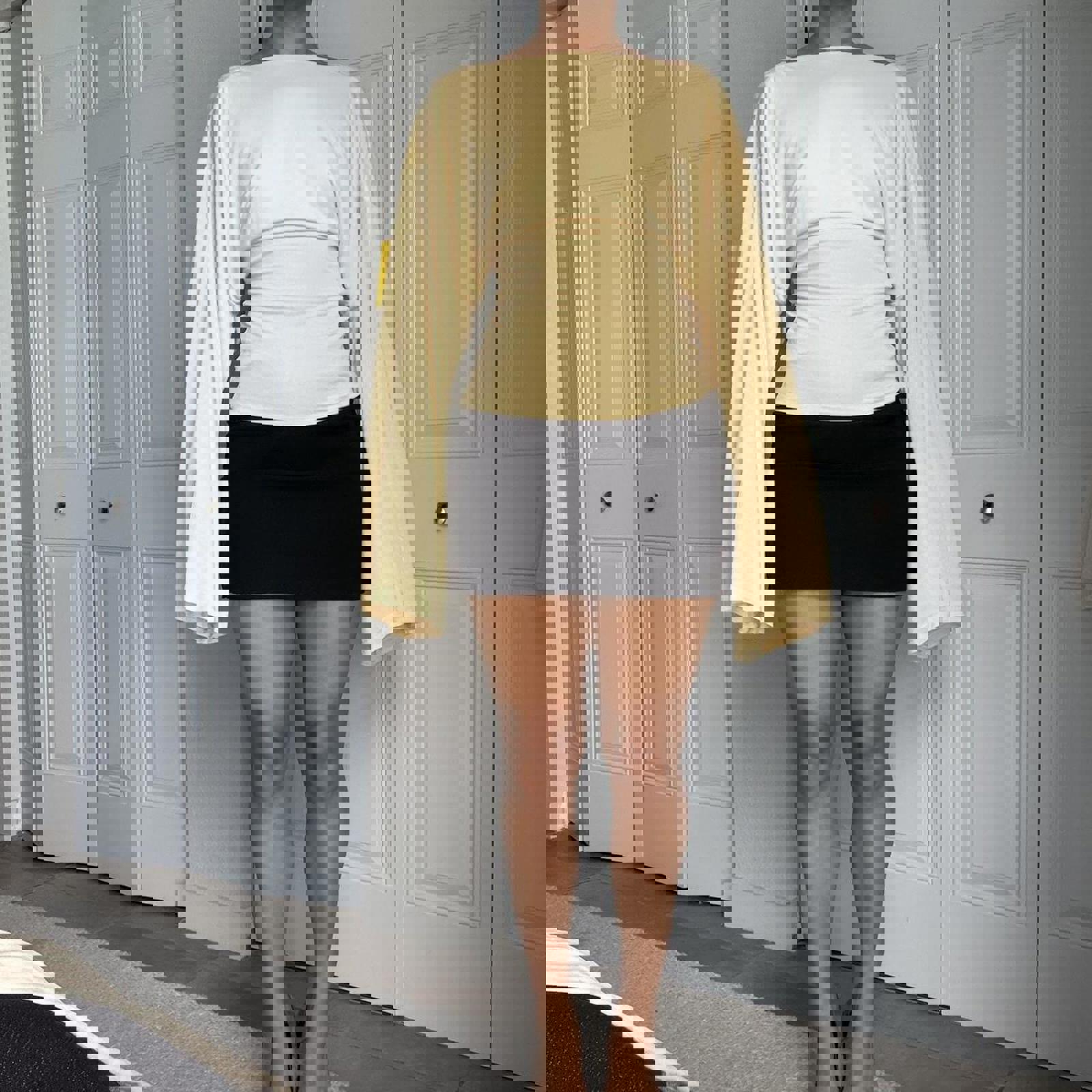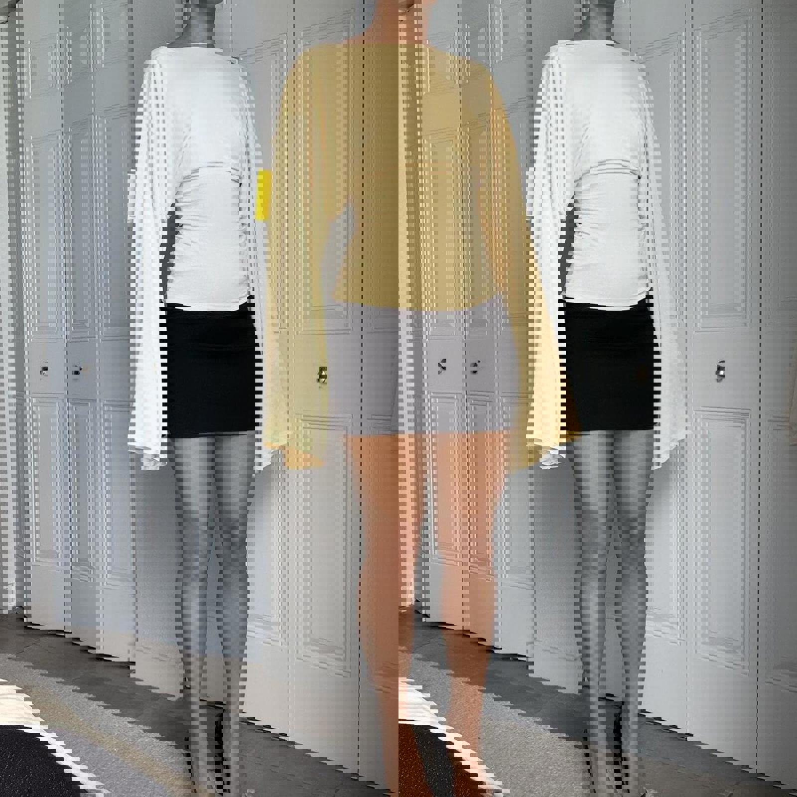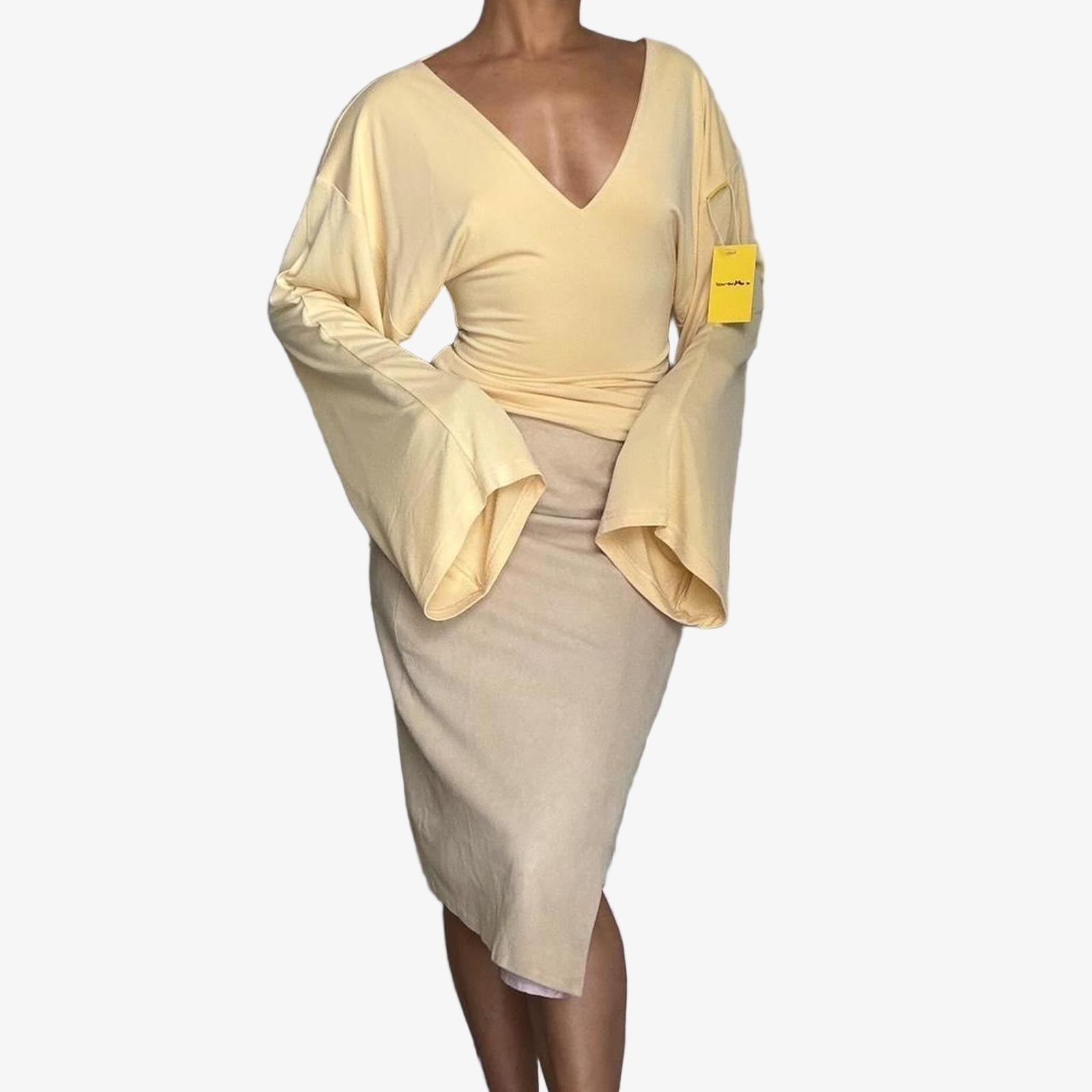 900. Akino yellow multi-way top shown worn forward and backwards. Perfect condition, tags are still attached, never been worn. Brand is based in London, has beautiful long wide sleeves. Always get complimented when I wear this top In black. beautiful butter yellow color.