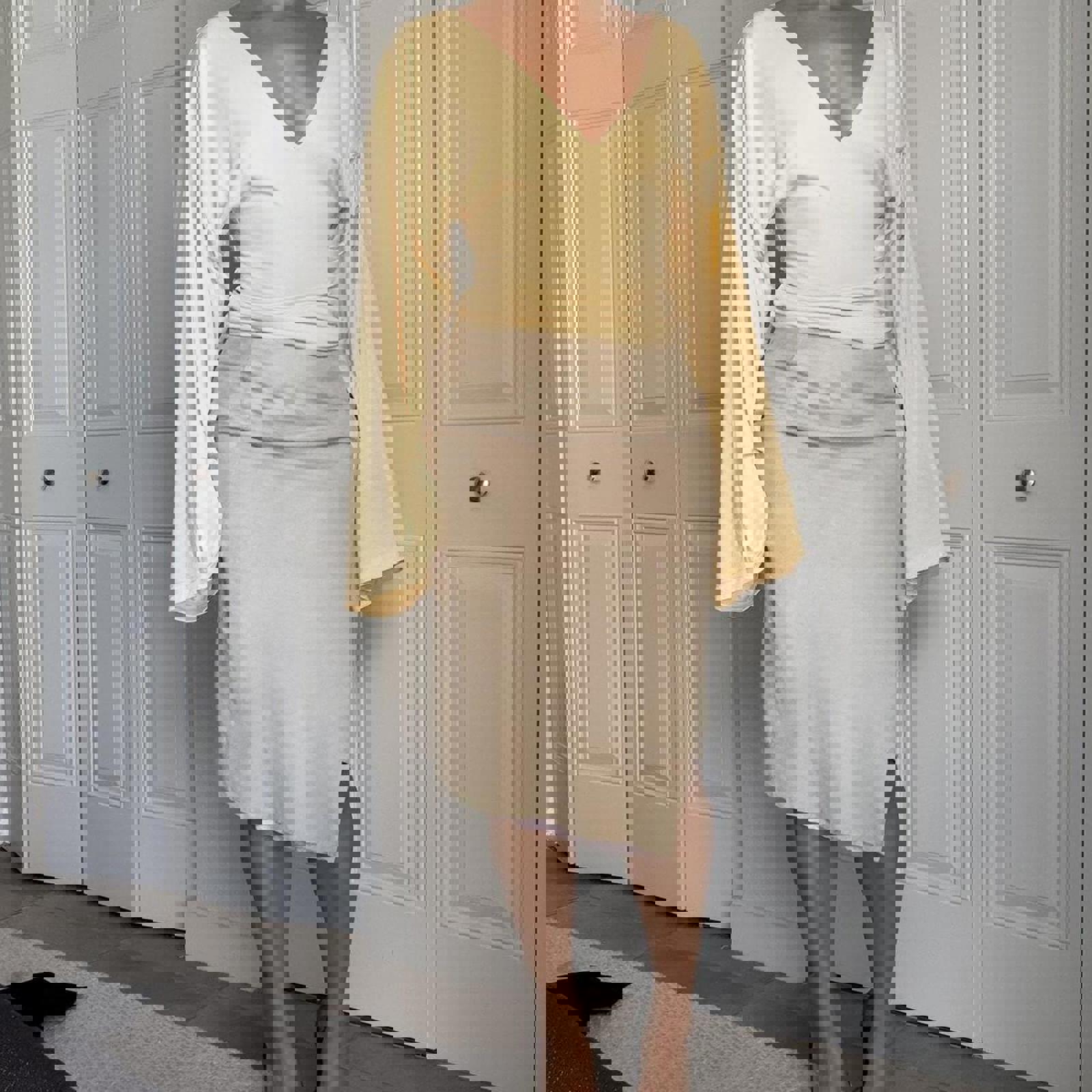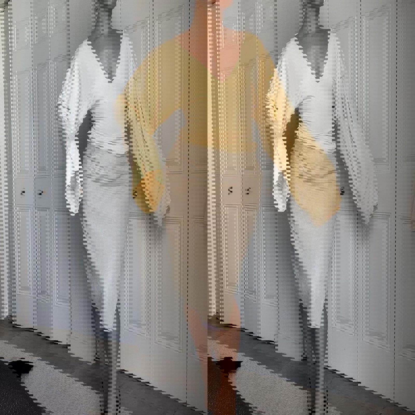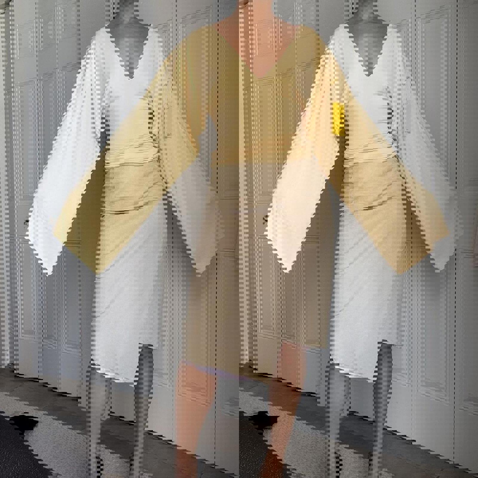 900. Akino yellow multi-way top shown worn forward and backwards. Perfect condition, tags are still attached, never been worn. Brand is based in London, has beautiful long wide sleeves. Always get complimented when I wear this top In black. beautiful butter yellow color.