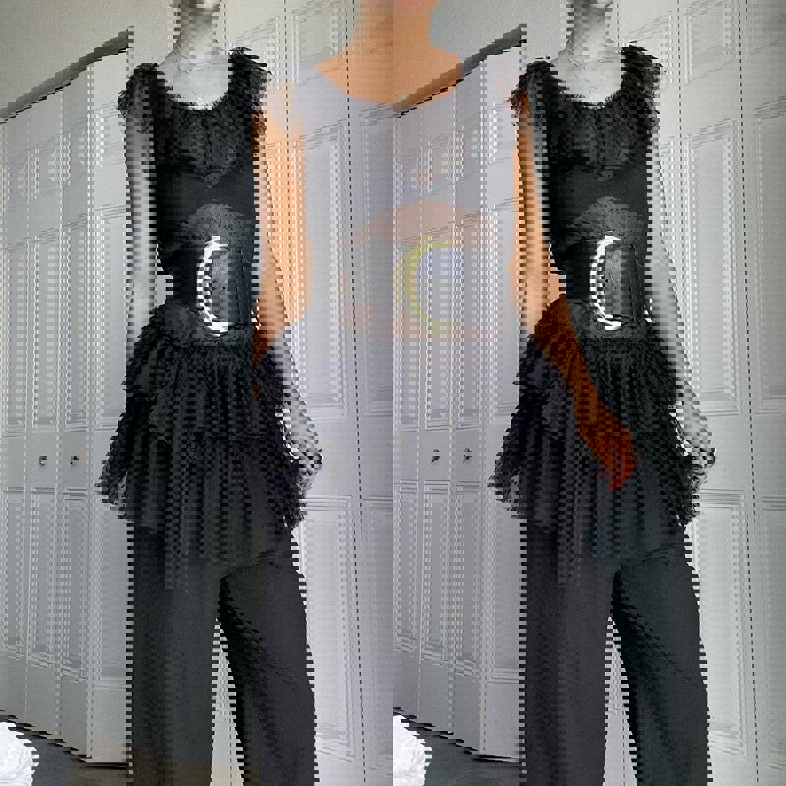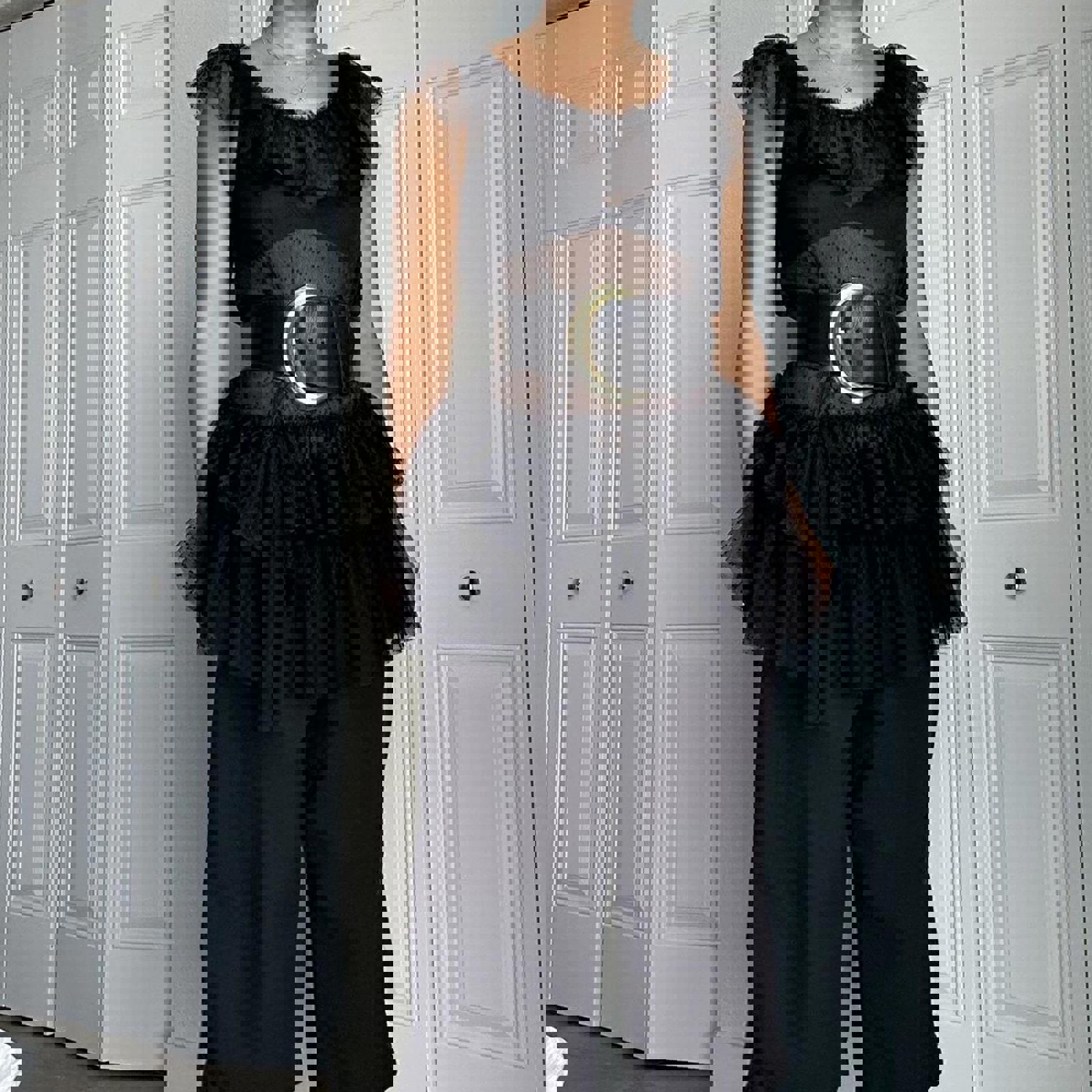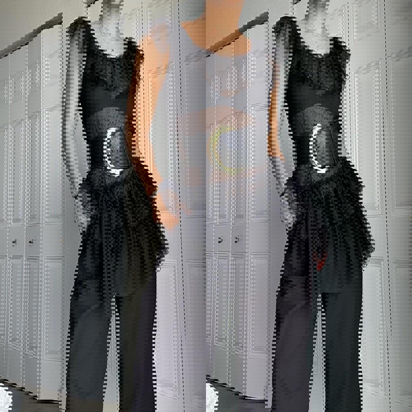 572. Xii collection Black mesh ruffle top with lace details . Shown styled with a belt which is not included