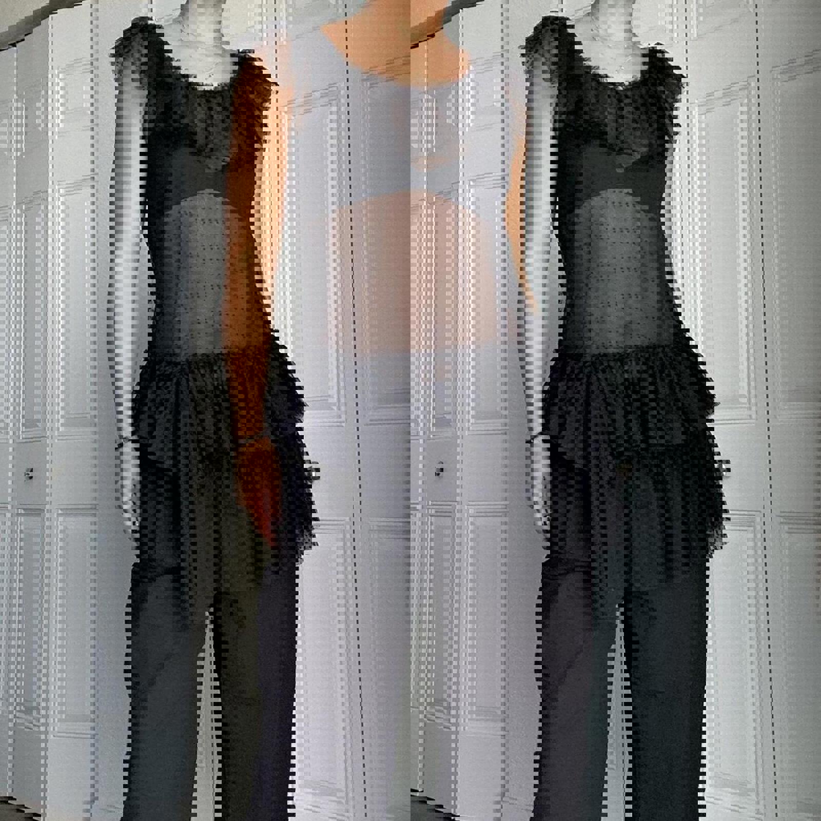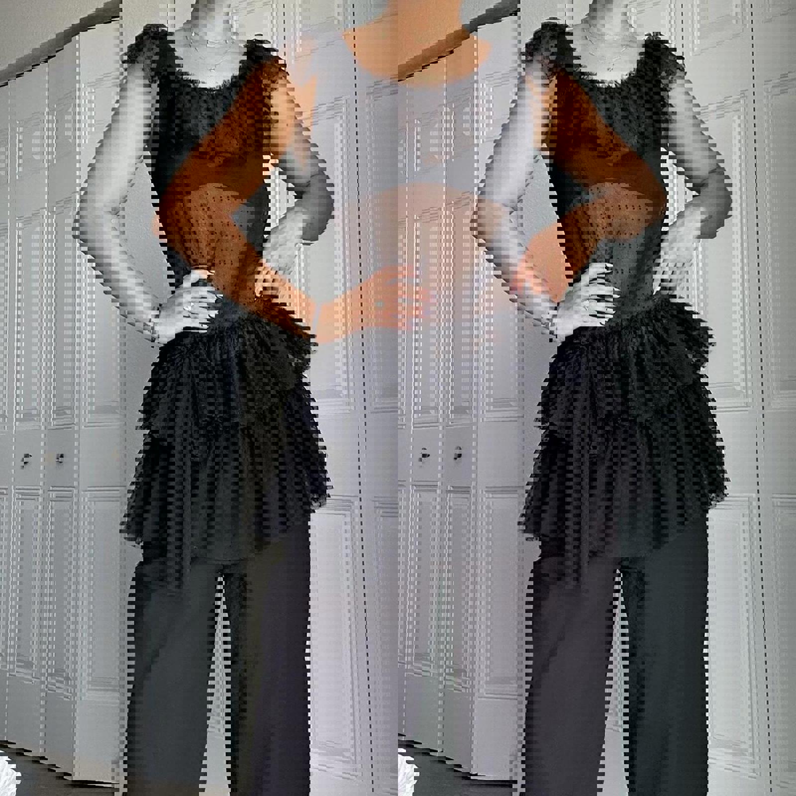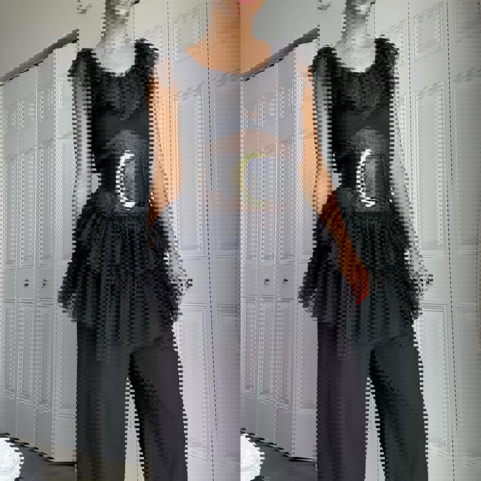 572. Xii collection Black mesh ruffle top with lace details . Shown styled with a belt which is not included
