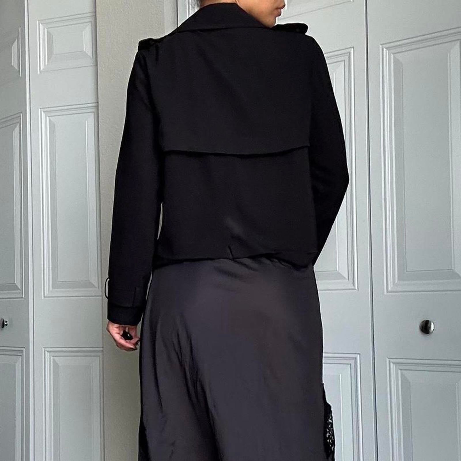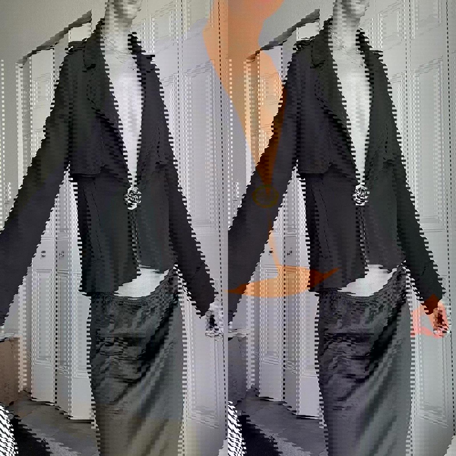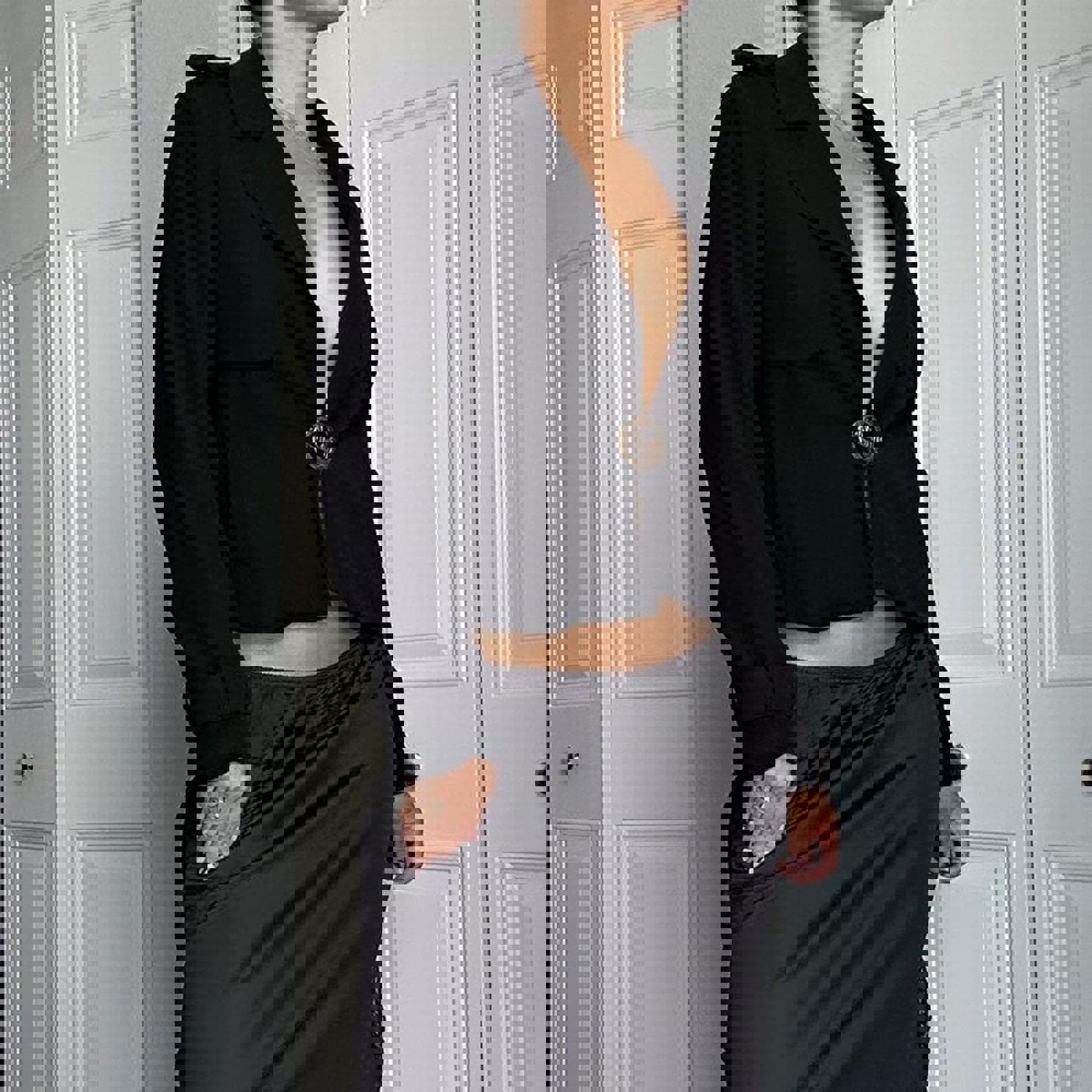 562. Zara cropped black jacket in an oversized size small. Almost like a short trench. I show it styled two ways, one with a pin and one with a sheer top underneath both not included