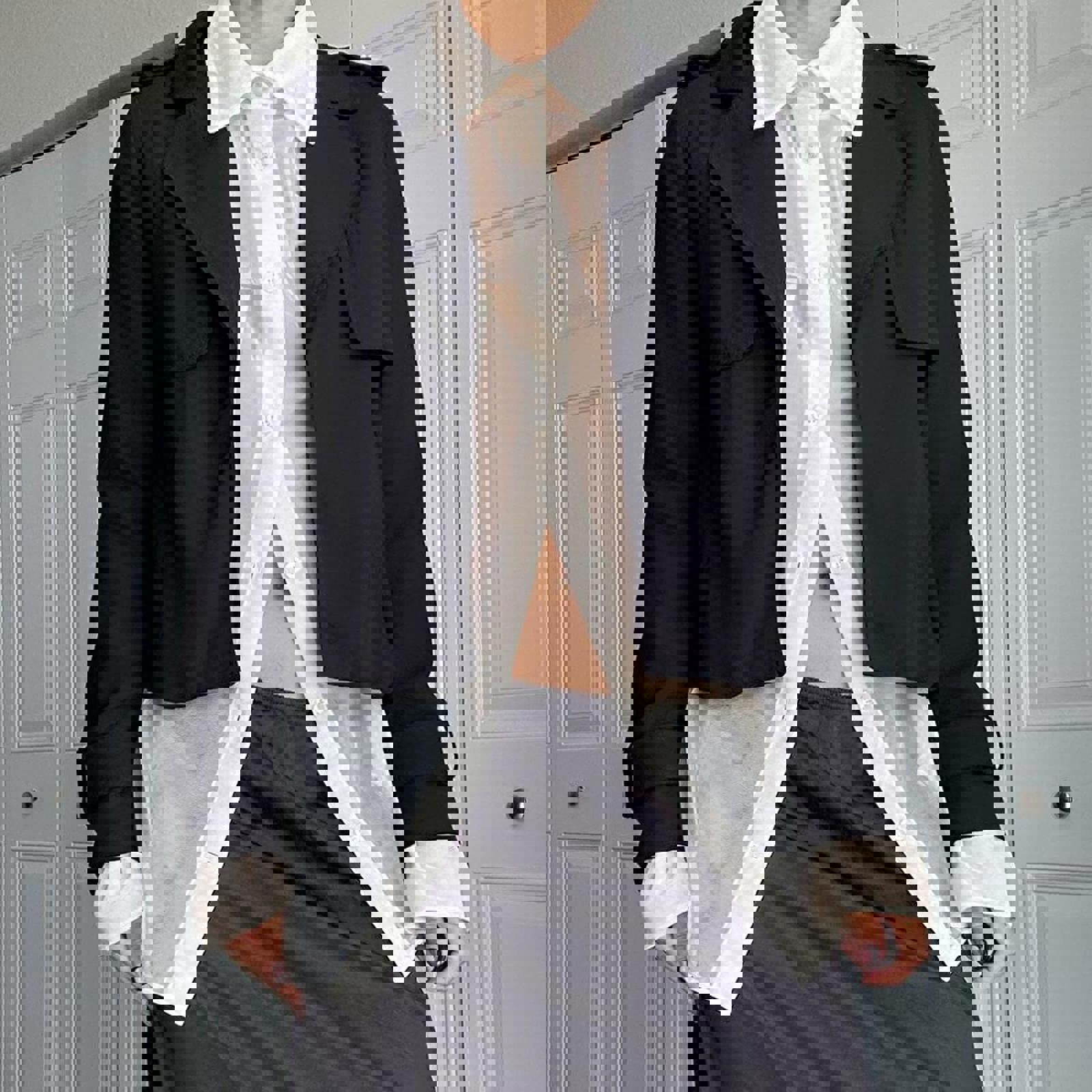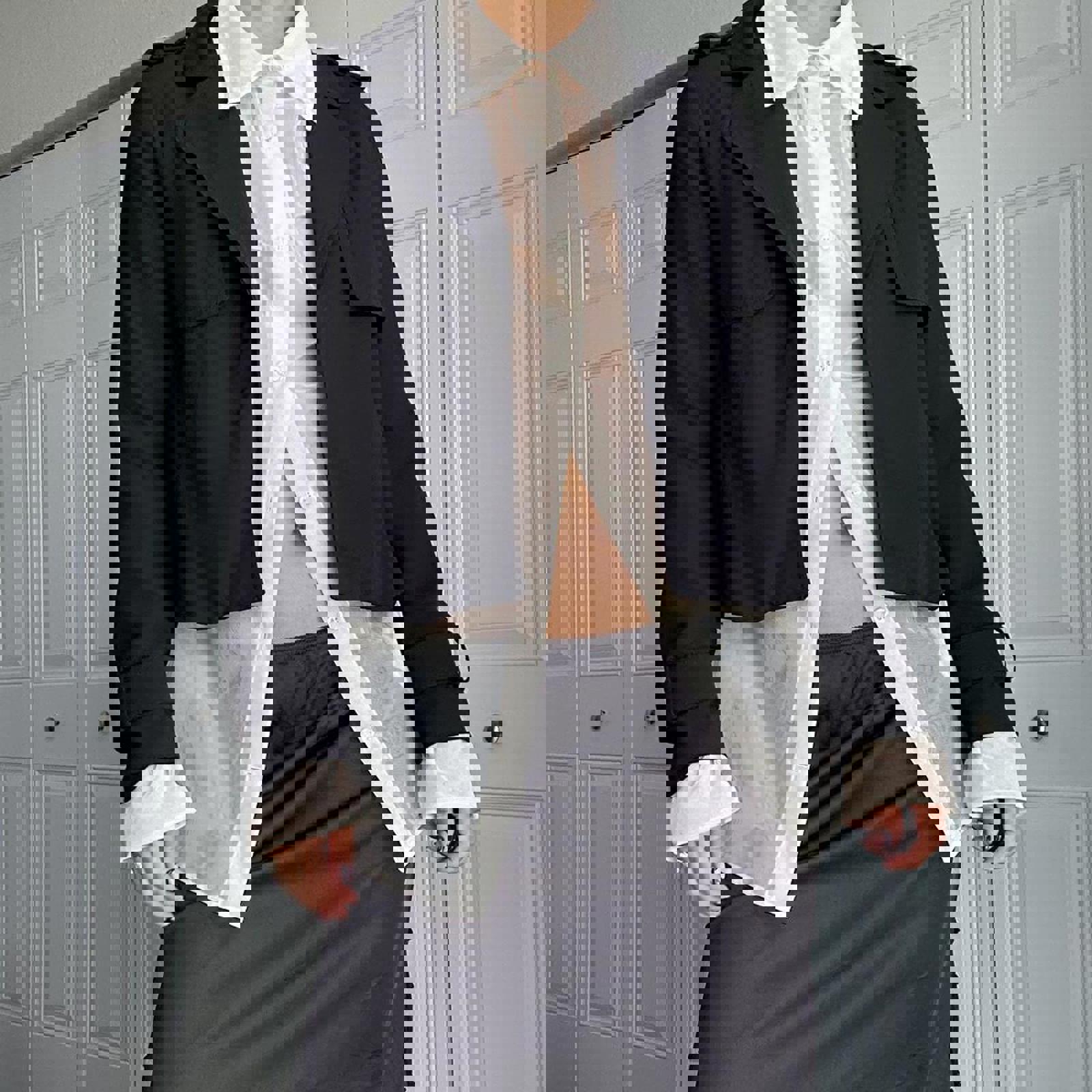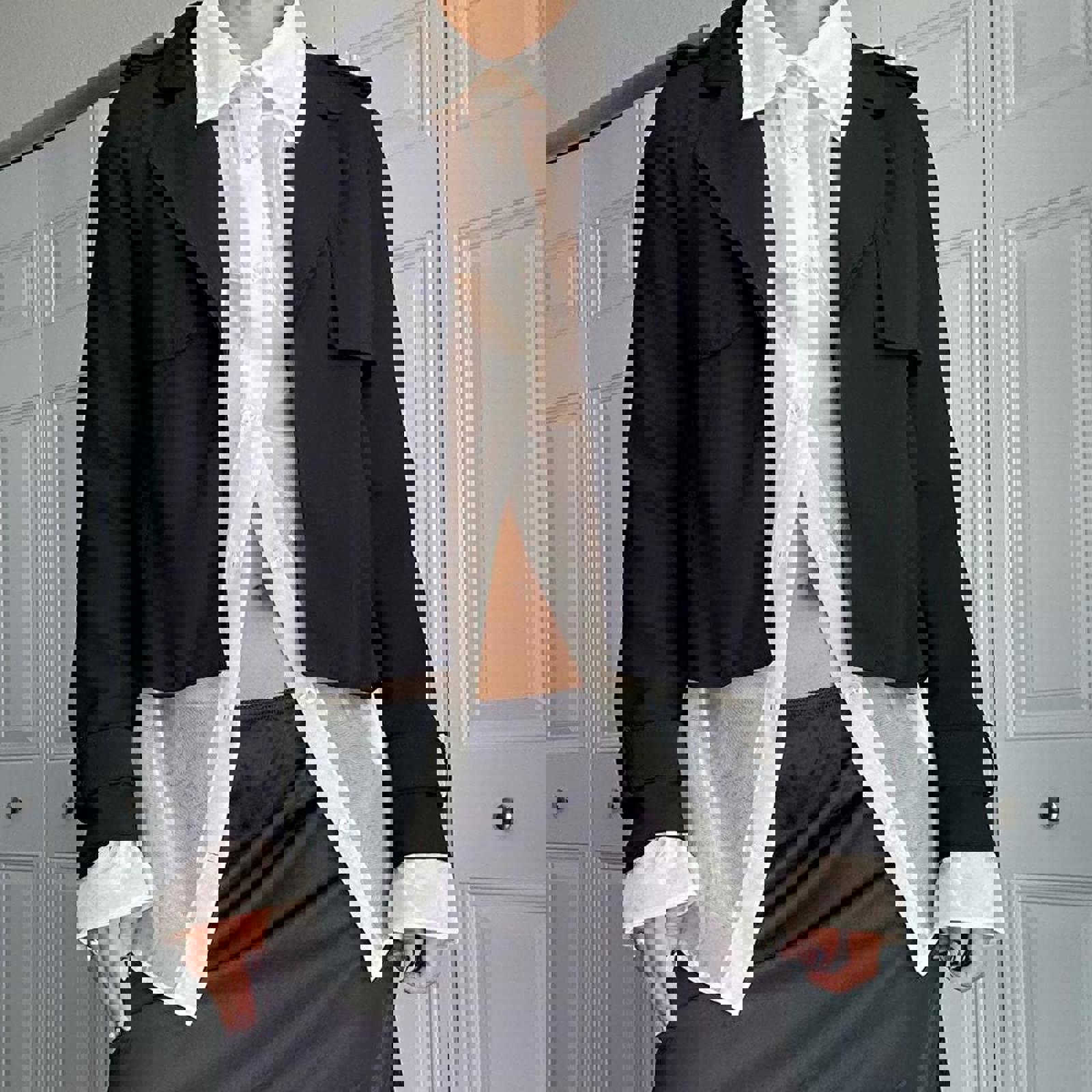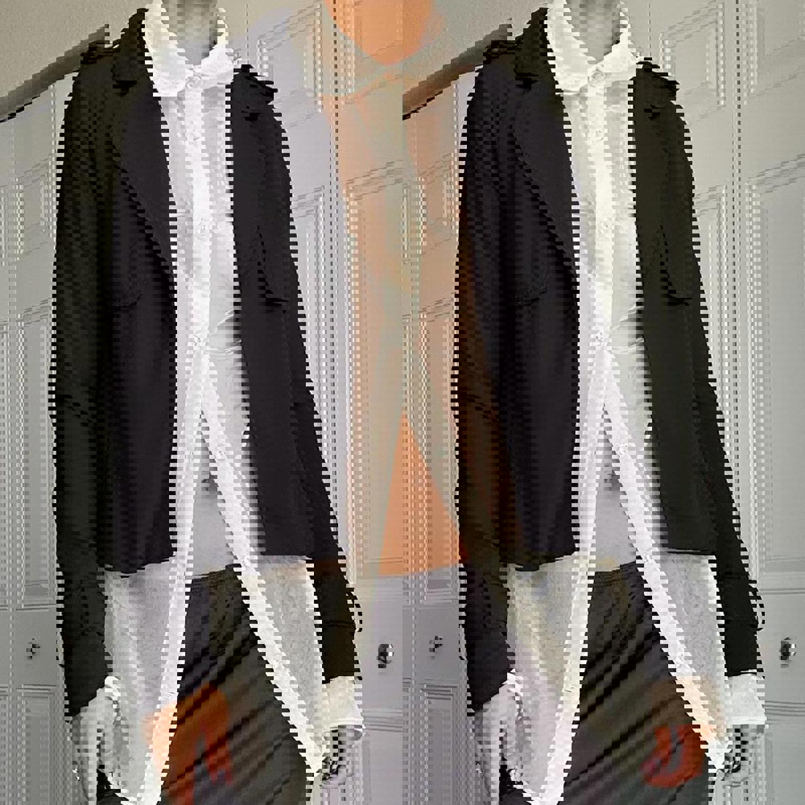 562. Zara cropped black jacket in an oversized size small. Almost like a short trench. I show it styled two ways, one with a pin and one with a sheer top underneath both not included